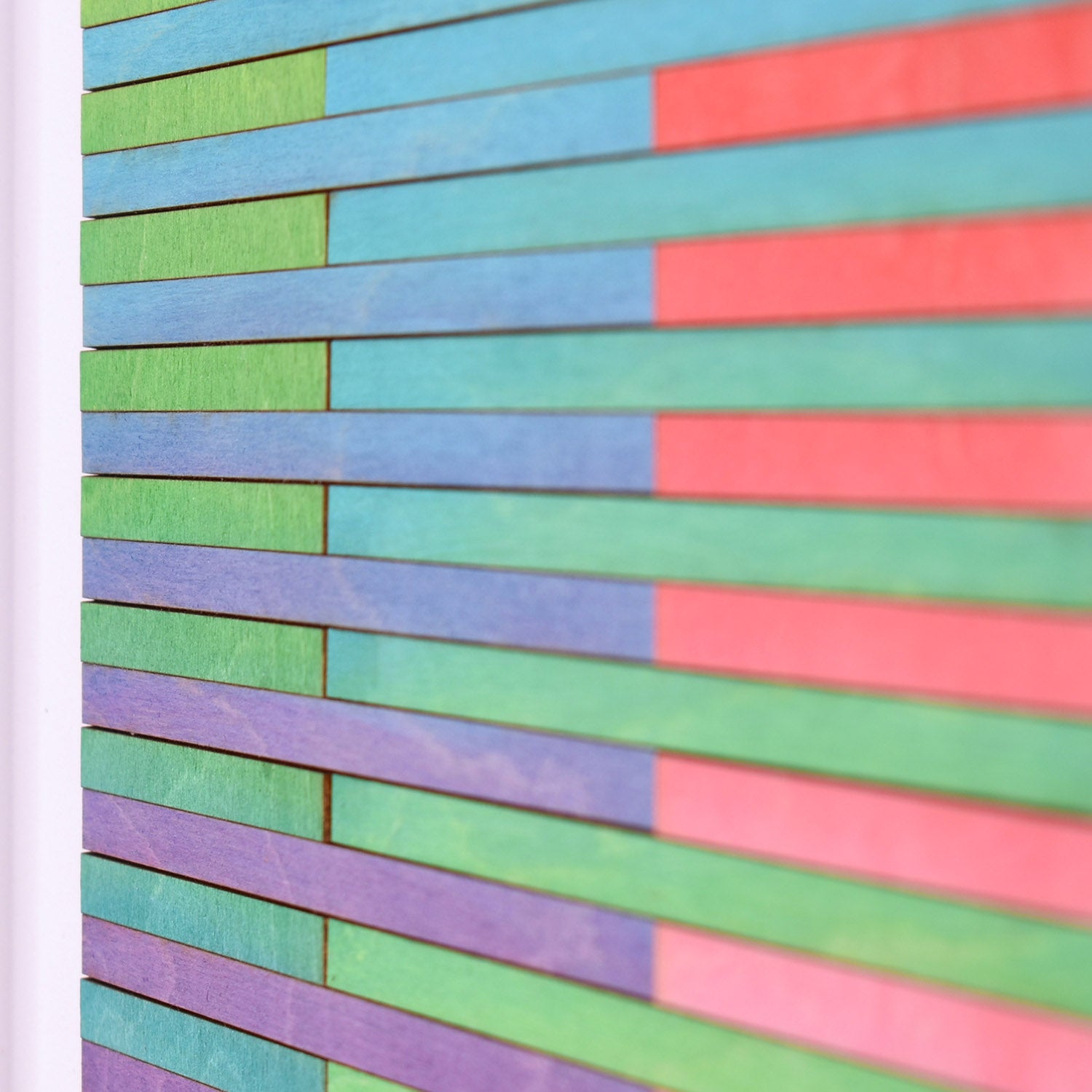 For her stripe collection, Amelia paints birch wood panels using vibrant inks and acrylics and blends them to achieve an ombre. Each panel painting is then cut into slim sections and reassembled, intersected with other ombre paintings to create a bold interaction of colours.