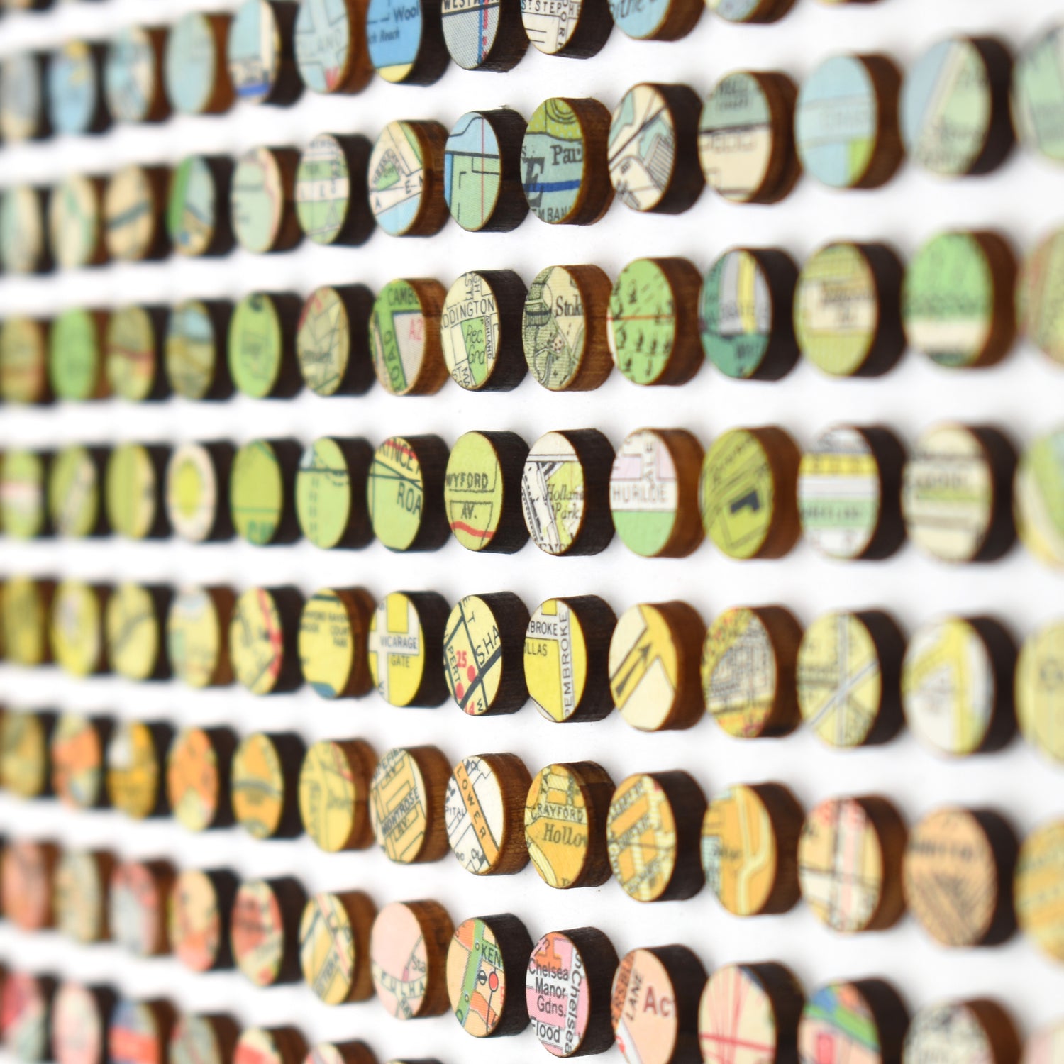 The artworks are created using a unique decoupage process of hand bonding each piece of map on to birch wood before cutting them into the 3D dots used in each original composition.