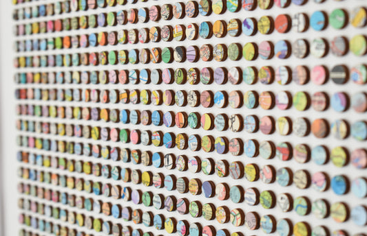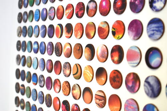 The artworks are created using a unique decoupage process of hand bonding each piece of map on to birch wood before cutting them into the 3D dots used in each original composition.