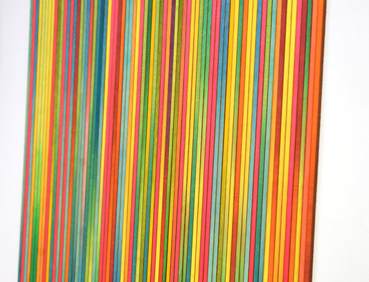 For her stripe collection, Amelia paints birch wood panels using vibrant inks and acrylics and blends them to achieve an ombre. Each panel painting is then cut into slim sections and reassembled, intersected with other ombre paintings to create a bold interaction of colours.