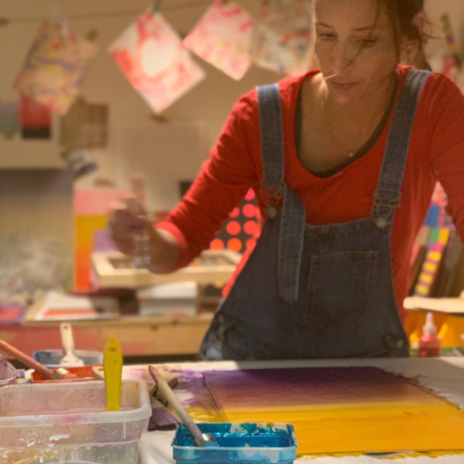 Amelia is known for her meticulous and unique process used to create her distinctive dot and stripe artworks.