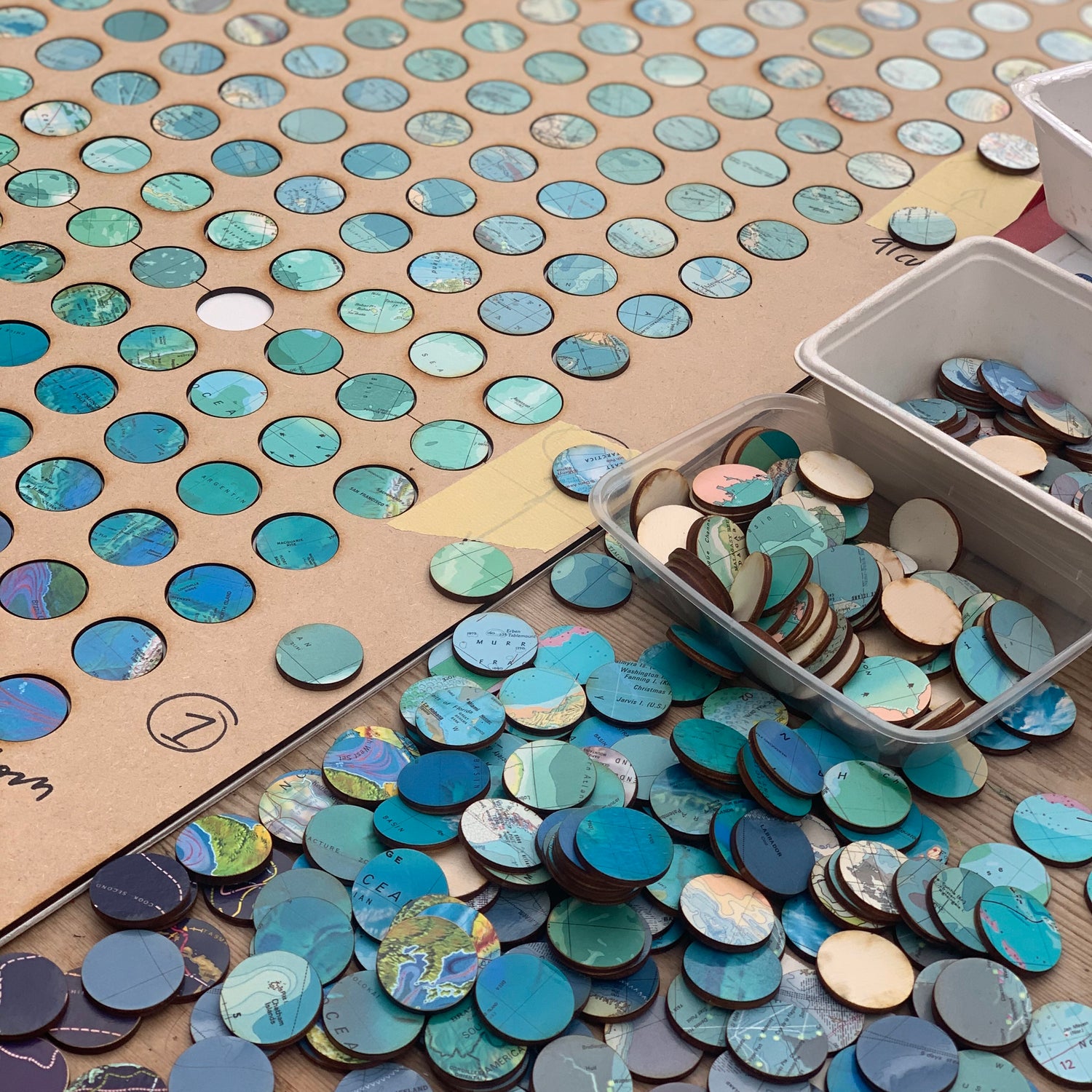 Amelia painstakingly selects each projects custom locations from the map collection simultaneously working to a bespoke colour palette and checking for composition and desired scale. Maps are hand cut and bonded to birch wood sheets which are laser cut into dots. The artworks are mathematically precise in their arrangement and the dots are ordered to create delicate and striking blends of colour.