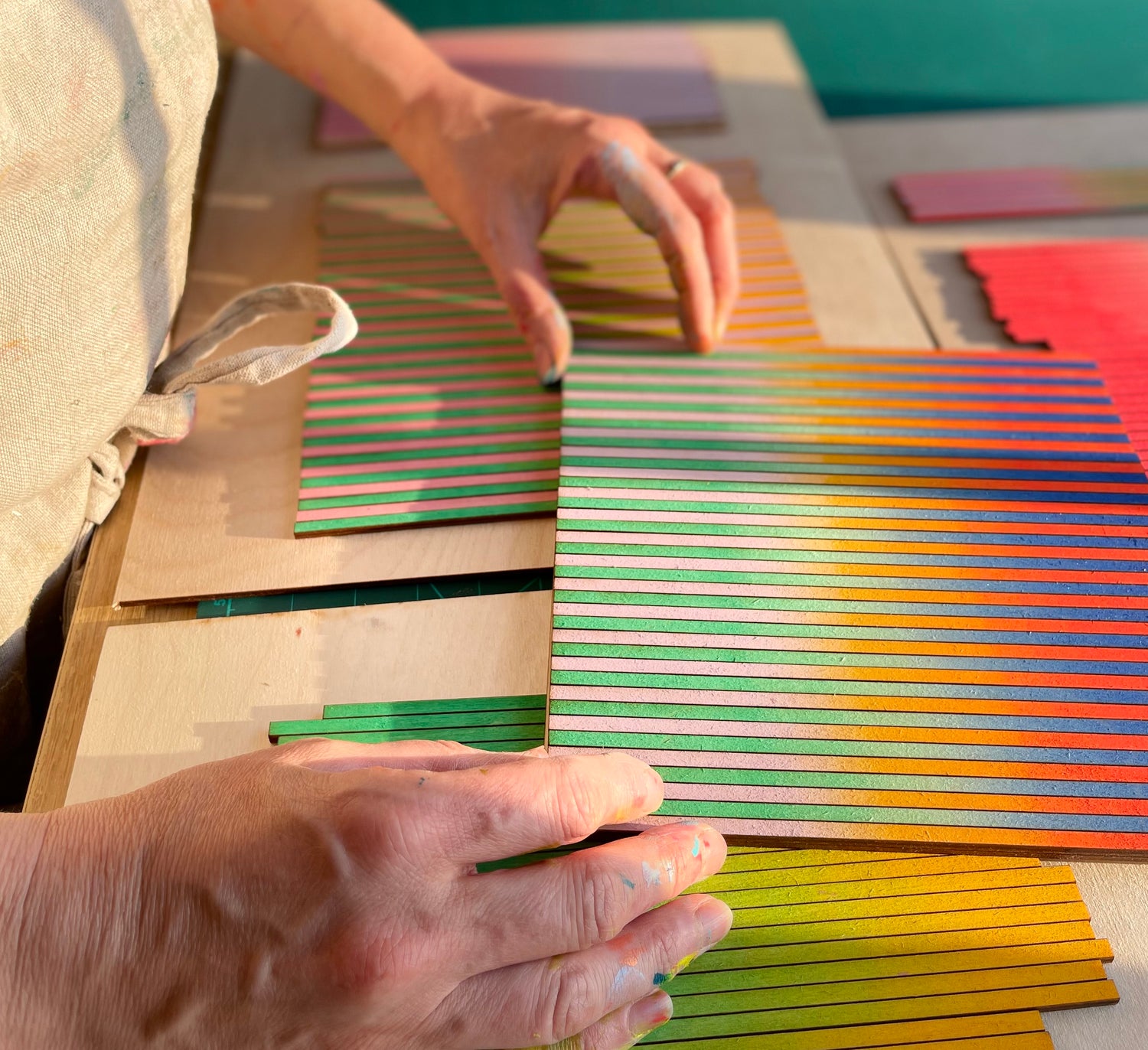 Amelia has successfully transferred these skills to her current medium, using wood and laser cutting machines to create her distinctive stripe and dot artworks. Her ability to blend colours and her detailed, methodical approach to design are evident in the intricate compositions. This combination of artistic training and industry experience enables Amelia to produce unique and visually captivating pieces that resonate with both private collectors and commercial clients