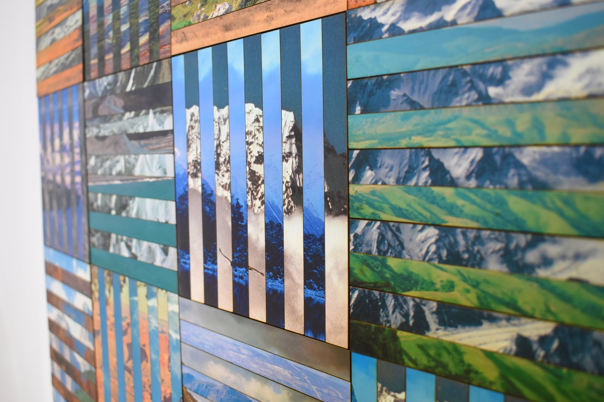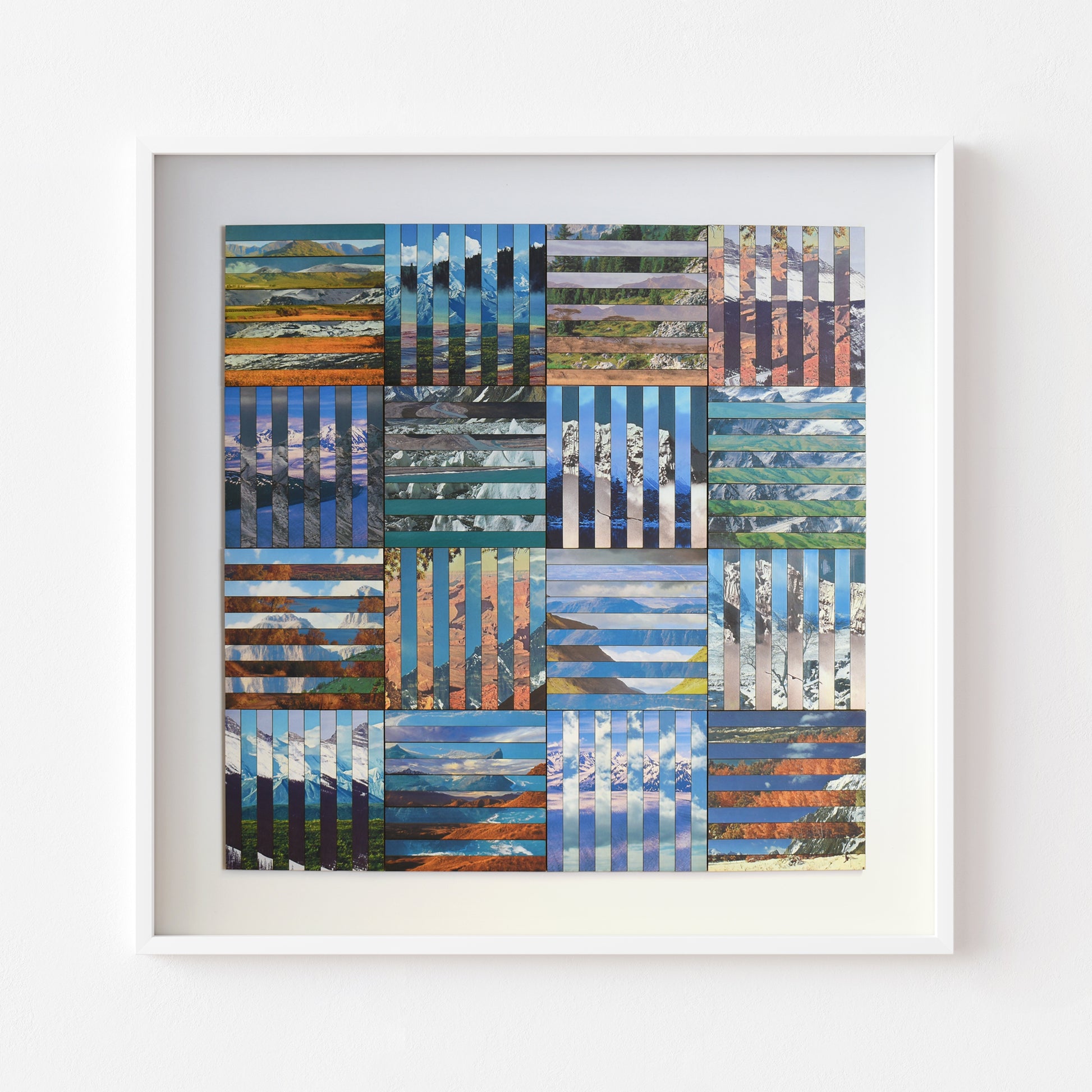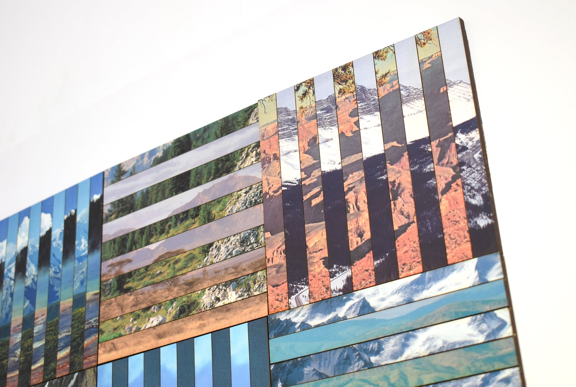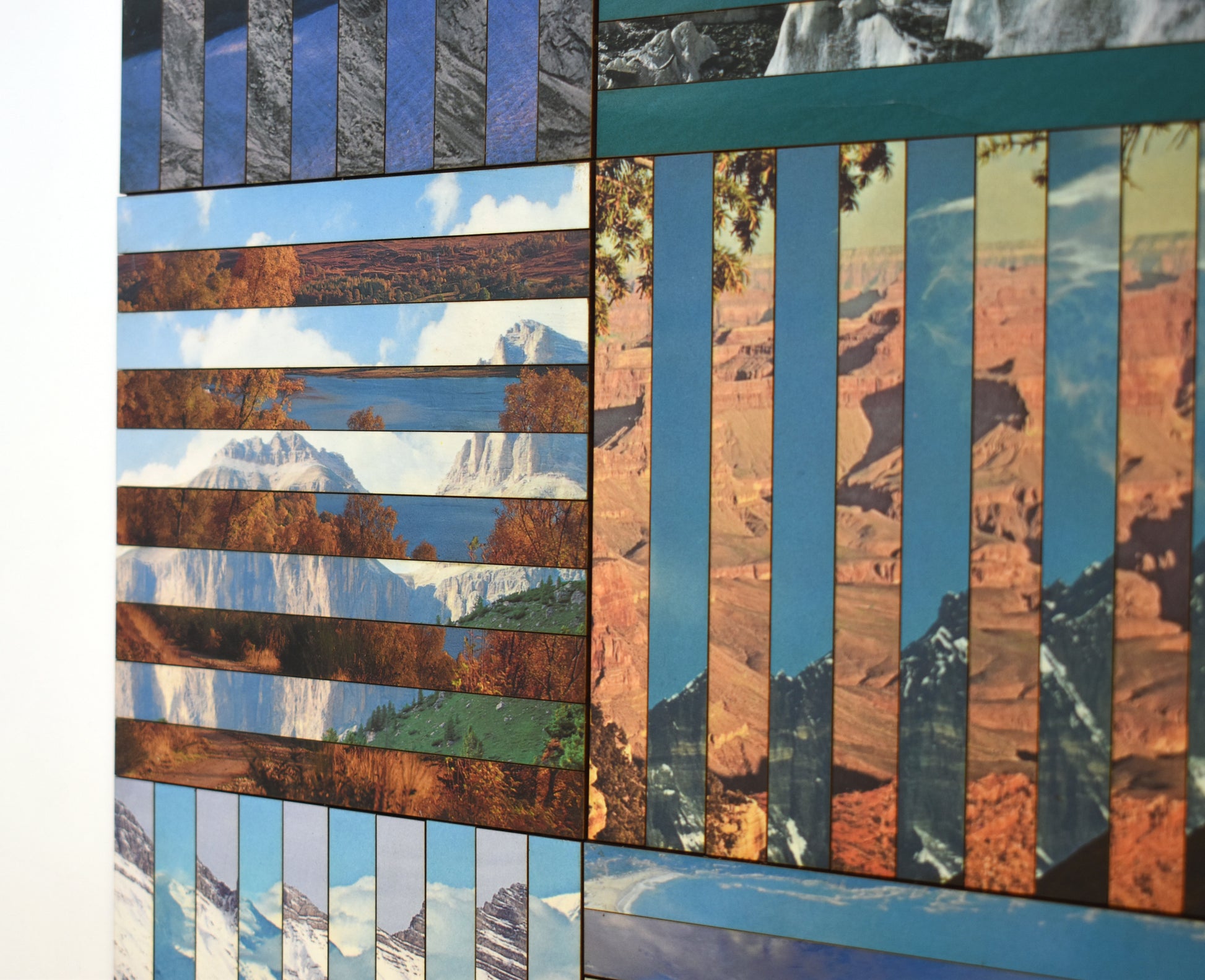 "Between" is an original, large mixed media collage that will add depth and dimension to your space. Vintage landscape imagery, carefully sourced from vintage travel books and atlases, is hand-bonded to birch wood. The wood is then laser-cut into strips and meticulously reassembled into a precise intersecting geometric stripe composition.