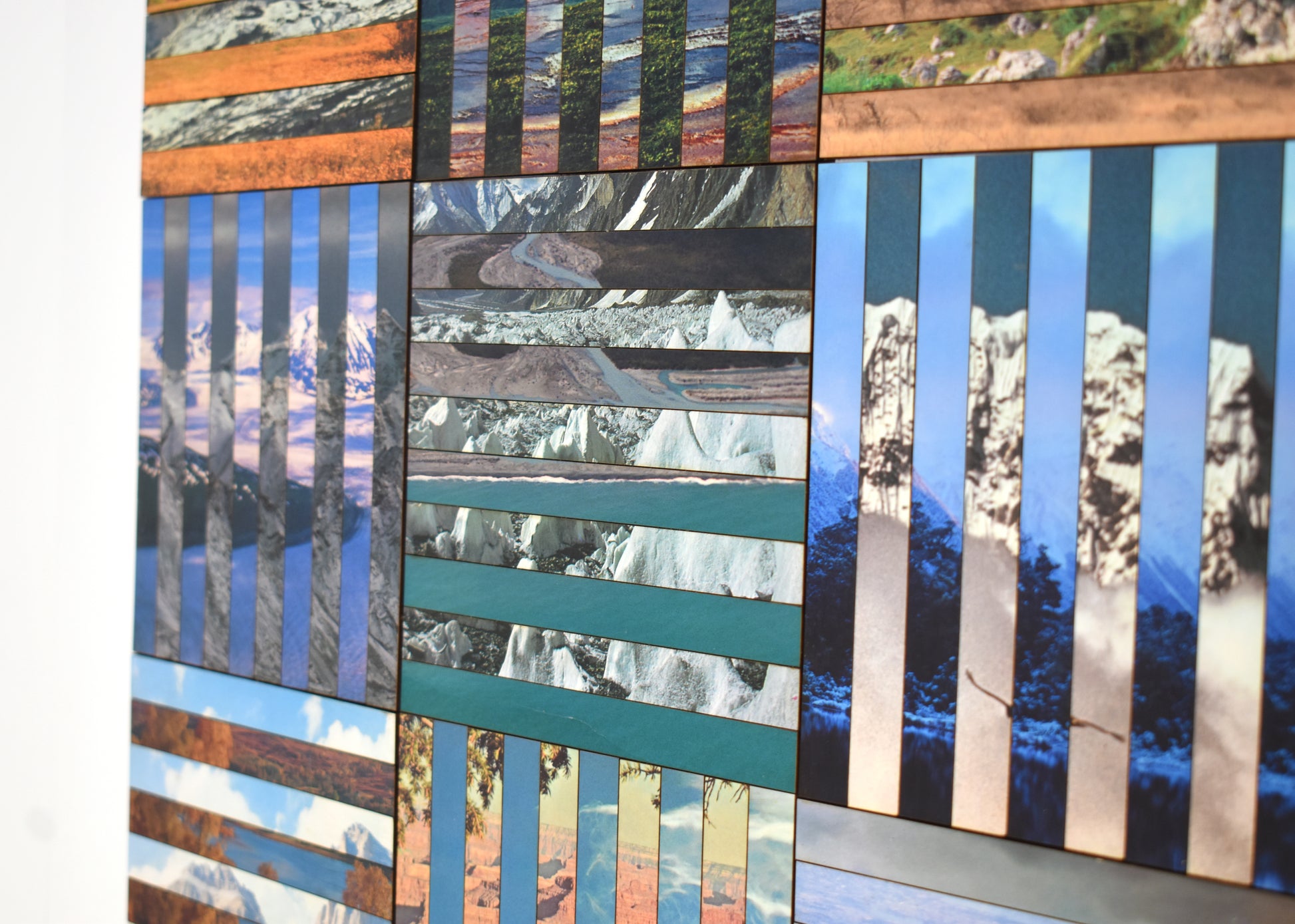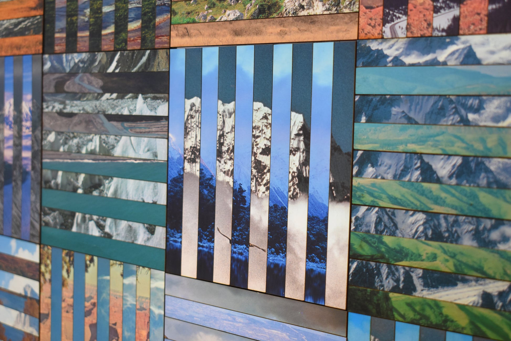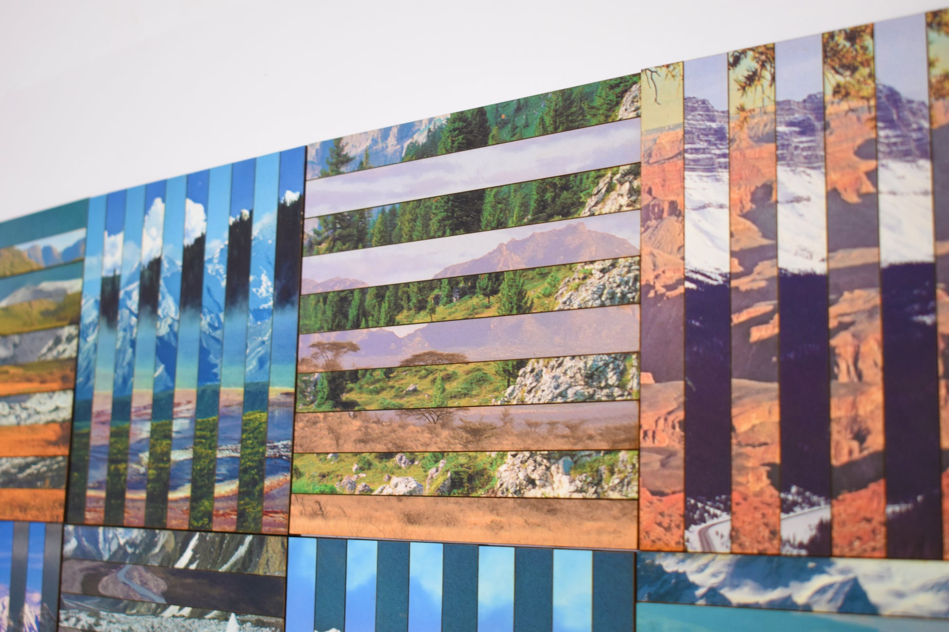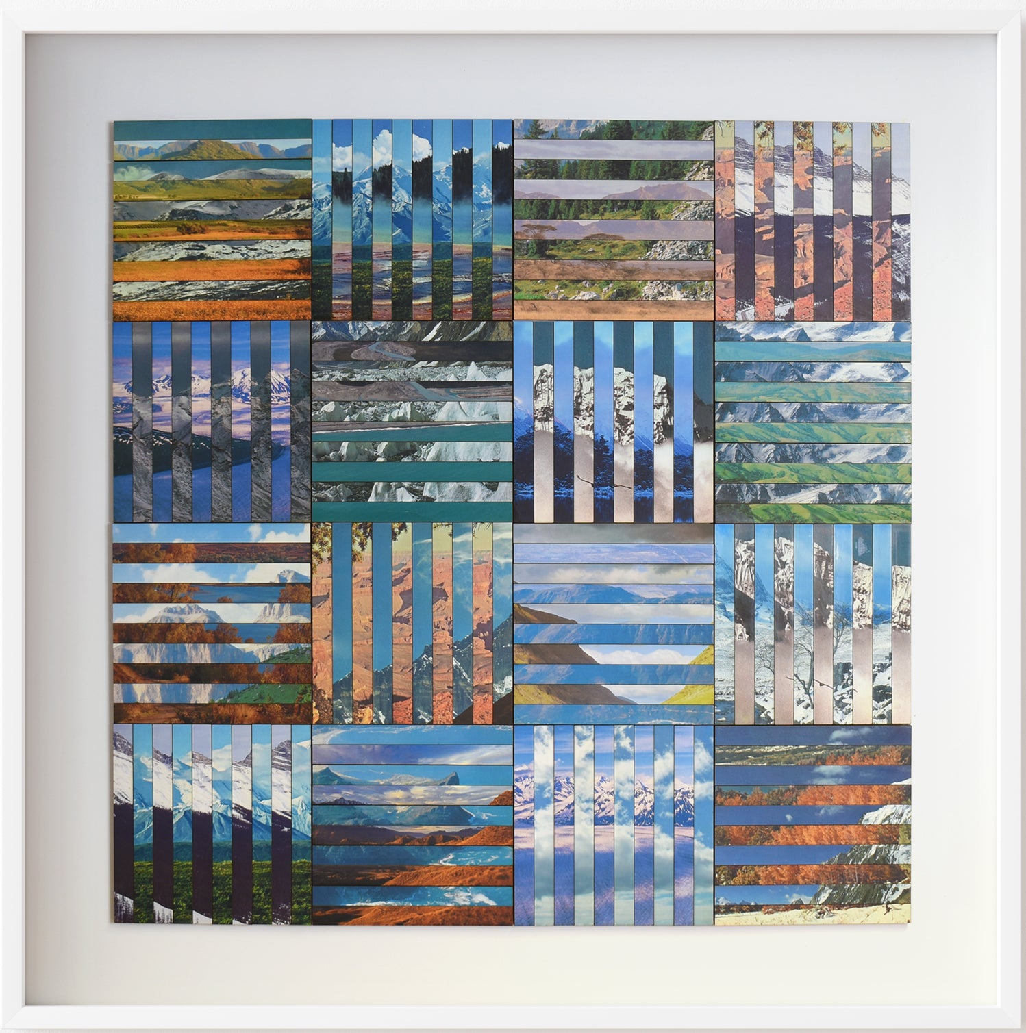 "Between" is an original, large mixed media collage that will add depth and dimension to your space. Vintage landscape imagery, carefully sourced from vintage travel books and atlases, is hand-bonded to birch wood. The wood is then laser-cut into strips and meticulously reassembled into a precise intersecting geometric stripe composition.