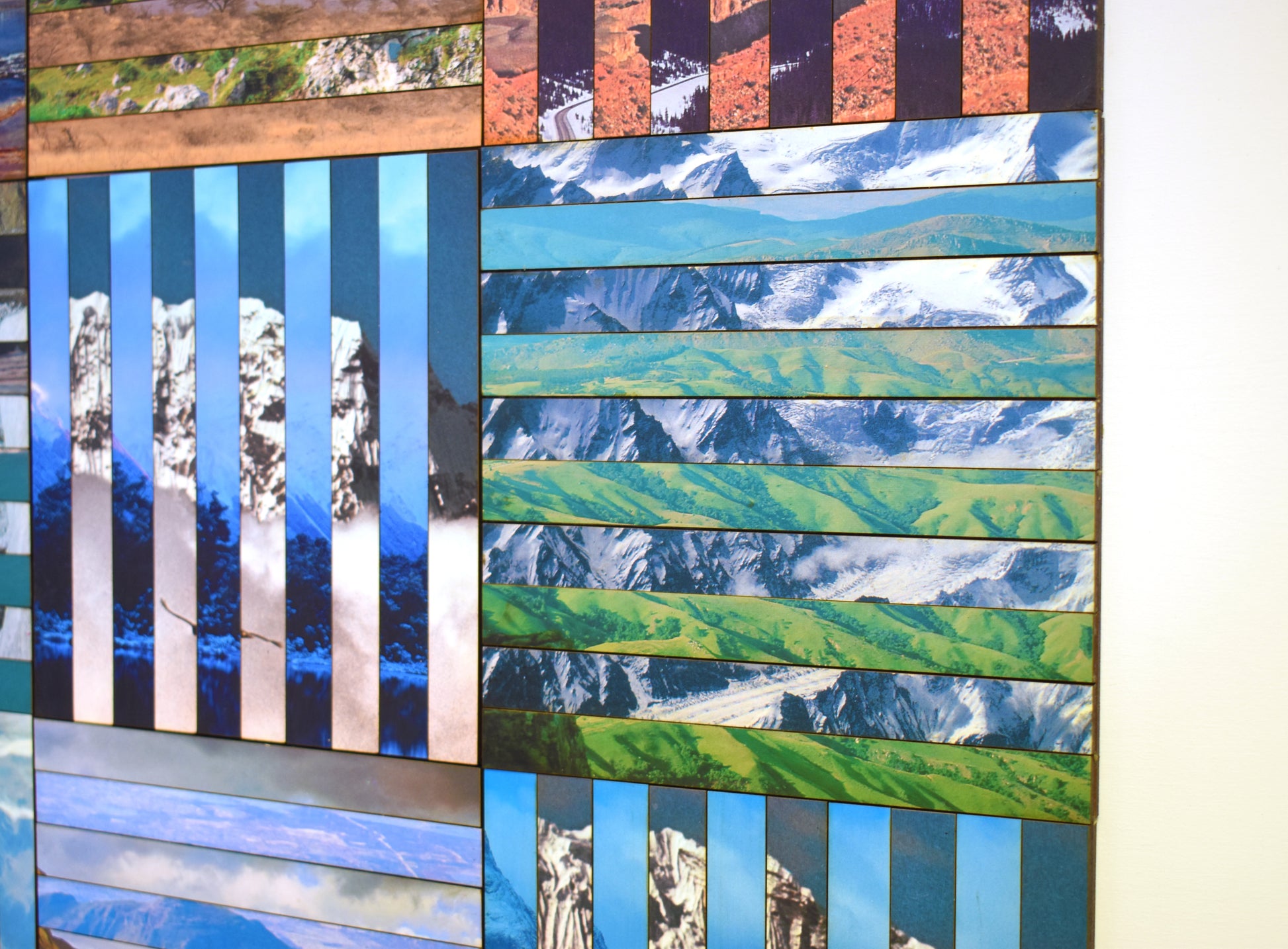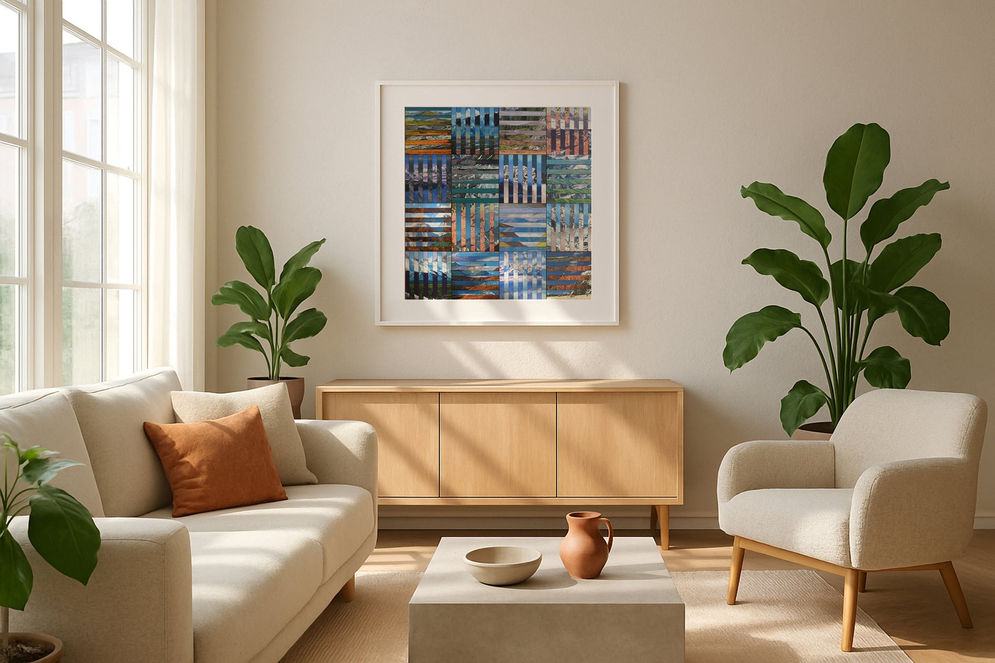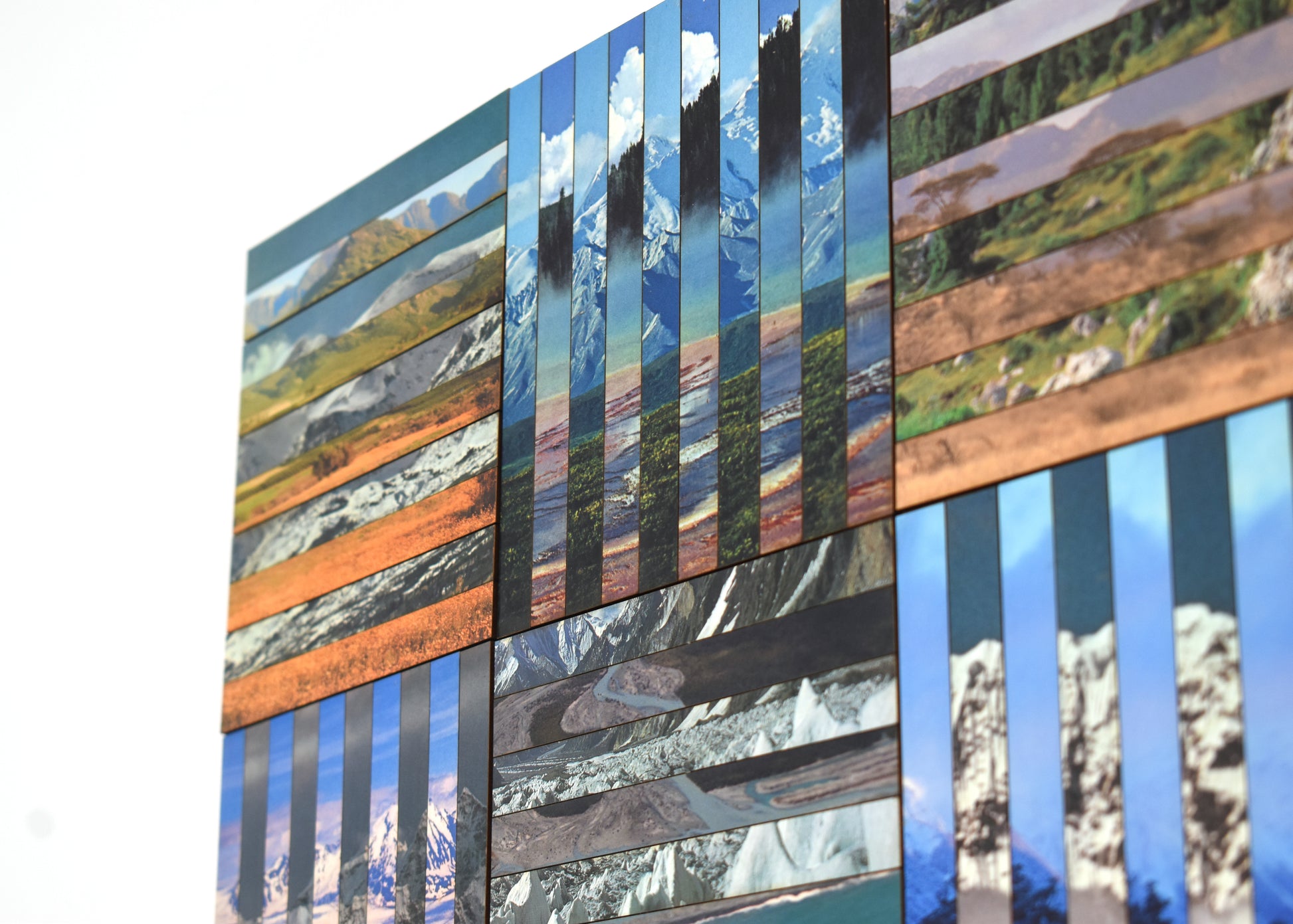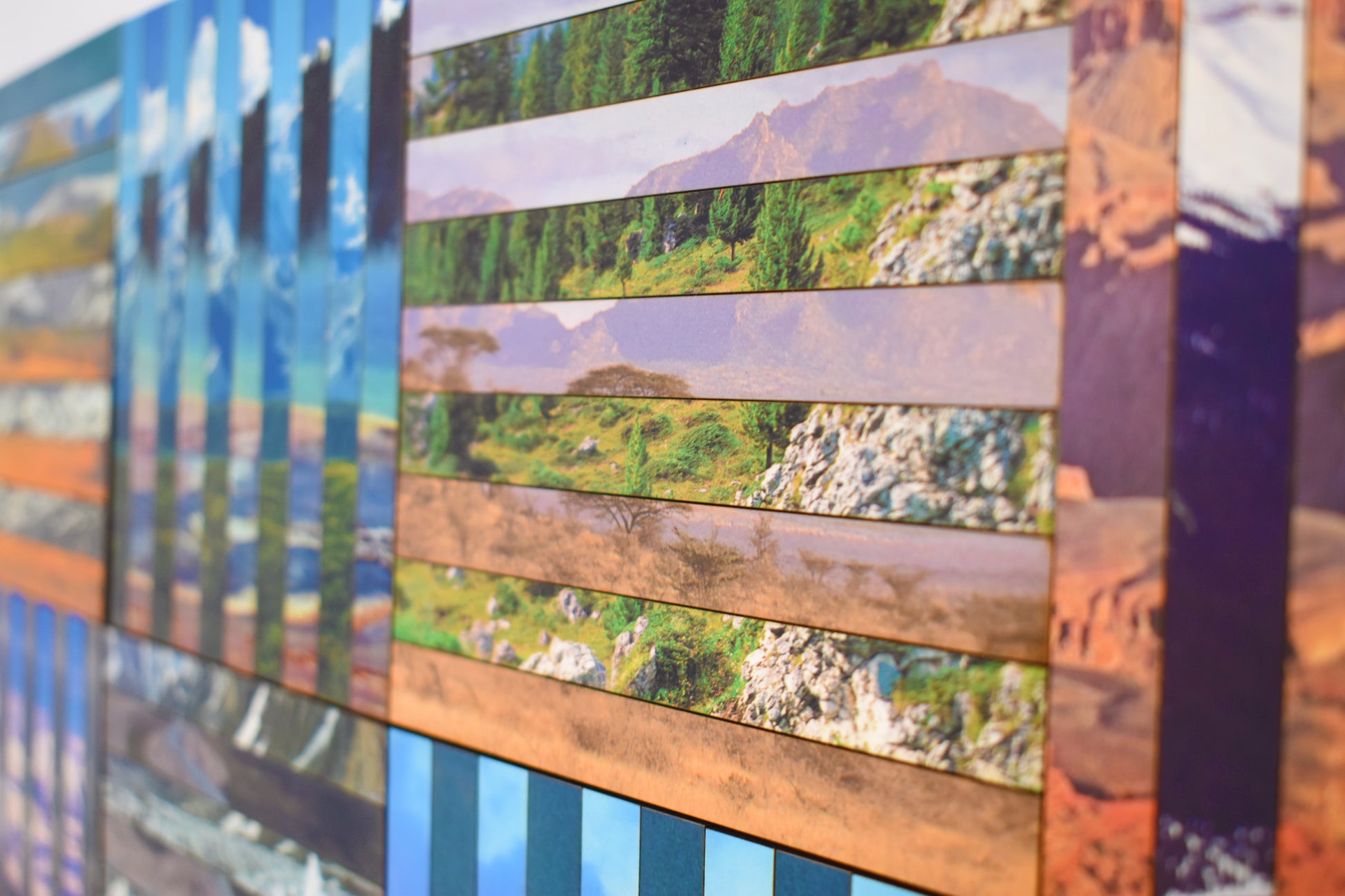 "Between" is an original, large mixed media collage that will add depth and dimension to your space. Vintage landscape imagery, carefully sourced from vintage travel books and atlases, is hand-bonded to birch wood. The wood is then laser-cut into strips and meticulously reassembled into a precise intersecting geometric stripe composition.