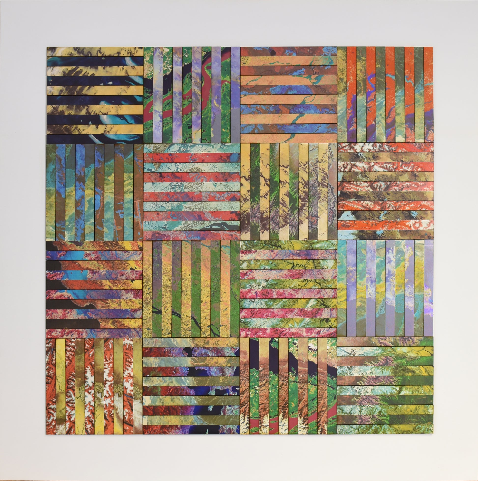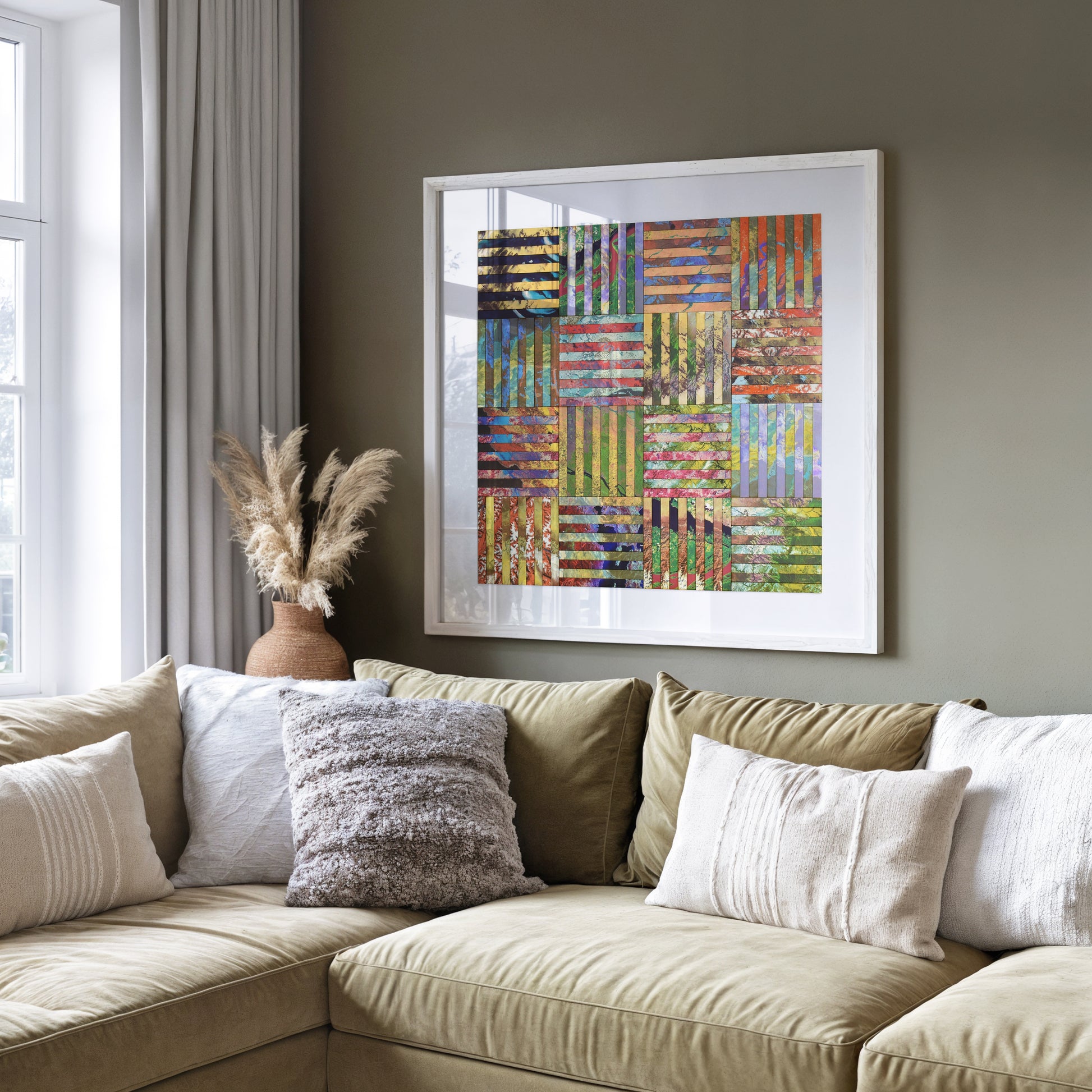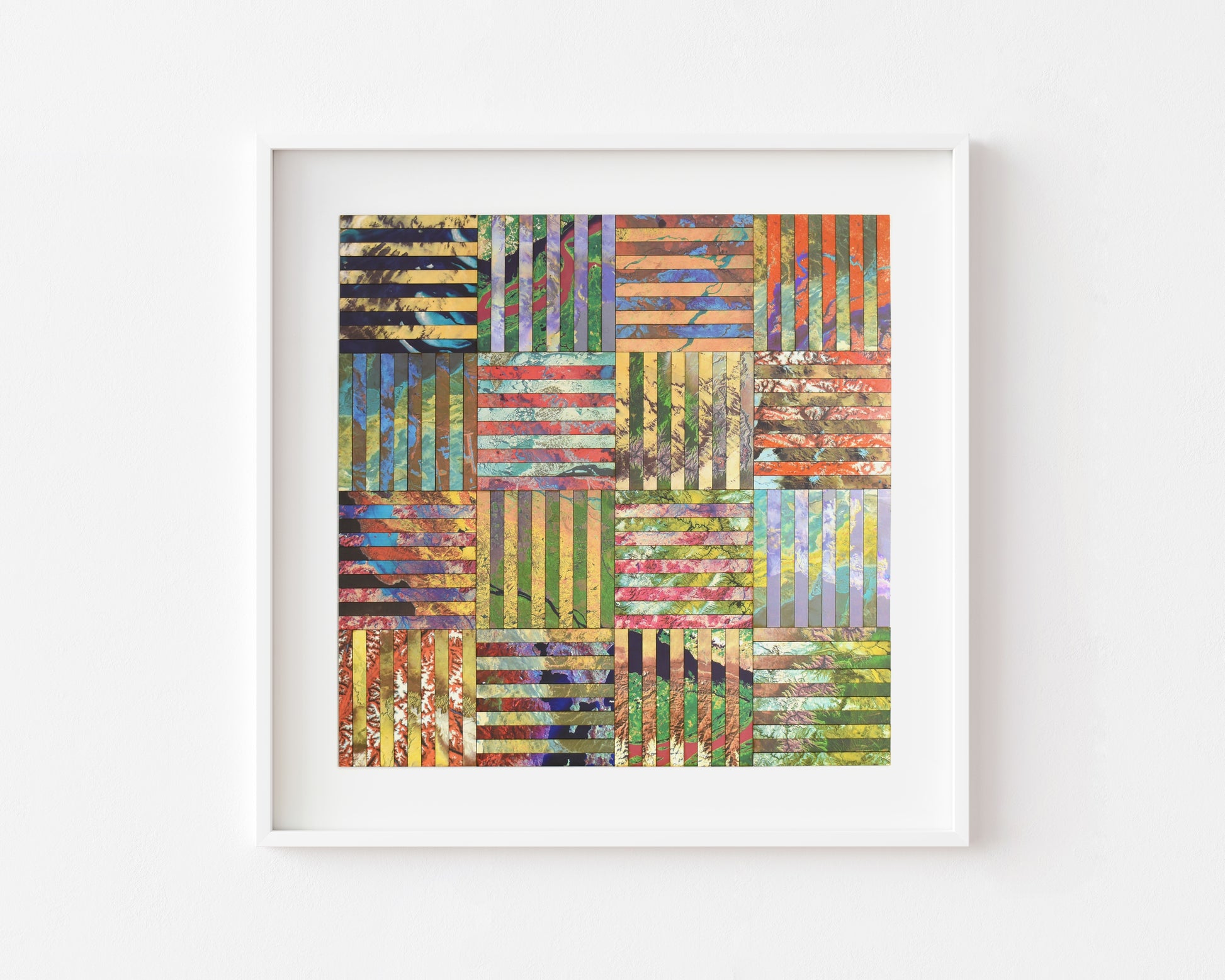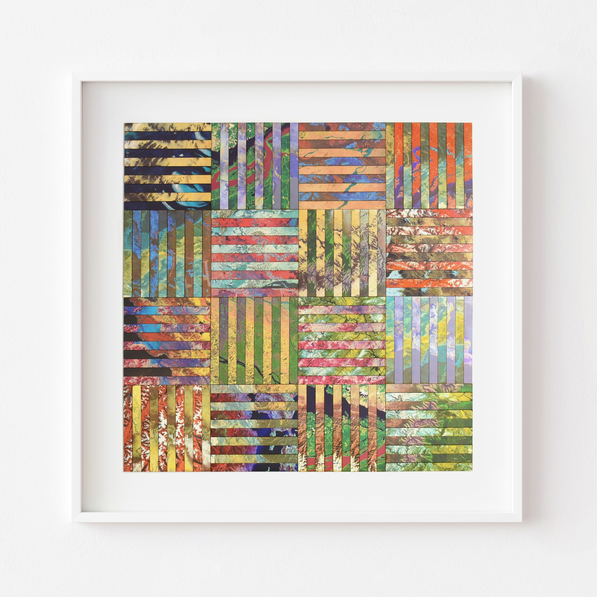 The artist's technique creates a stunning interplay of color and form. The subtle, soft colors and gradient effects evoke a sense of landscape and travel, while the geometric grid adds a touch of modernism and minimalism. The piece is mounted on a white gesso board, enhancing its clean lines and contemporary feel.