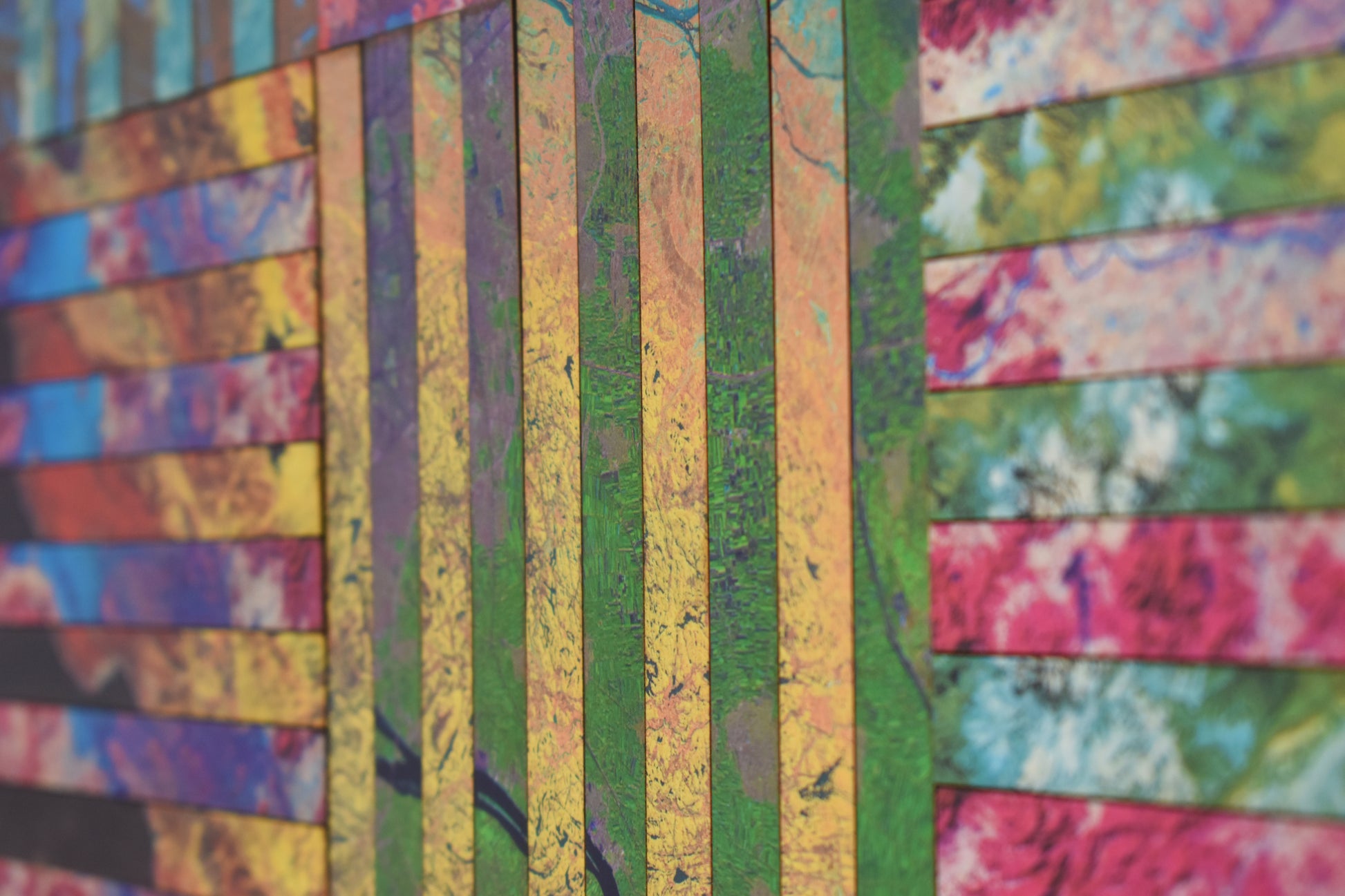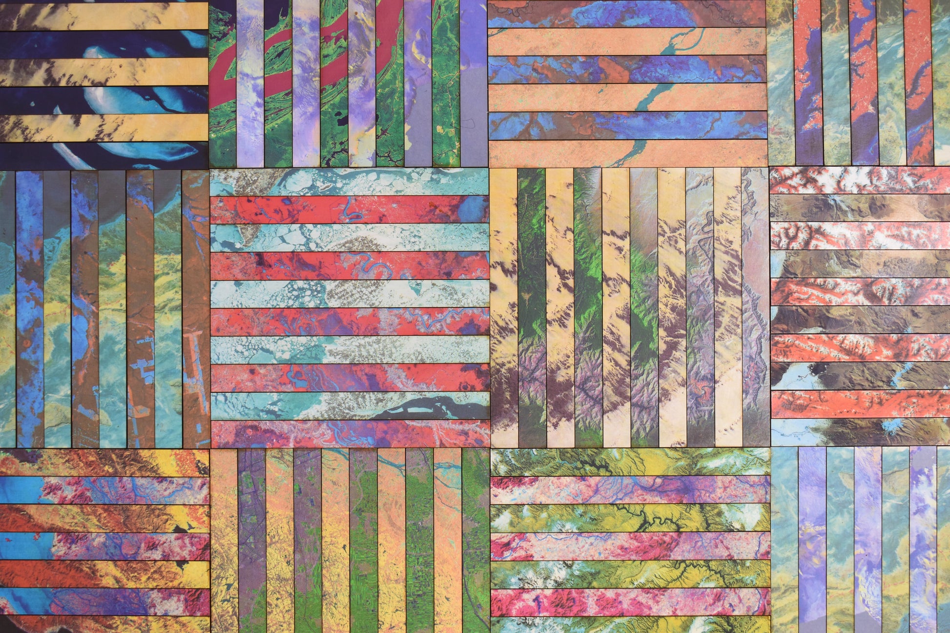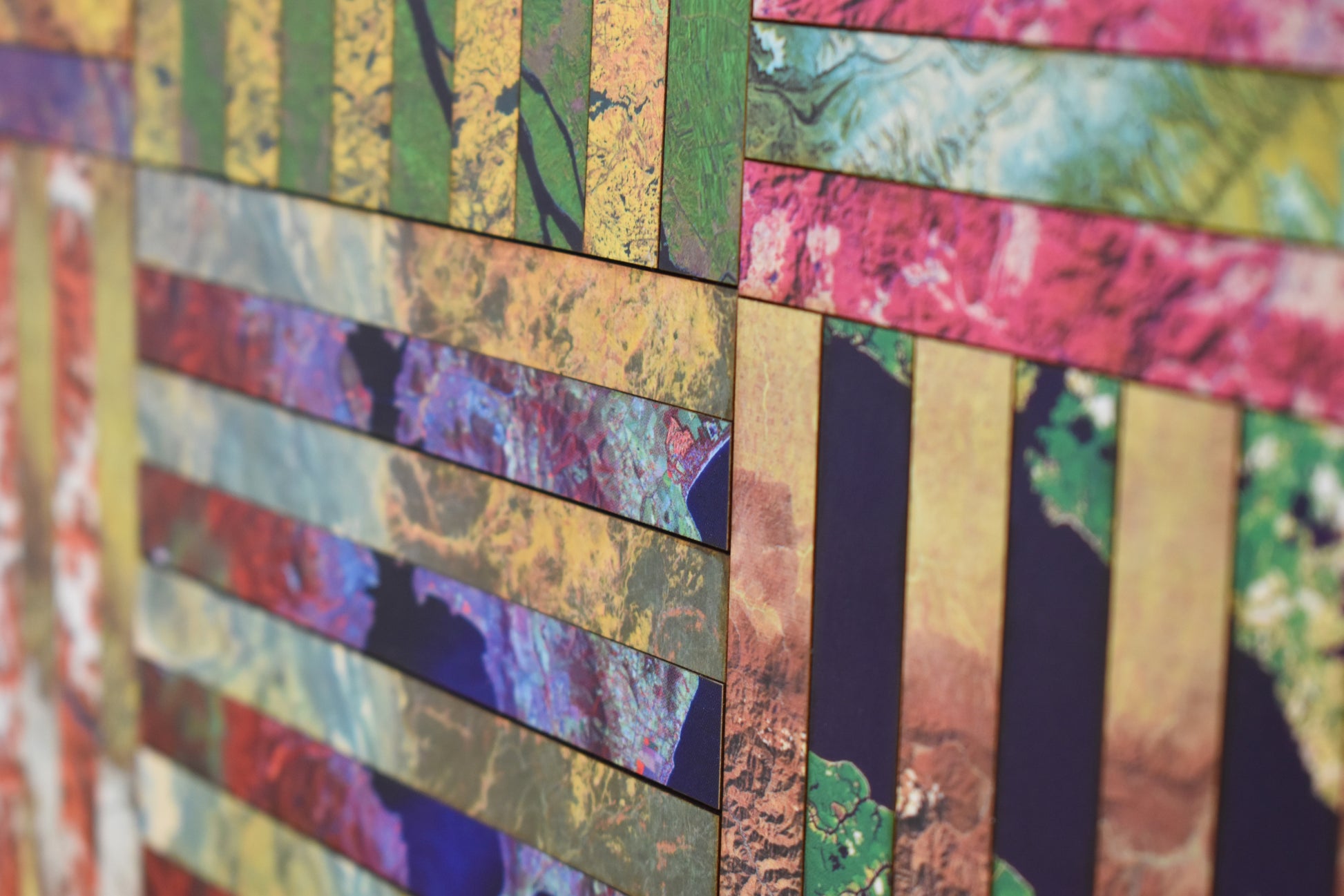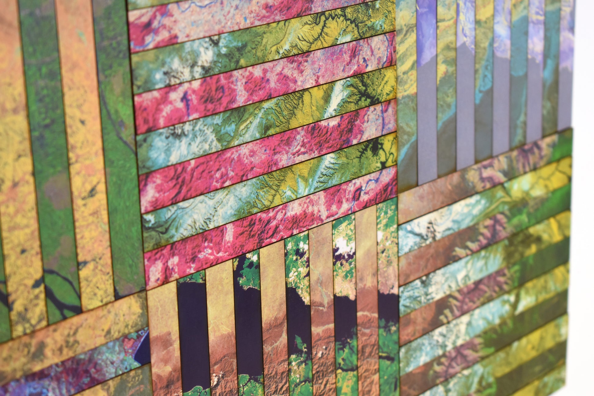 "Beyond" is an original, large mixed media collage that will add depth and dimension to your space. Vintage satellite map imagery, carefully sourced from atlases of the world, is hand-bonded to birch wood. The wood is then expertly laser-cut into strips and meticulously reassembled into a captivating geometric composition.
