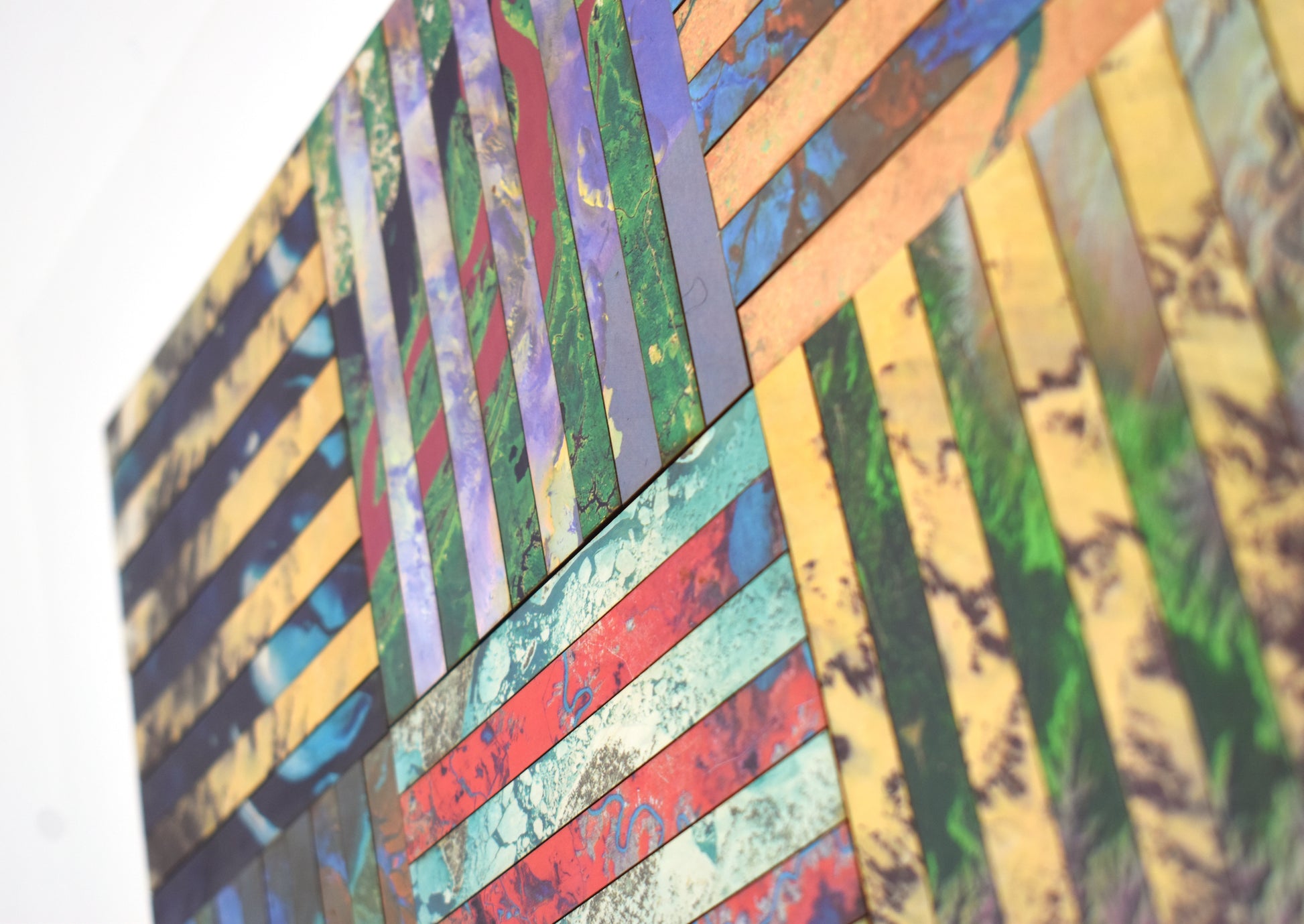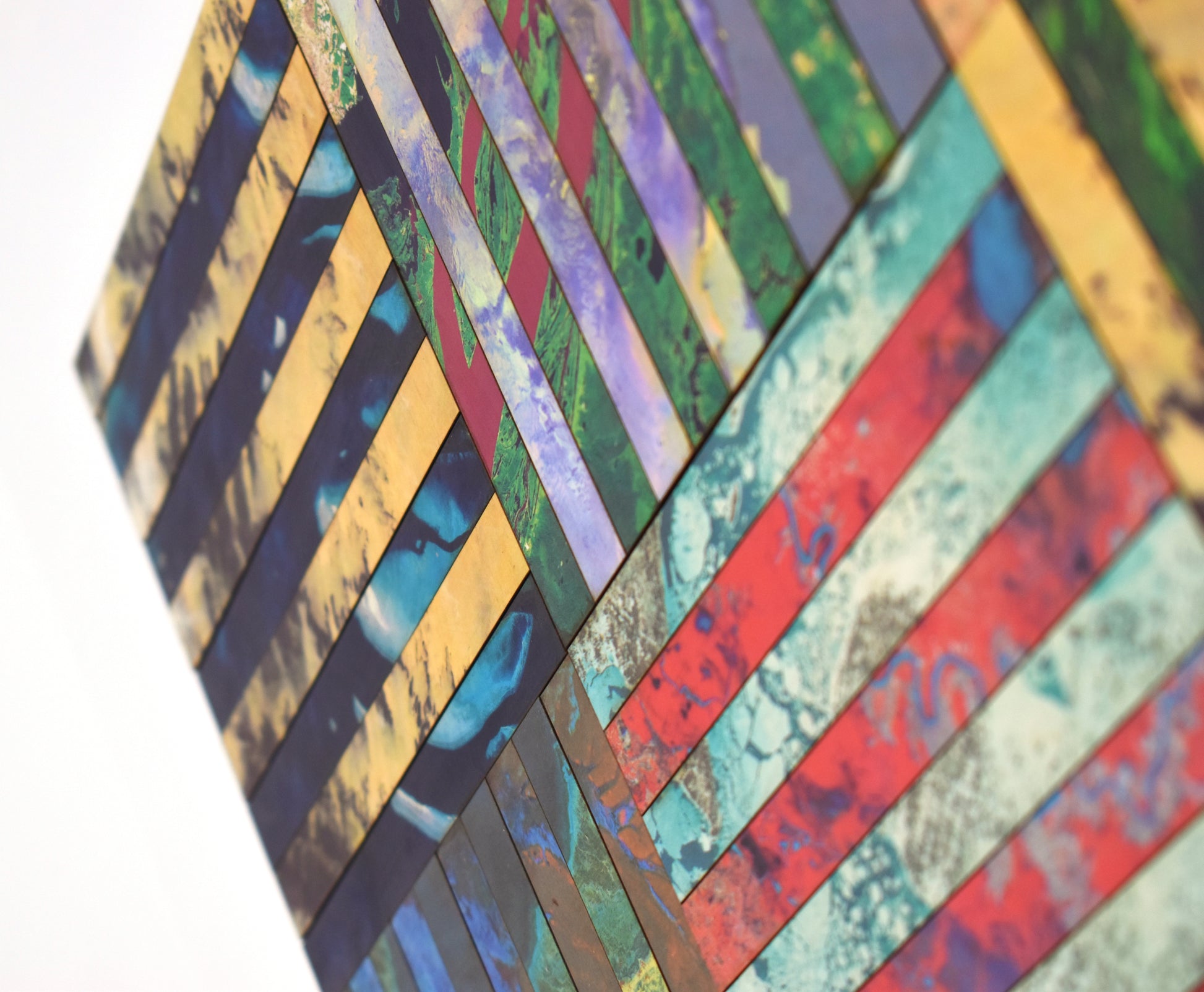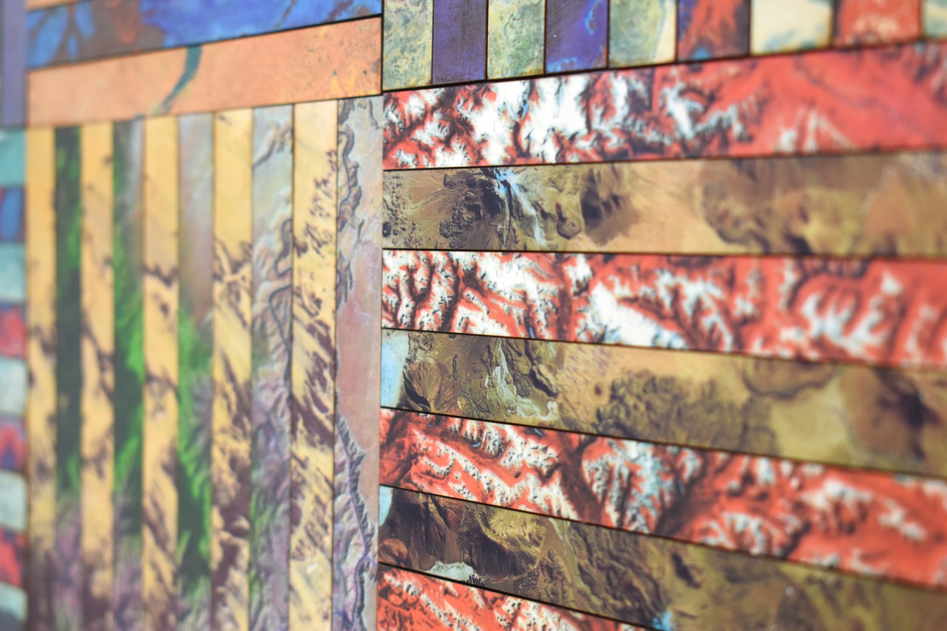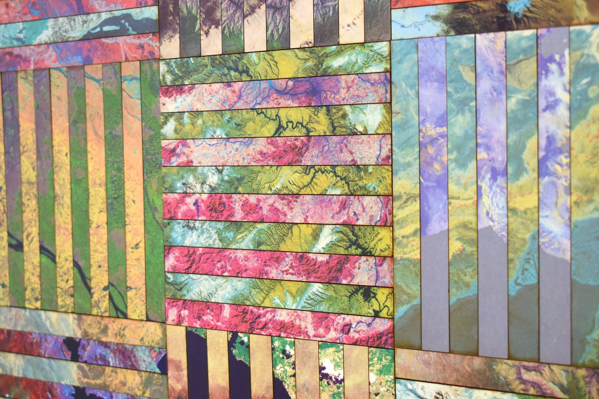 "Beyond" is an original, large mixed media collage that will add depth and dimension to your space. Vintage satellite map imagery, carefully sourced from atlases of the world, is hand-bonded to birch wood. The wood is then expertly laser-cut into strips and meticulously reassembled into a captivating geometric composition.