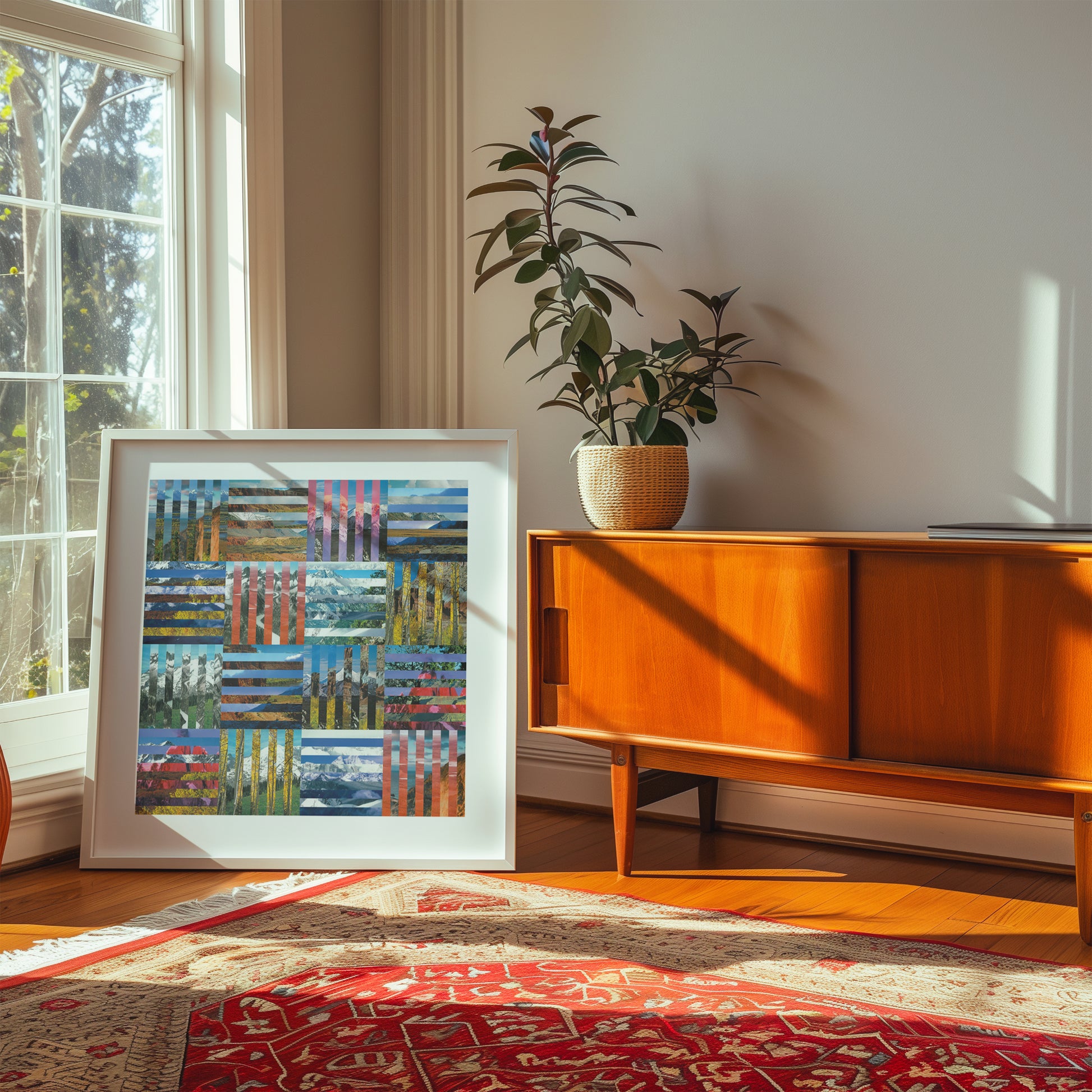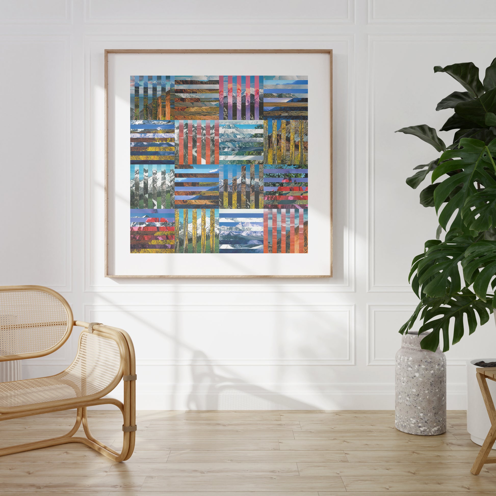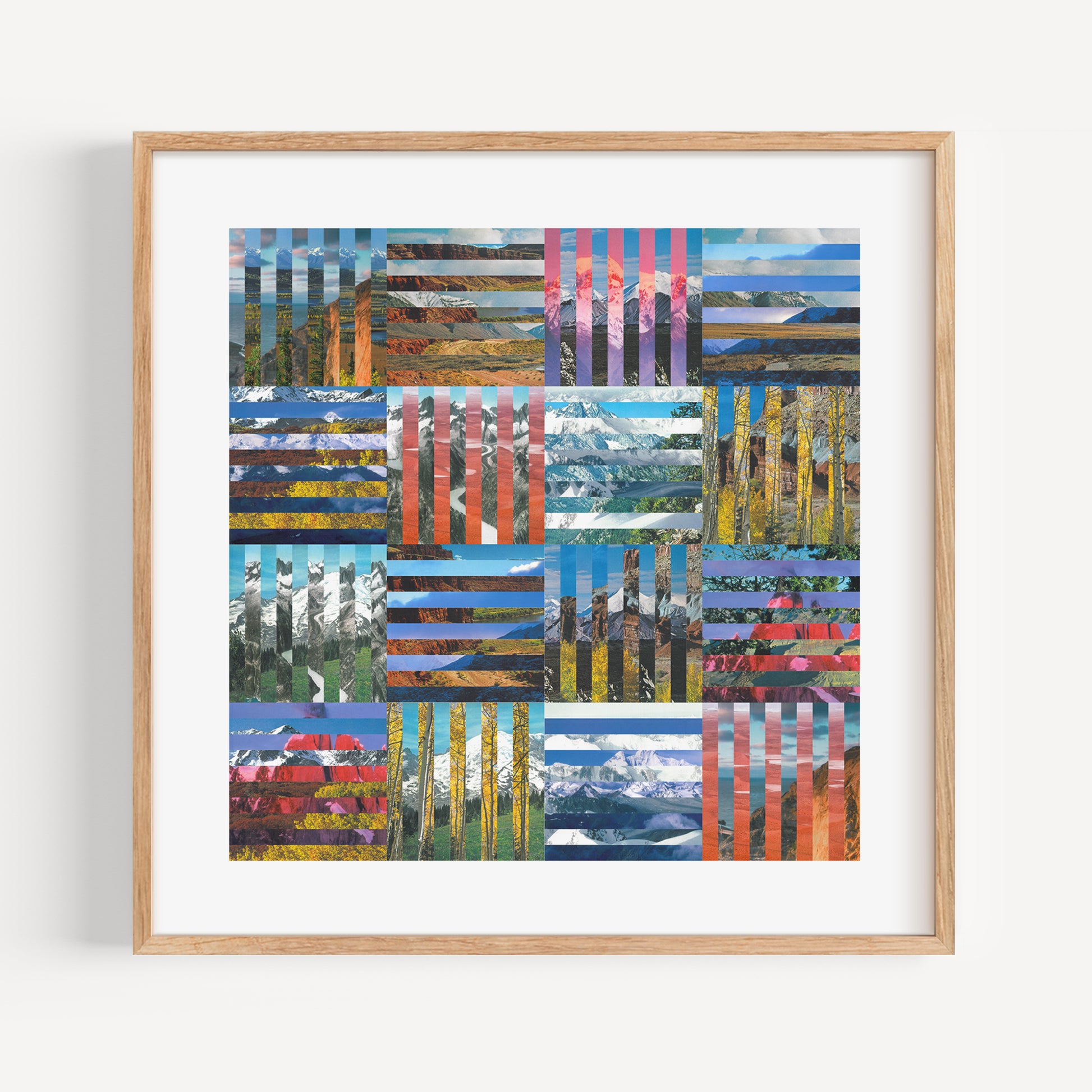 Fine art quality Giclée print of "Expanse" which is a large-scale digital collage using found vintage landscape imagery, carefully sourced from vintage travel books and atlases. The design was created using the found imagery digitally curring them into sections and meticulously reassembling them into a precise intersecting geometric stripe composition.