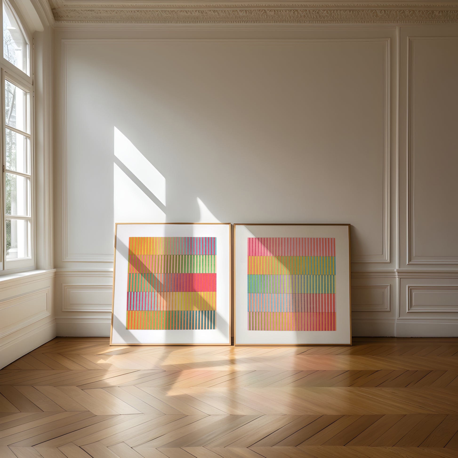 Three ink and acrylic ombre panel paintings each cut into sections and reassembled intersected with each other to create a bold bright interaction of colours.