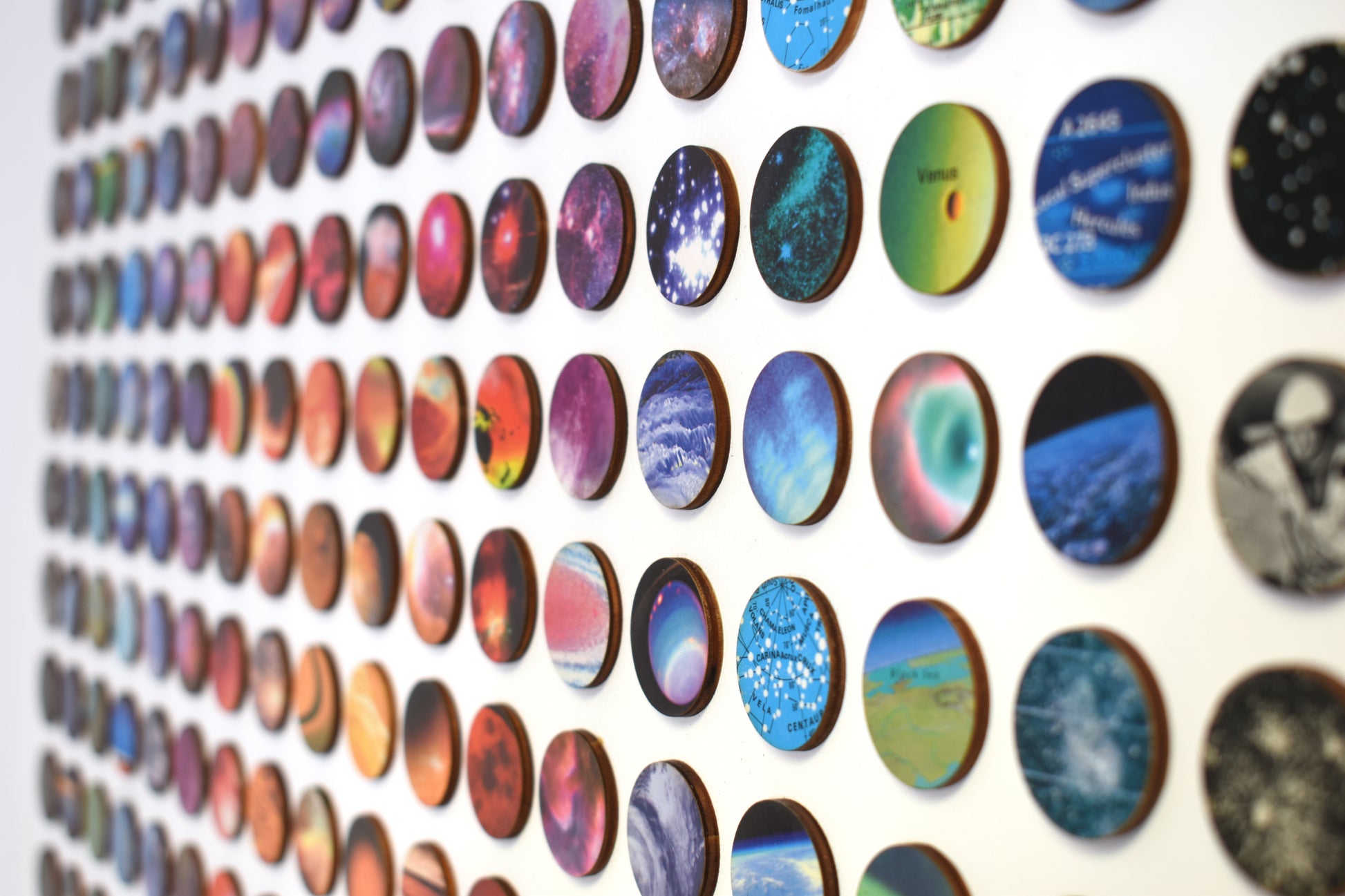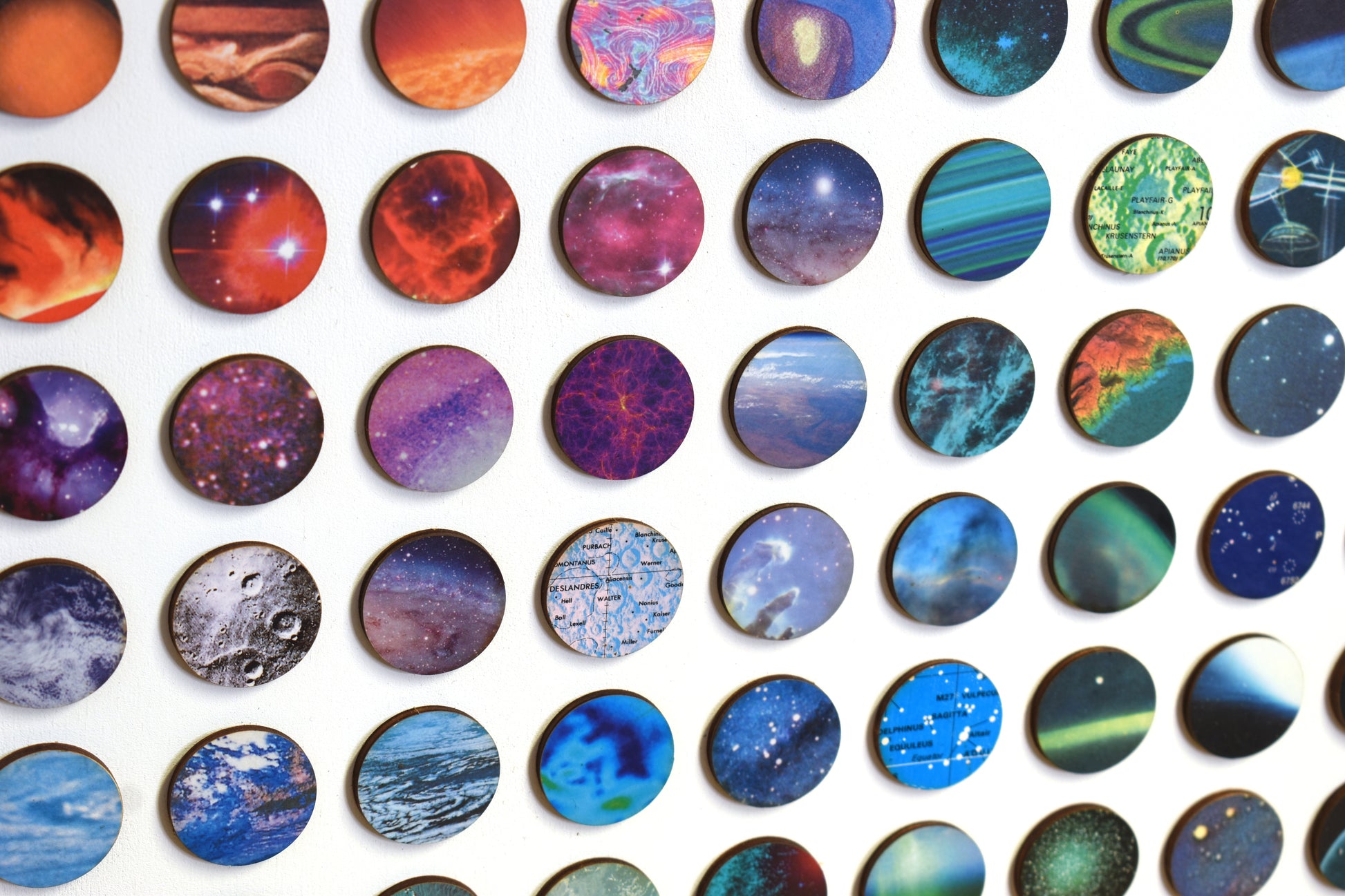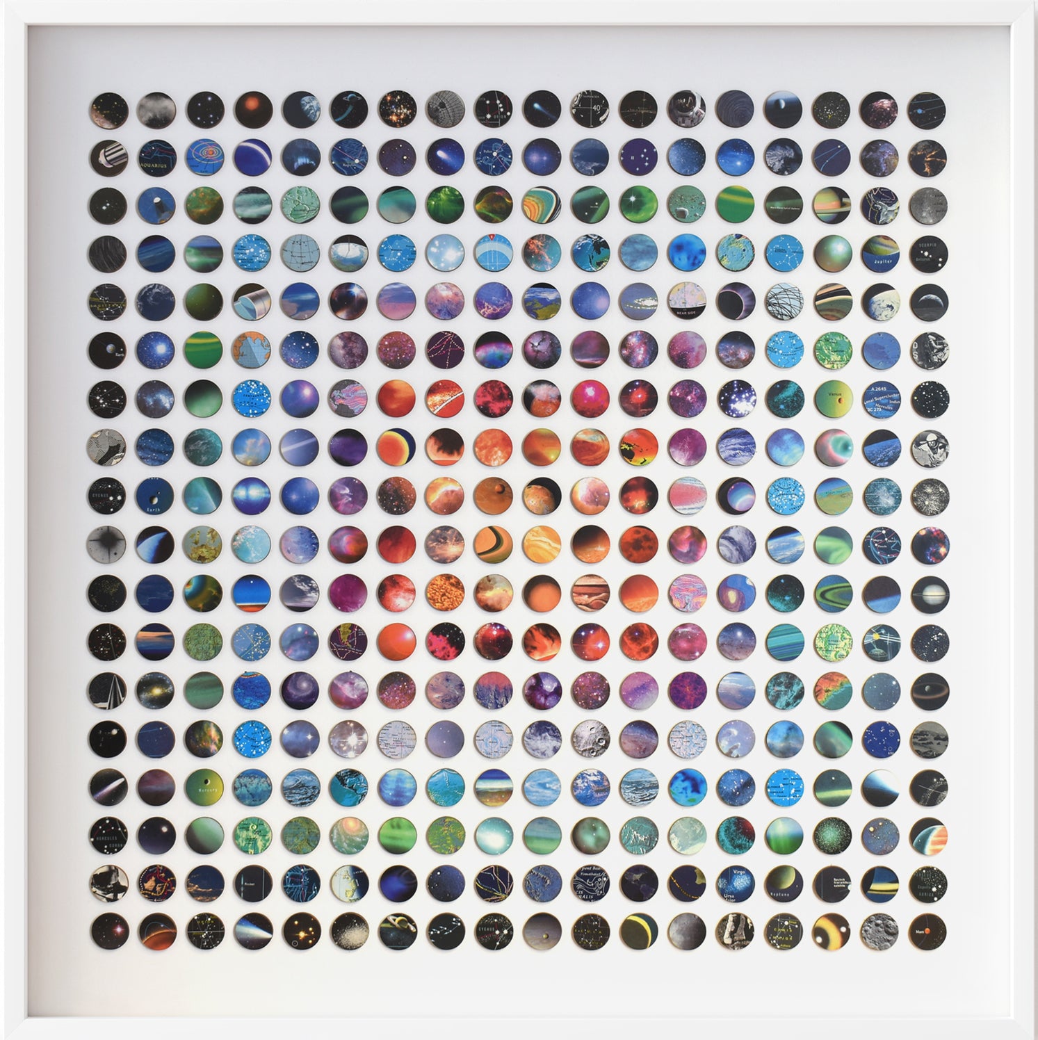 Three hundred and twenty-four individually hand-bonded pieces of vintage space imagery maps and charts arranged in a bold concentric ombre rainbow composition.