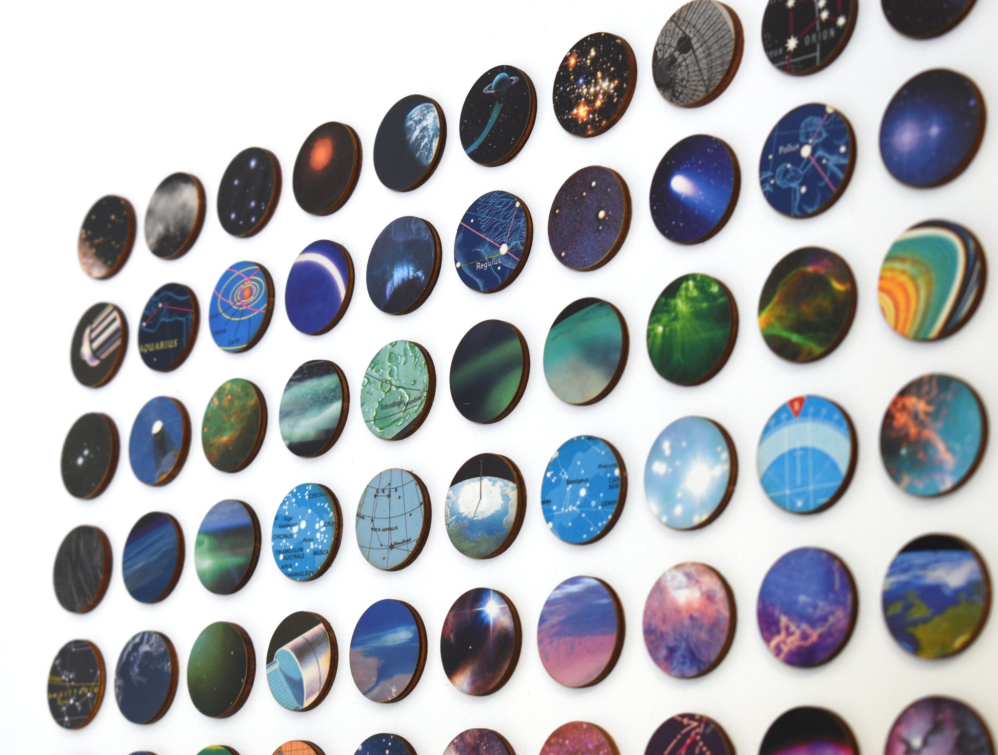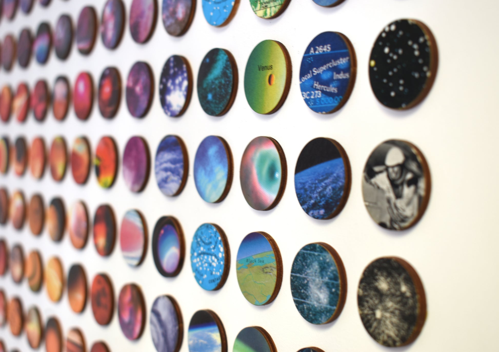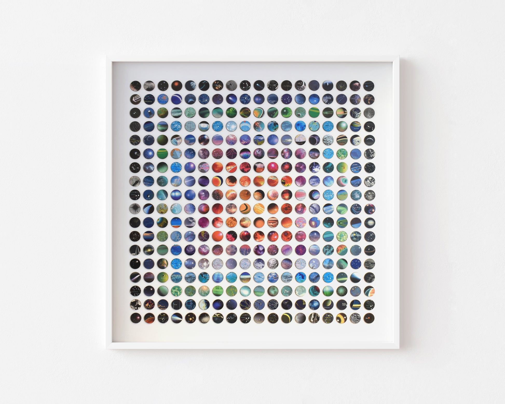 Three hundred and twenty-four individually hand-bonded pieces of vintage space imagery maps and charts arranged in a bold concentric ombre rainbow composition.