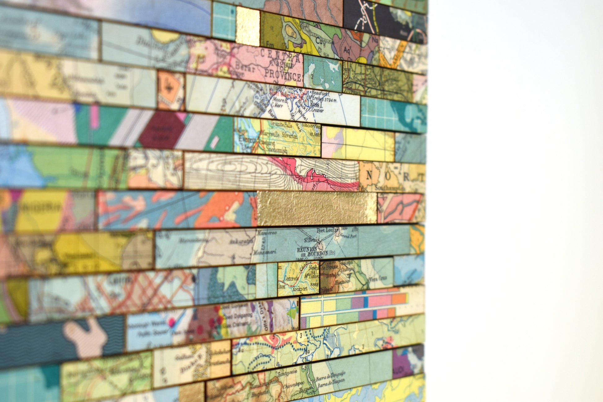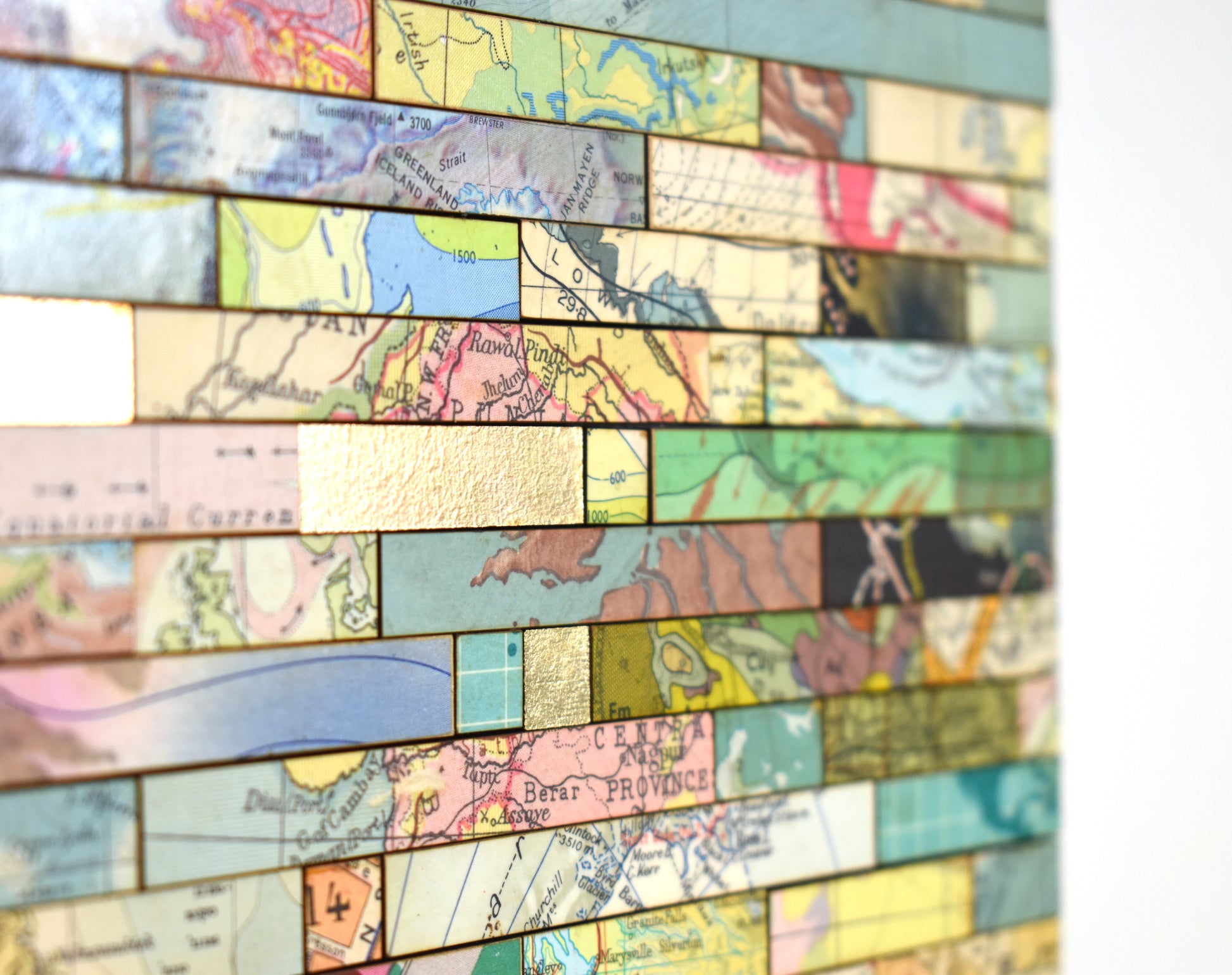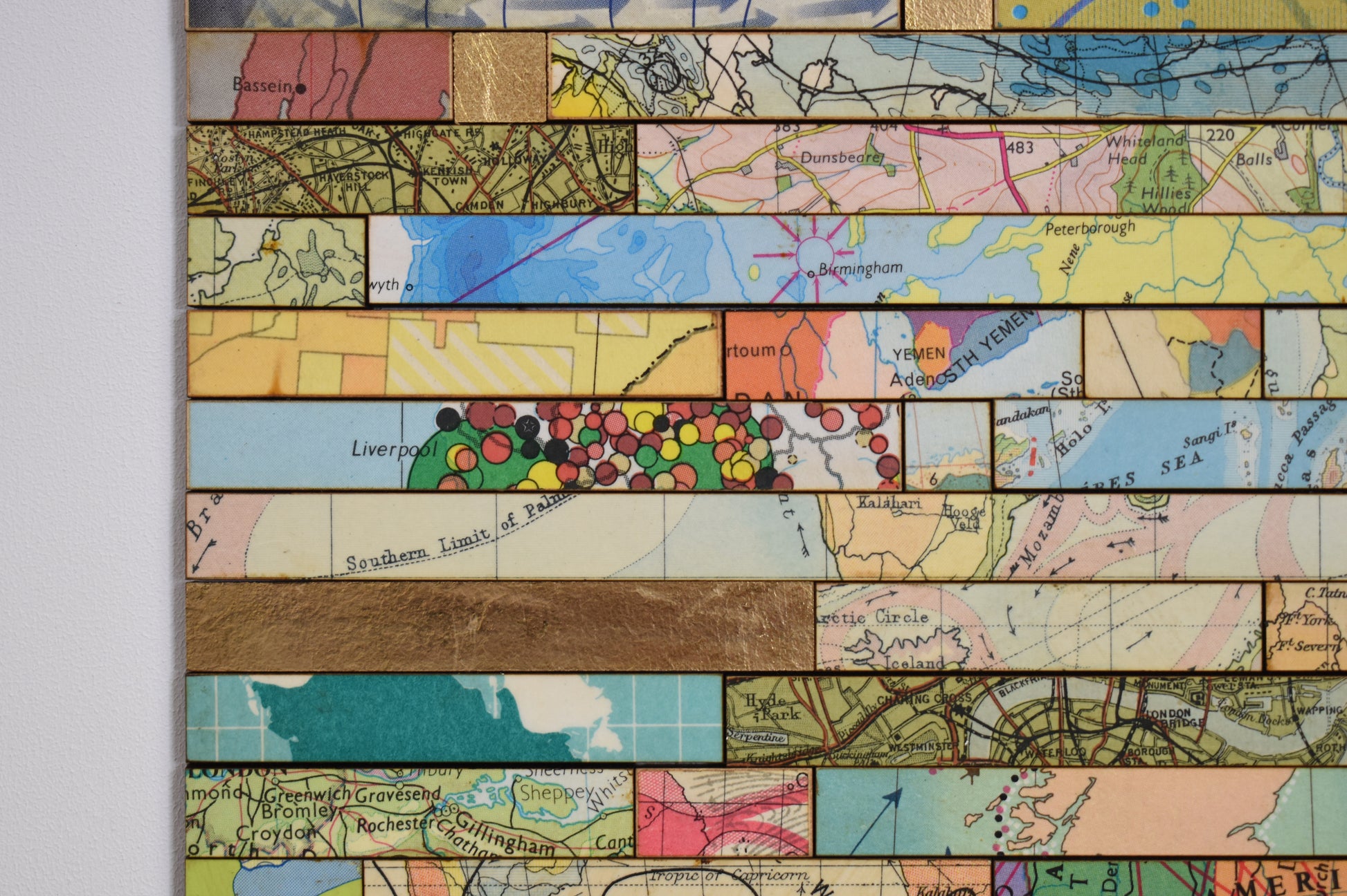 Original 3D mixed media collage. Hand-cut vintage and contemporary maps, birch ply, and gold leaf on board.