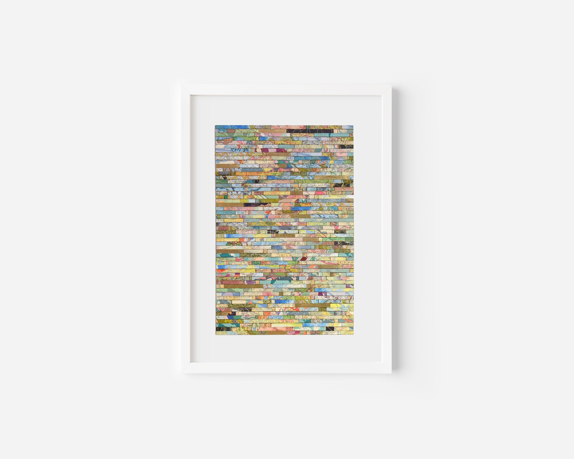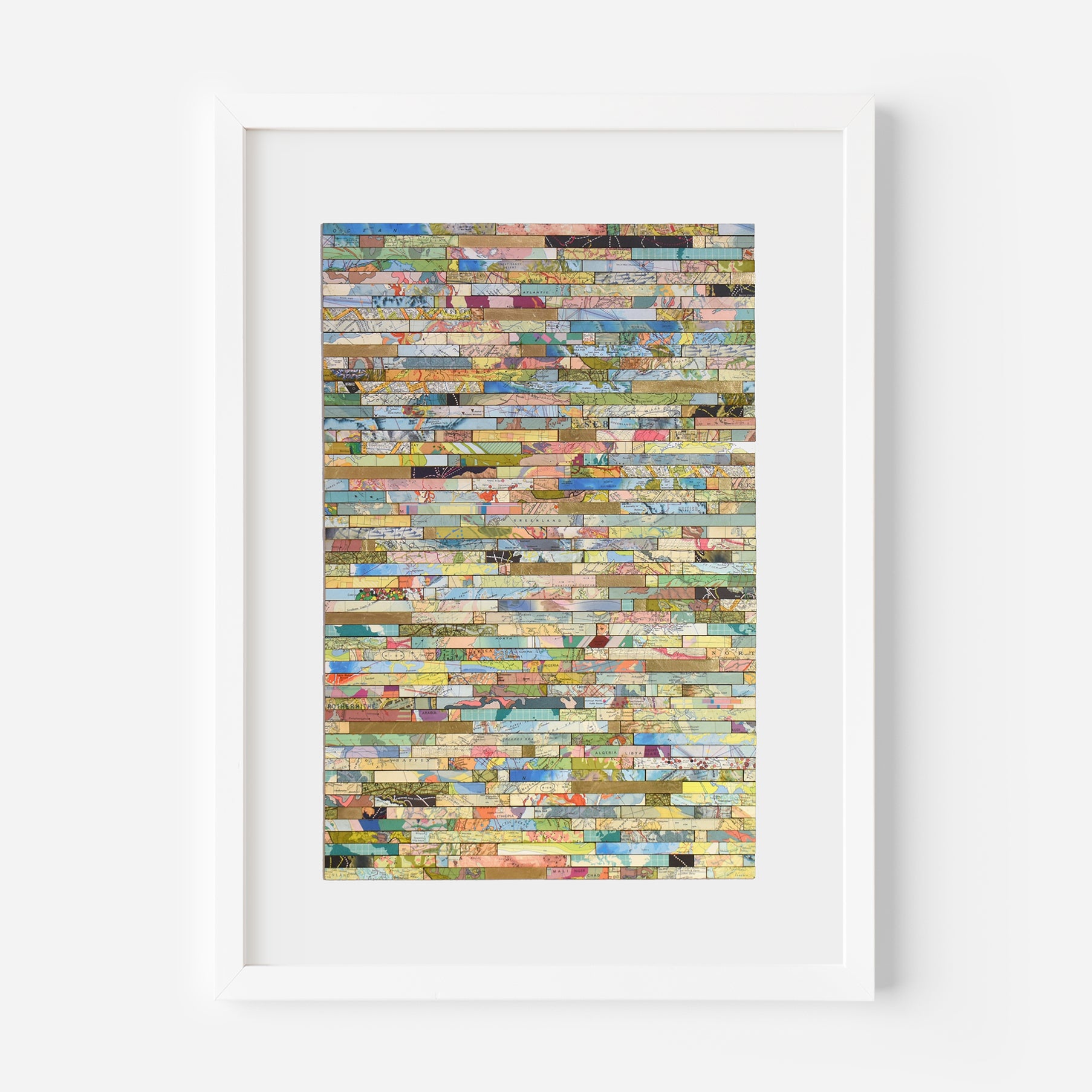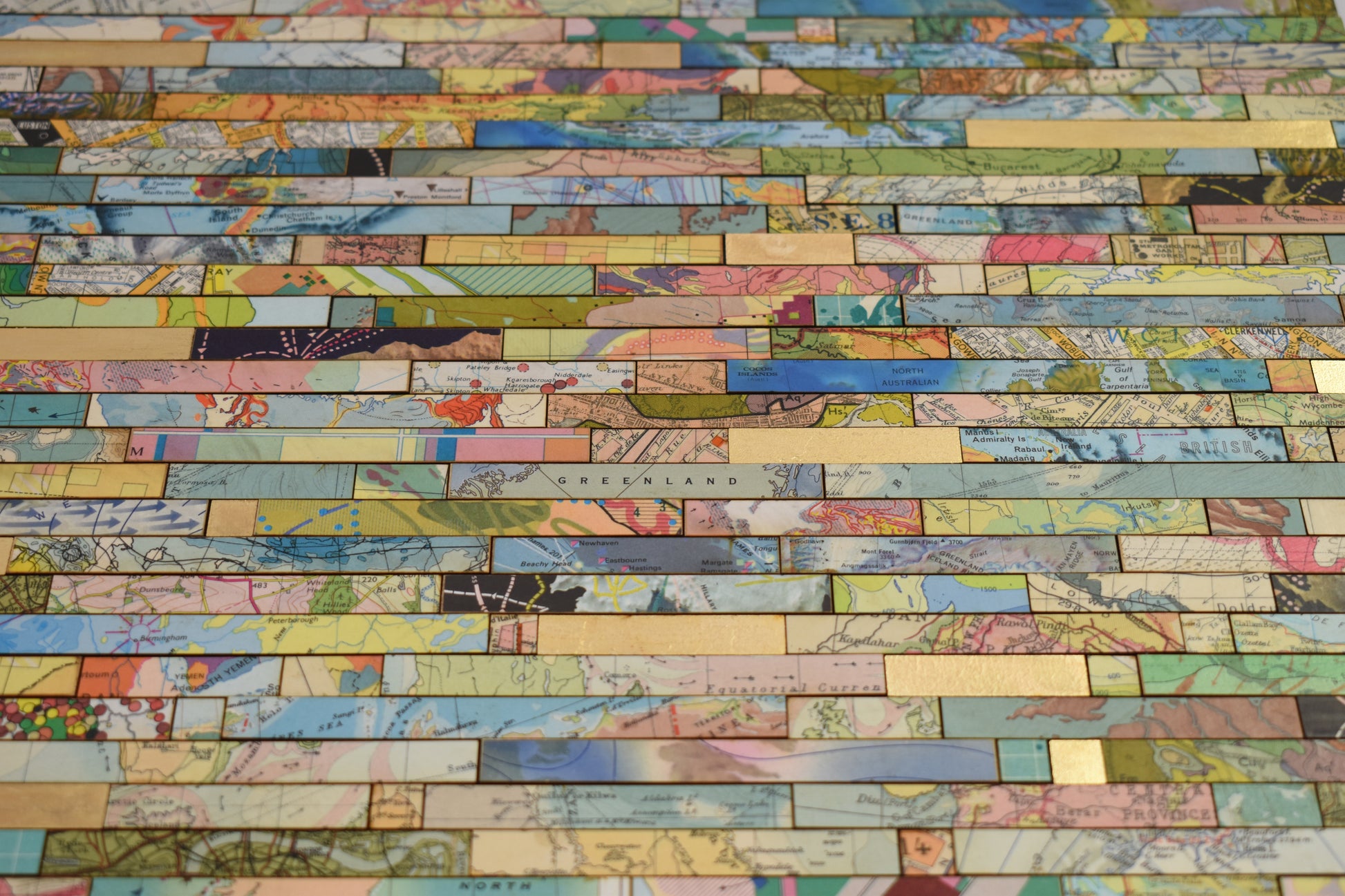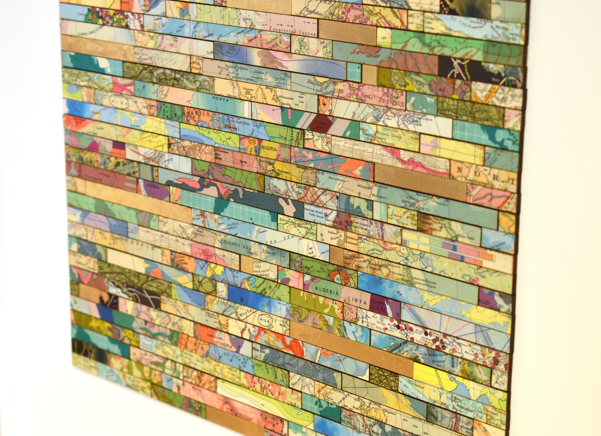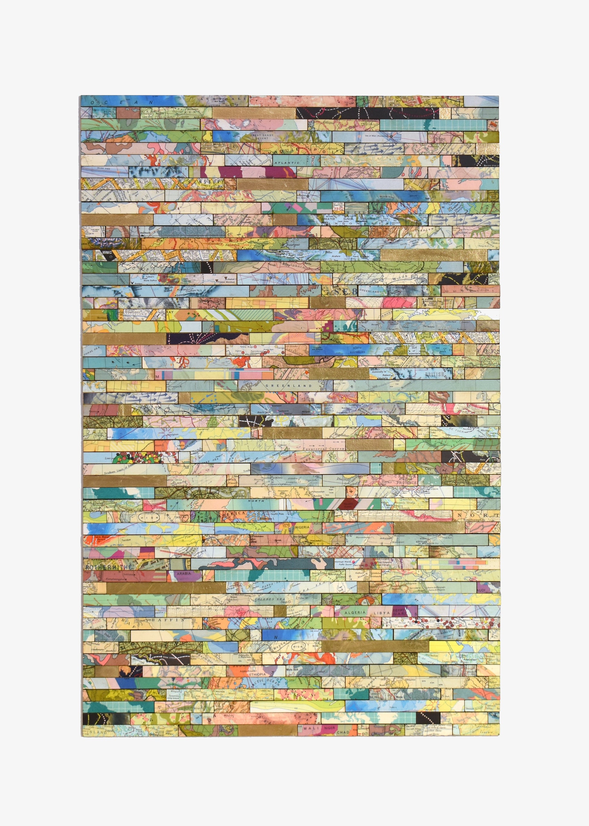Homeland presents a tightly woven field of horizontal lines composed from hand-cut strips of antique and modern maps. Its linear rhythm mimics the layered sediment of geography and memory, echoing land divided and redivided over time.