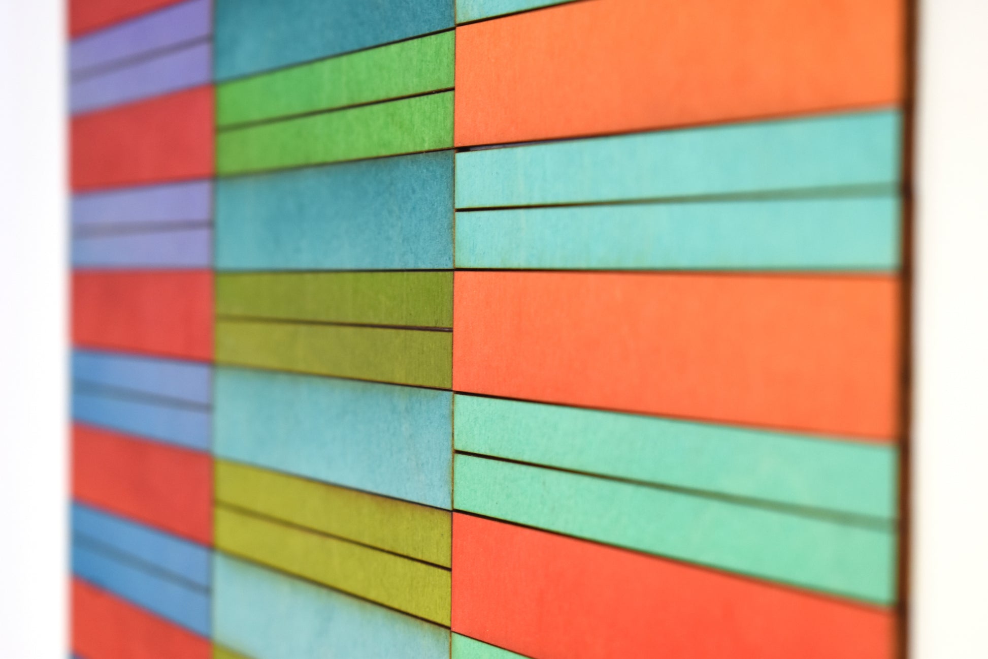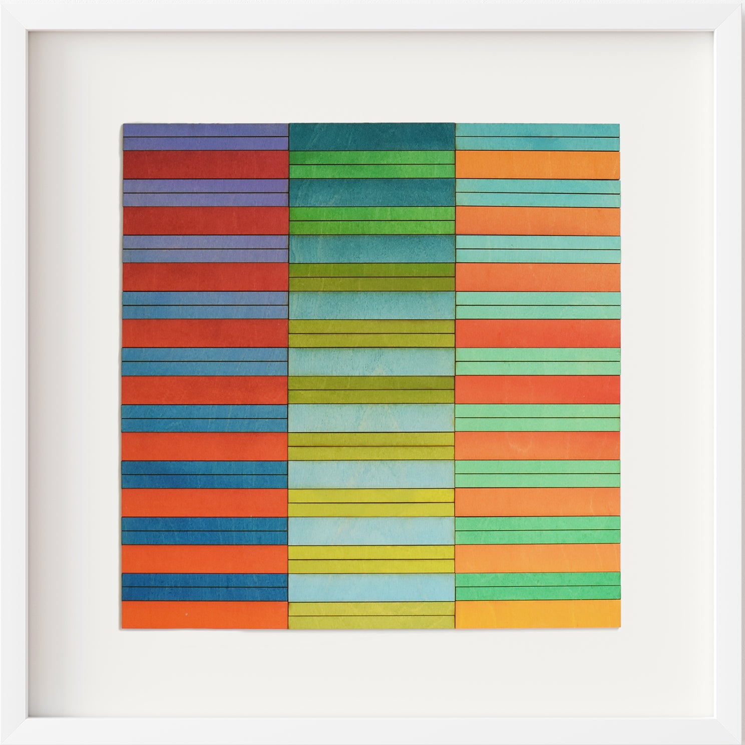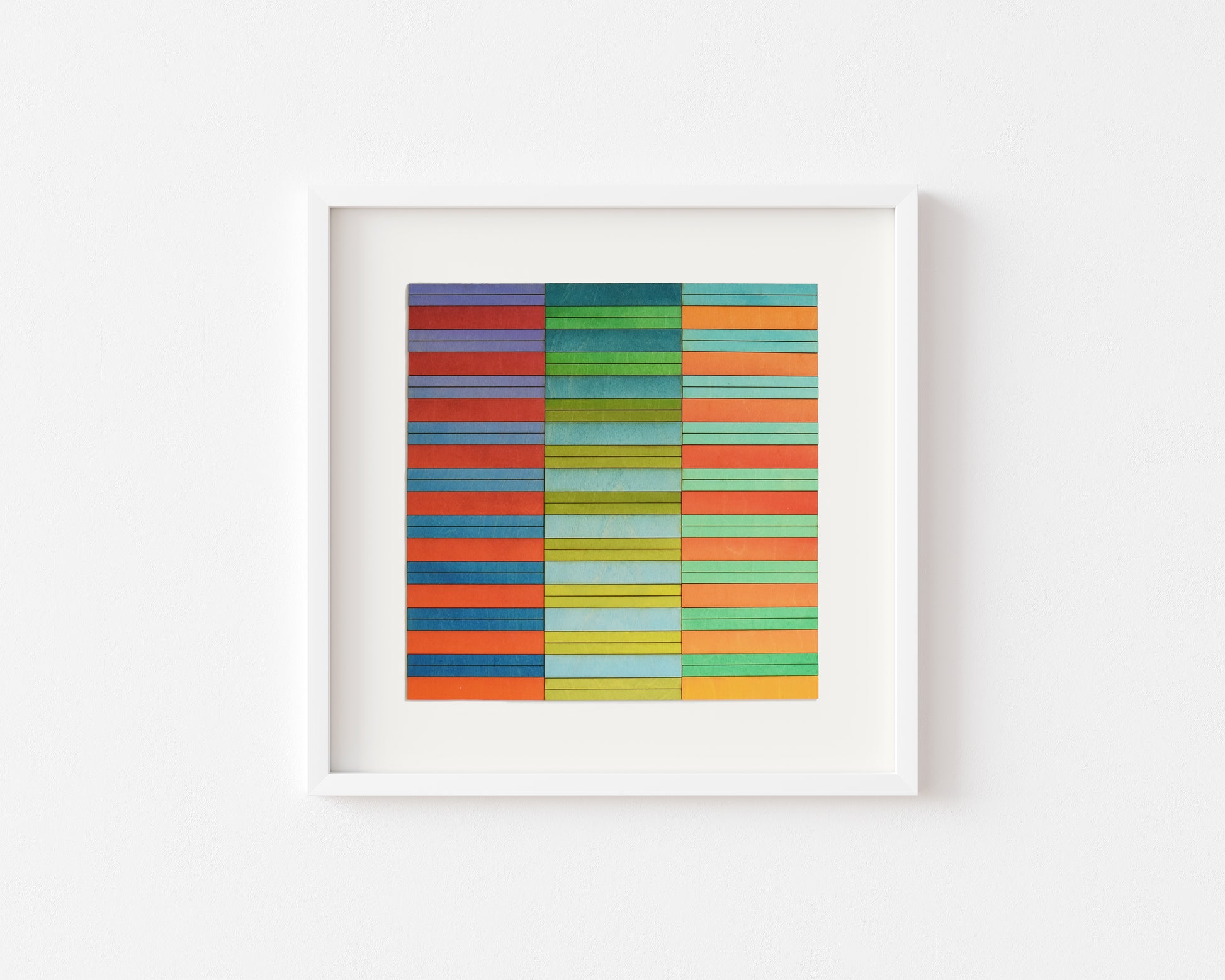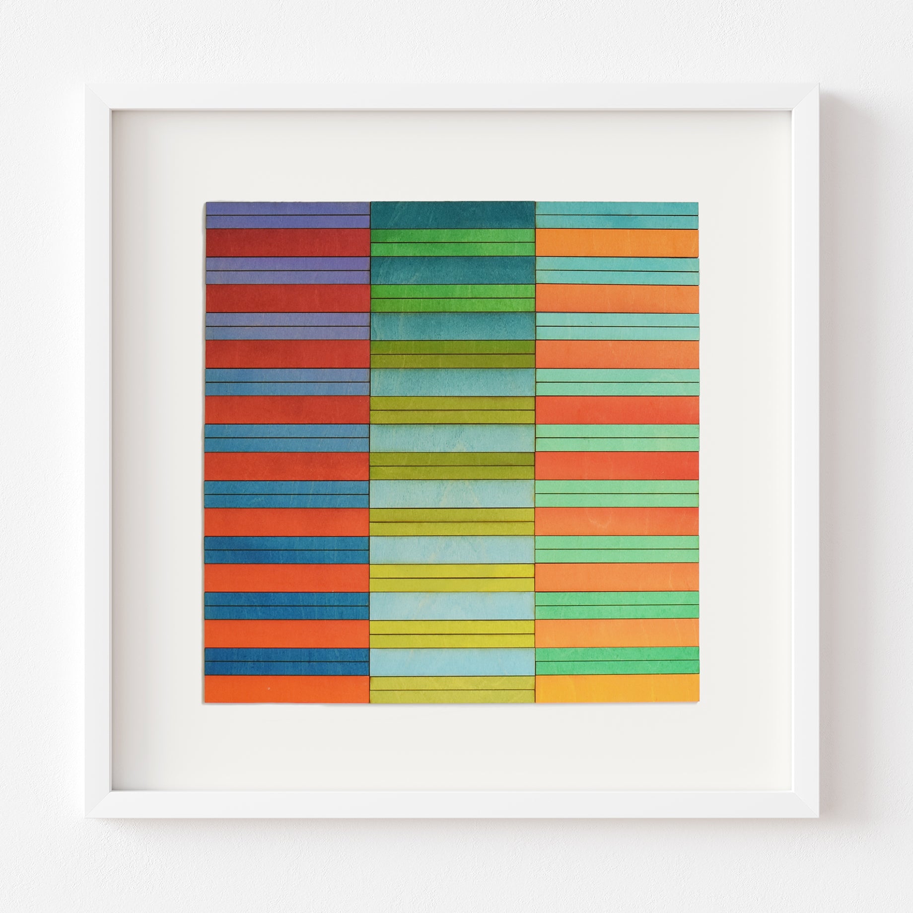 This original abstract geometric wood collage artwork is made by painting fine layers of ink, dye and acrylic paint onto birch plywood panels. I create vivid gradations of colour which are then cut into strips and blocks, then reassembled to create this striped grid combination. I use a rich combination of colours and tones which when juxtaposed to each other create a vibrating, effect. This piece is mounted on a gesso-painted white backboard.