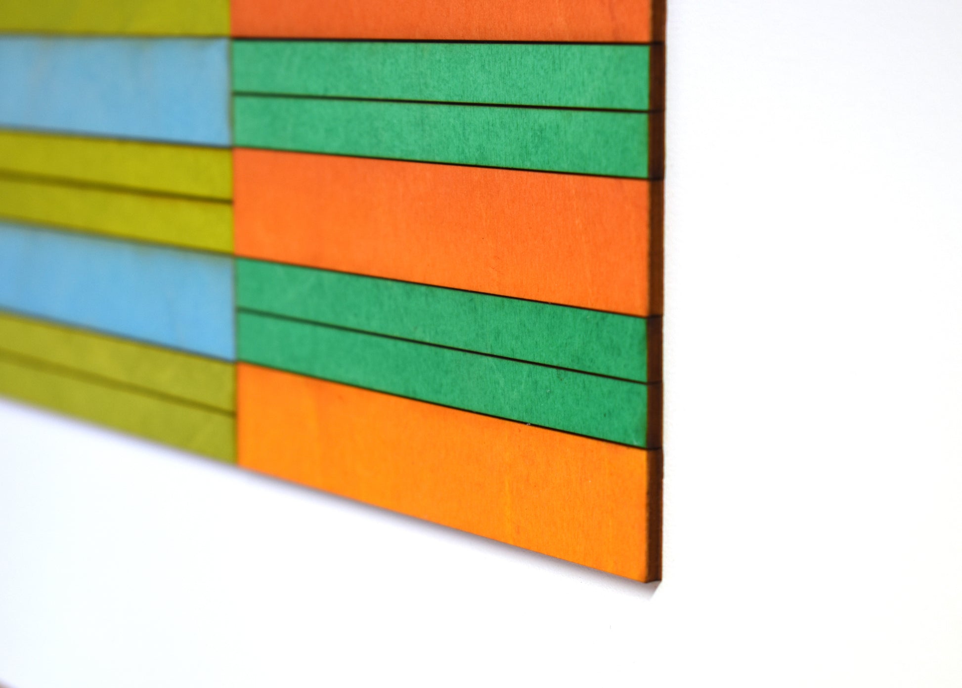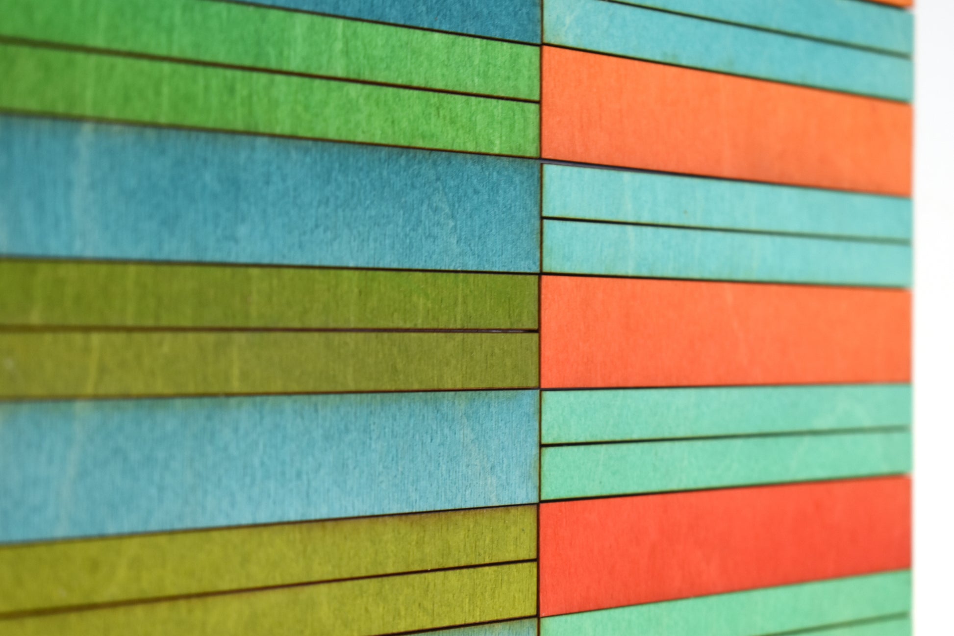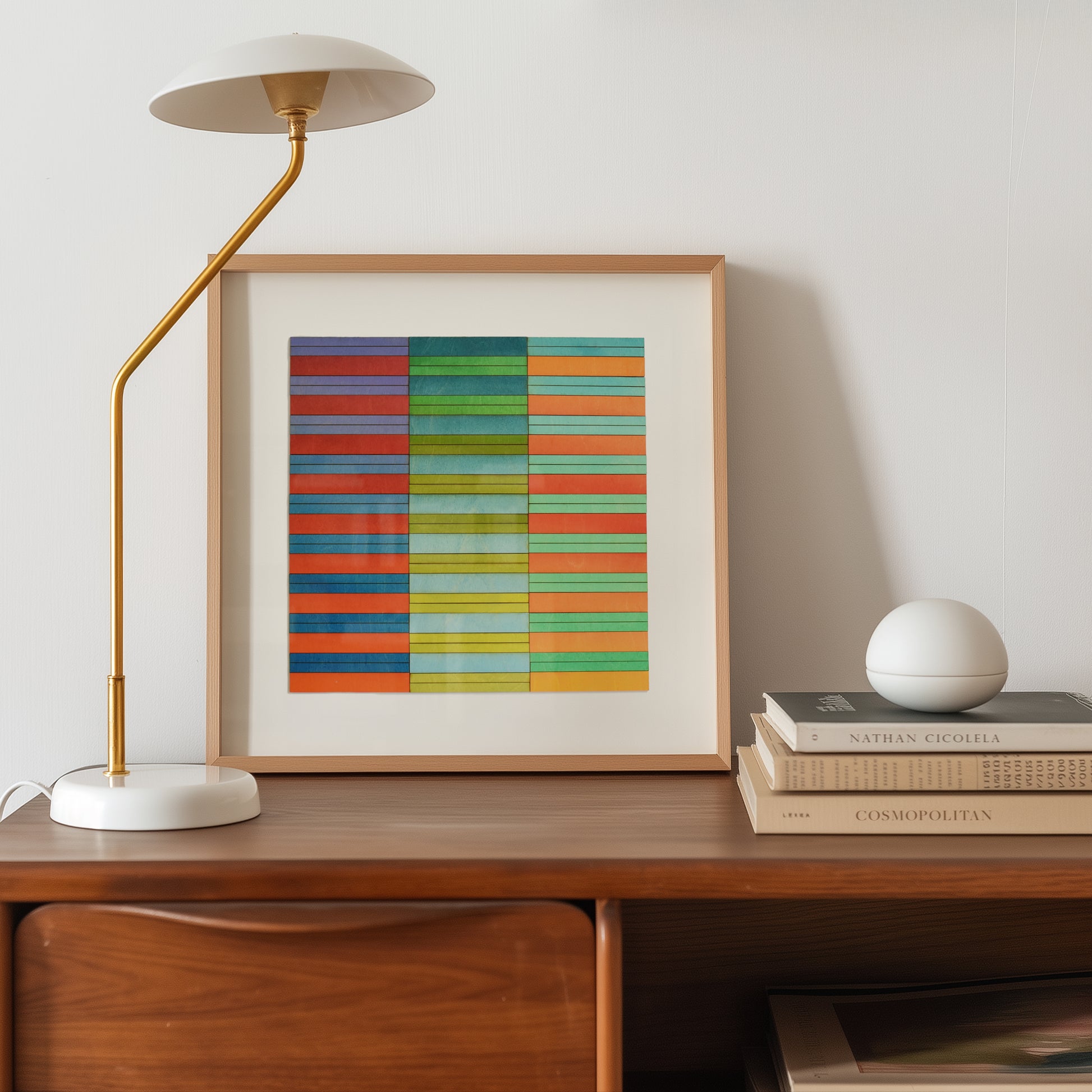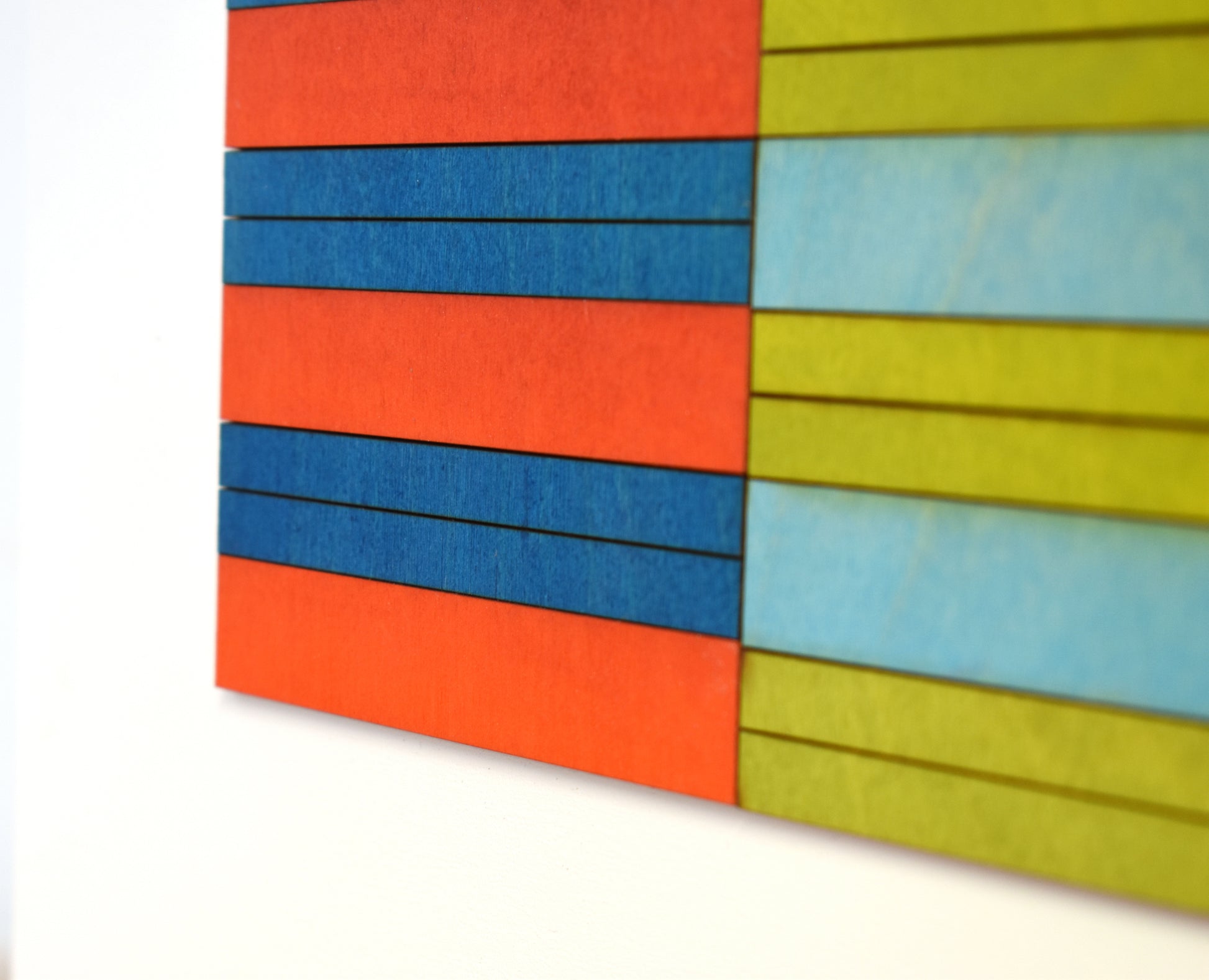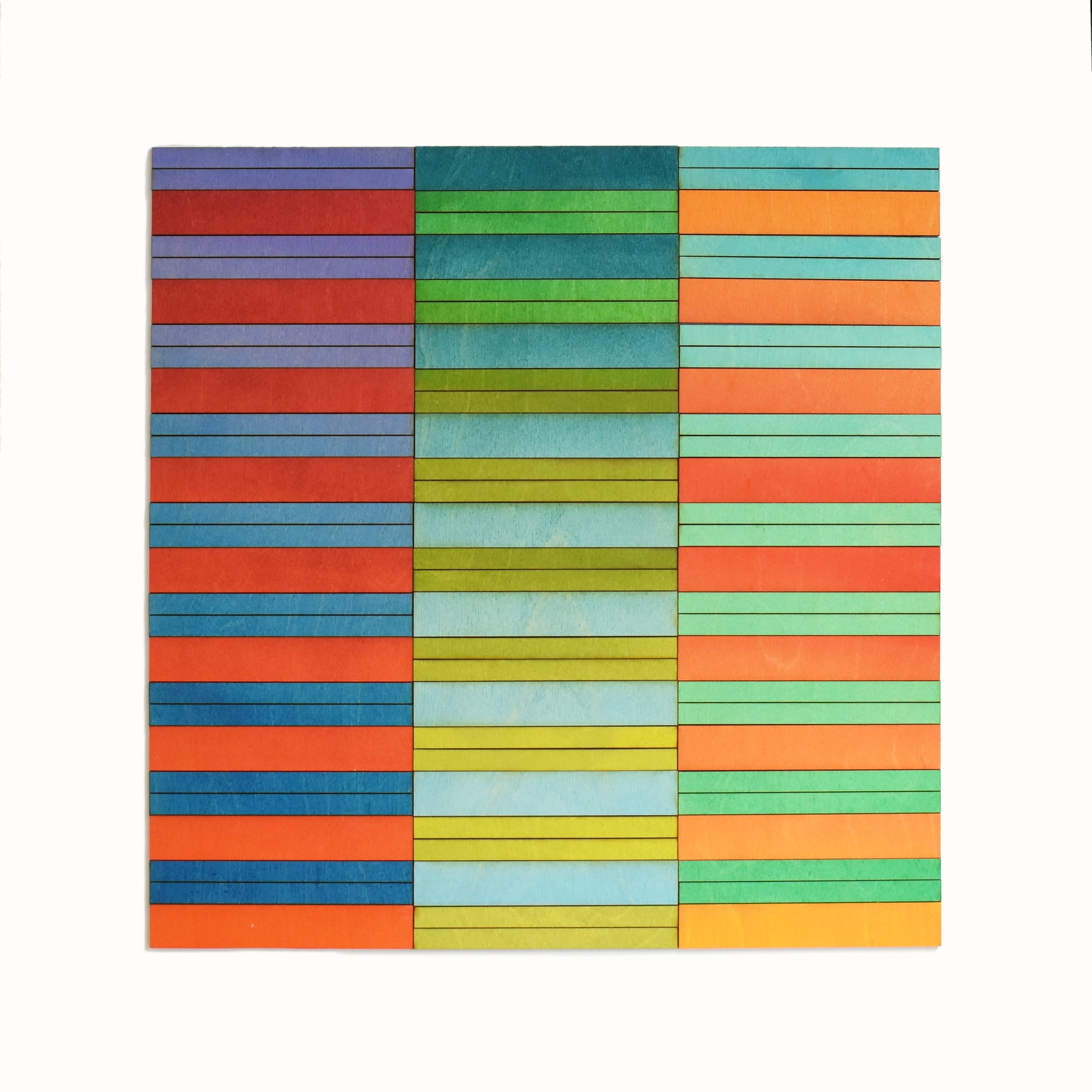 This original abstract geometric wood collage artwork is made by painting fine layers of ink, dye and acrylic paint onto birch plywood panels. I create vivid gradations of colour which are then cut into strips and blocks, then reassembled to create this striped grid combination. I use a rich combination of colours and tones which when juxtaposed to each other create a vibrating, effect. This piece is mounted on a gesso-painted white backboard.