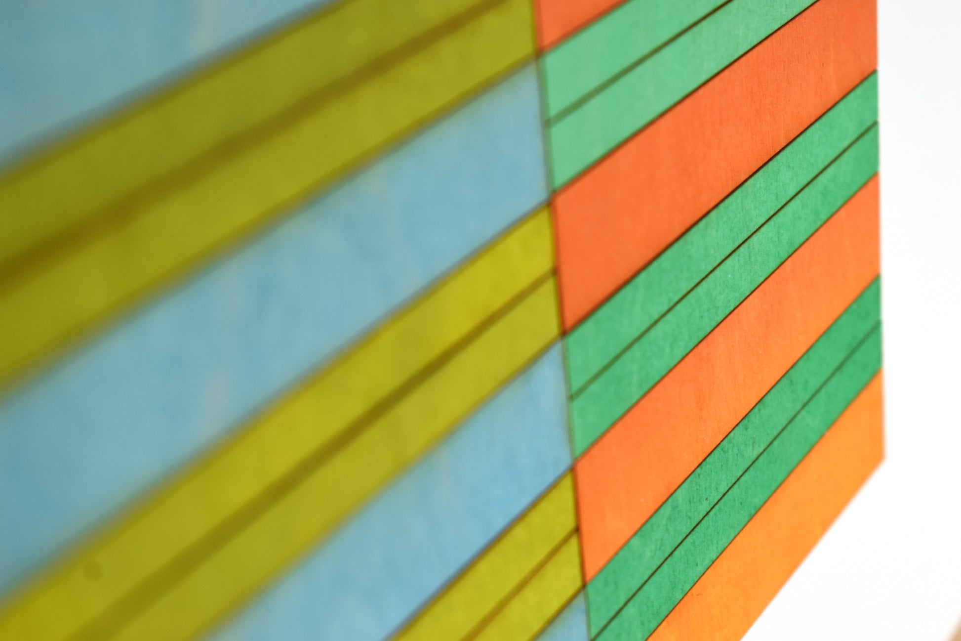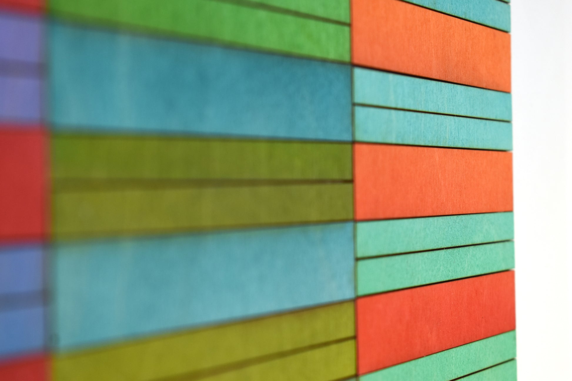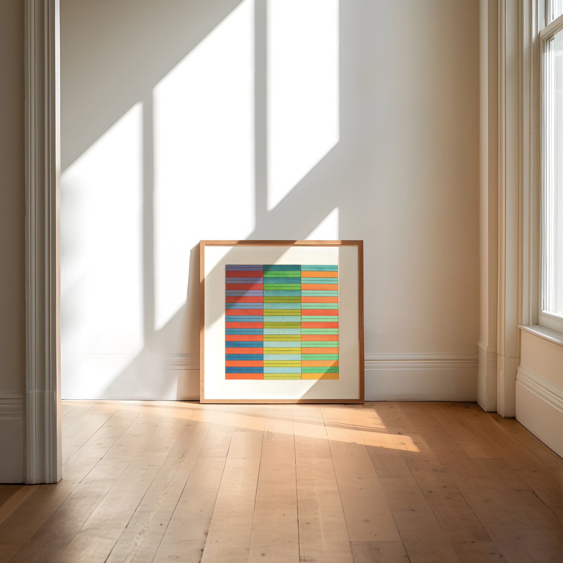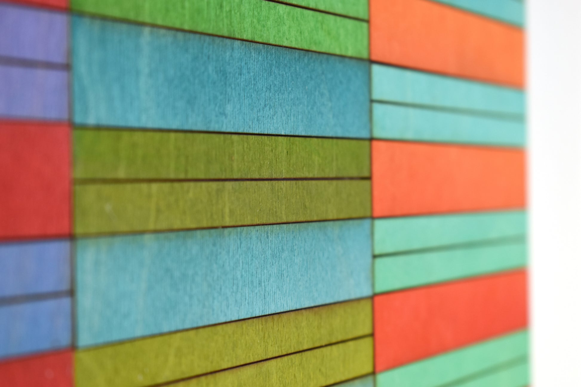 This original abstract geometric wood collage artwork is made by painting fine layers of ink, dye and acrylic paint onto birch plywood panels. I create vivid gradations of colour which are then cut into strips and blocks, then reassembled to create this striped grid combination. I use a rich combination of colours and tones which when juxtaposed to each other create a vibrating, effect. This piece is mounted on a gesso-painted white backboard.