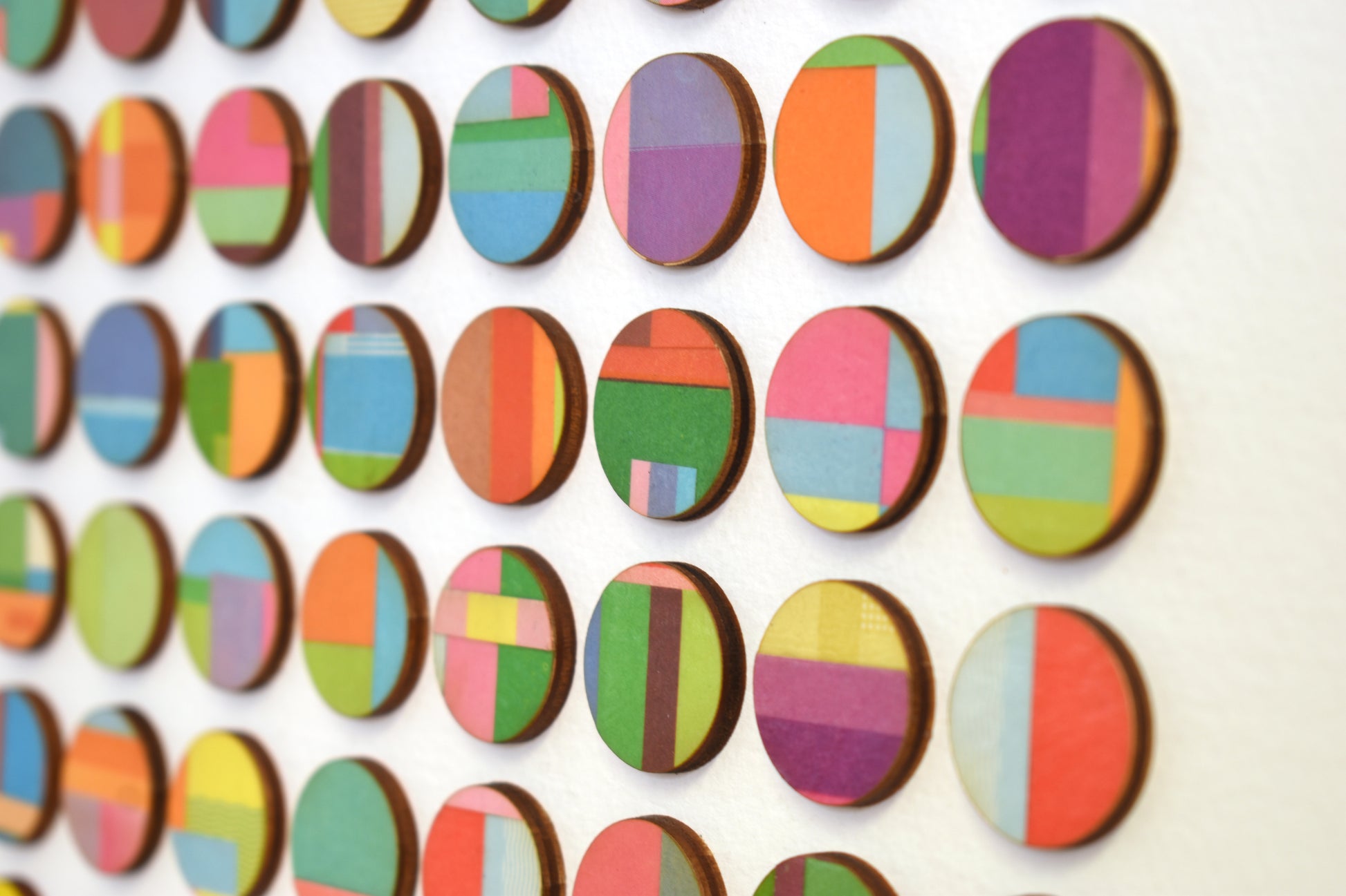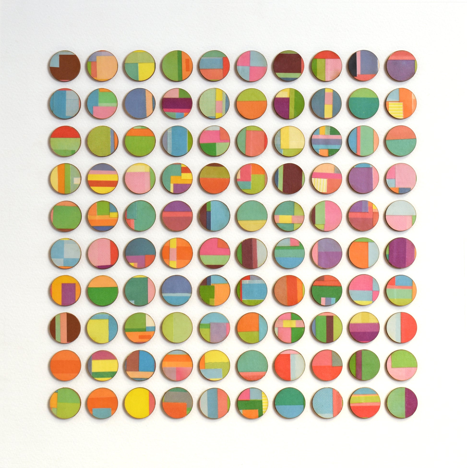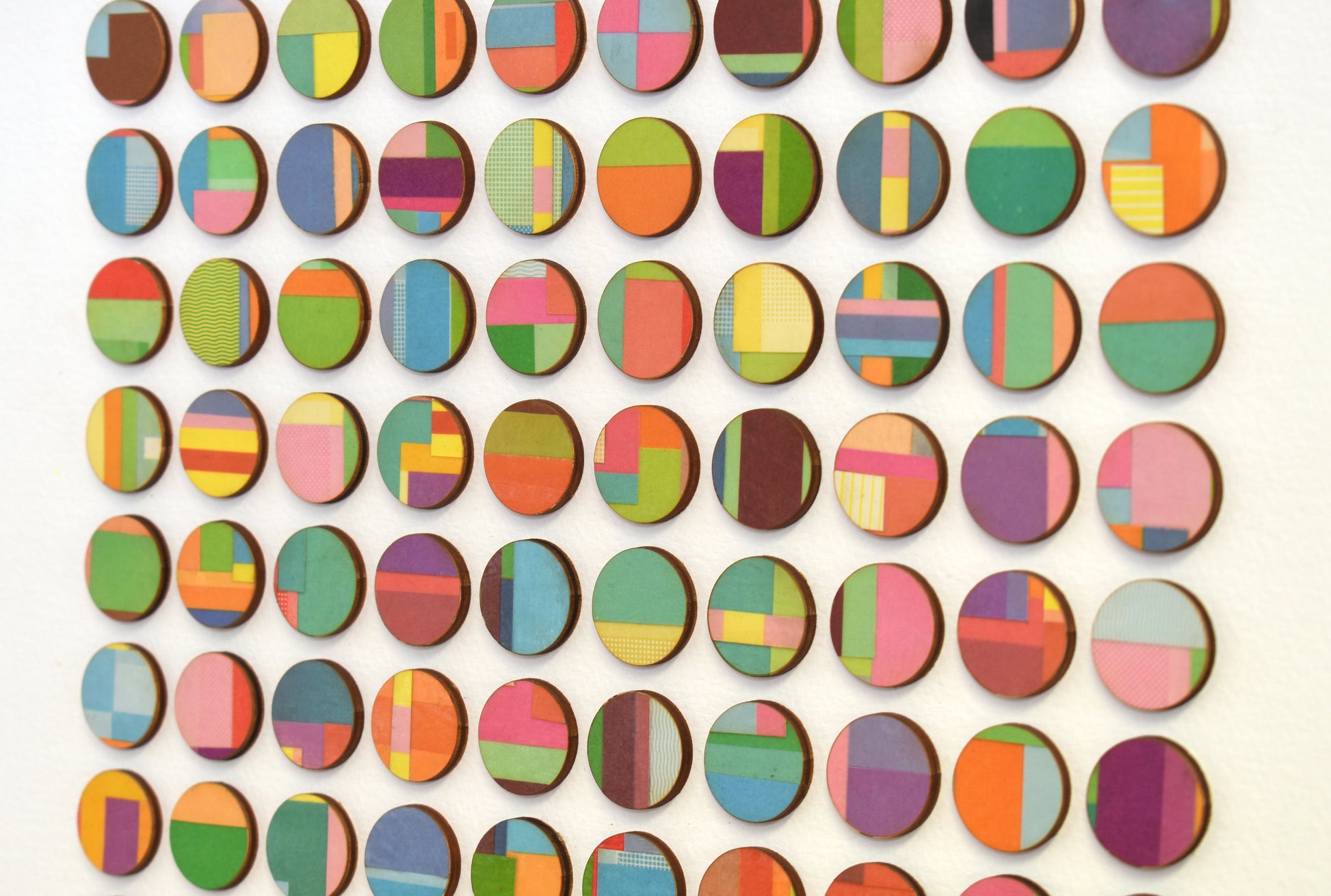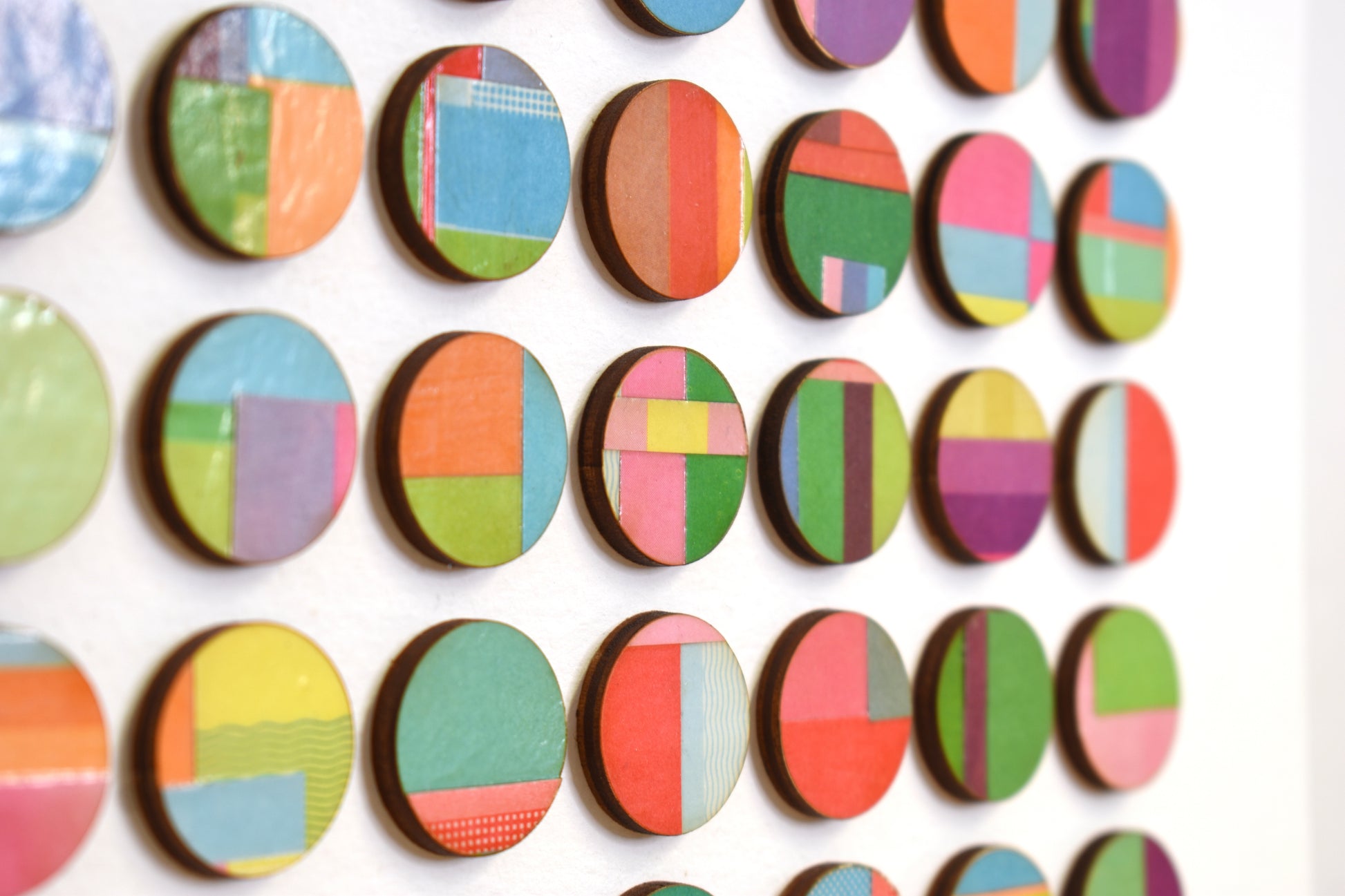This artwork comprises of dots hand collaged with vintage book paper. 3mm birch wood panels faced with strips of layered pages cut from vintage cookery books. Each detail is selected and cut from the book before being hand bonded onto birch wood and laser cut into dots.