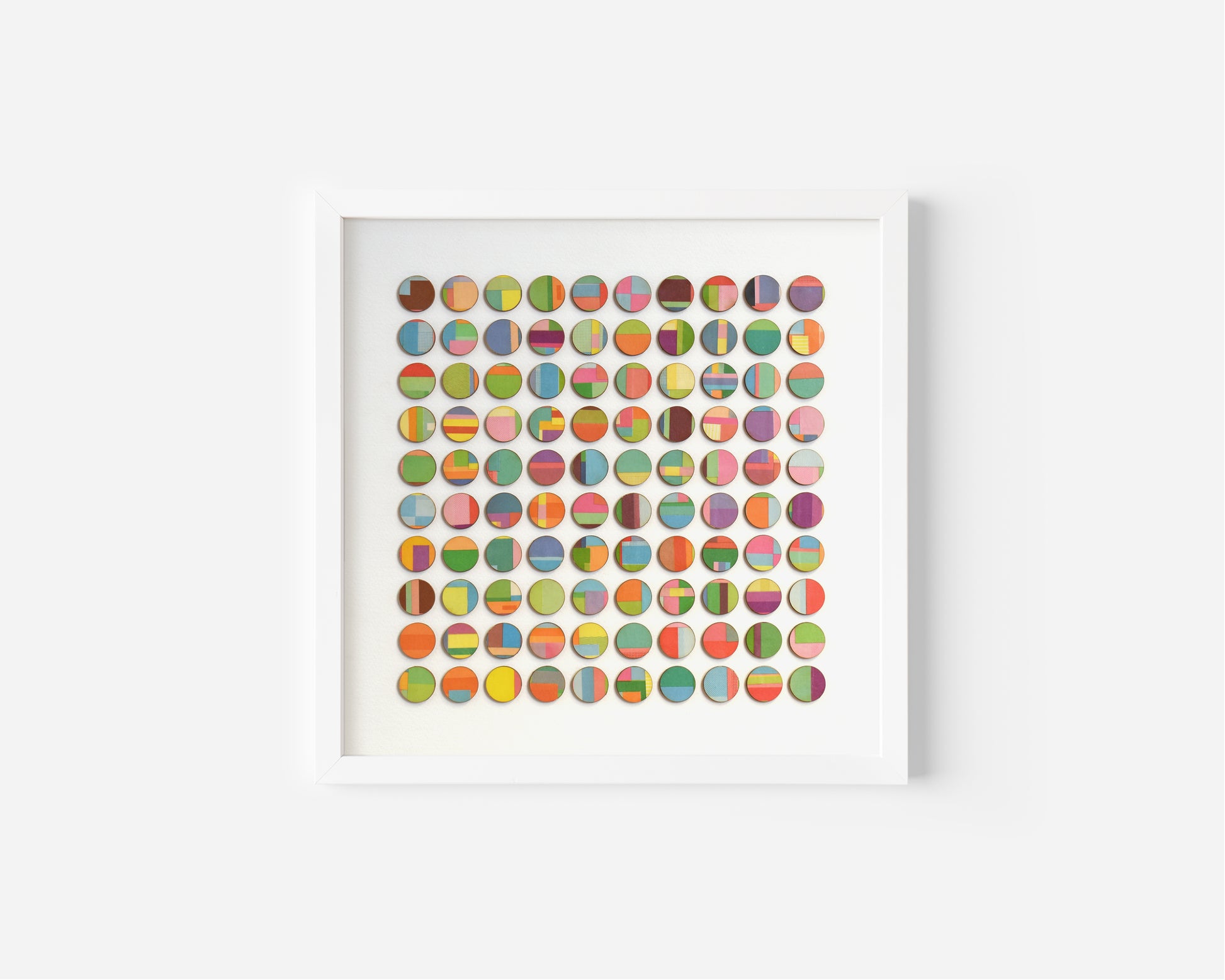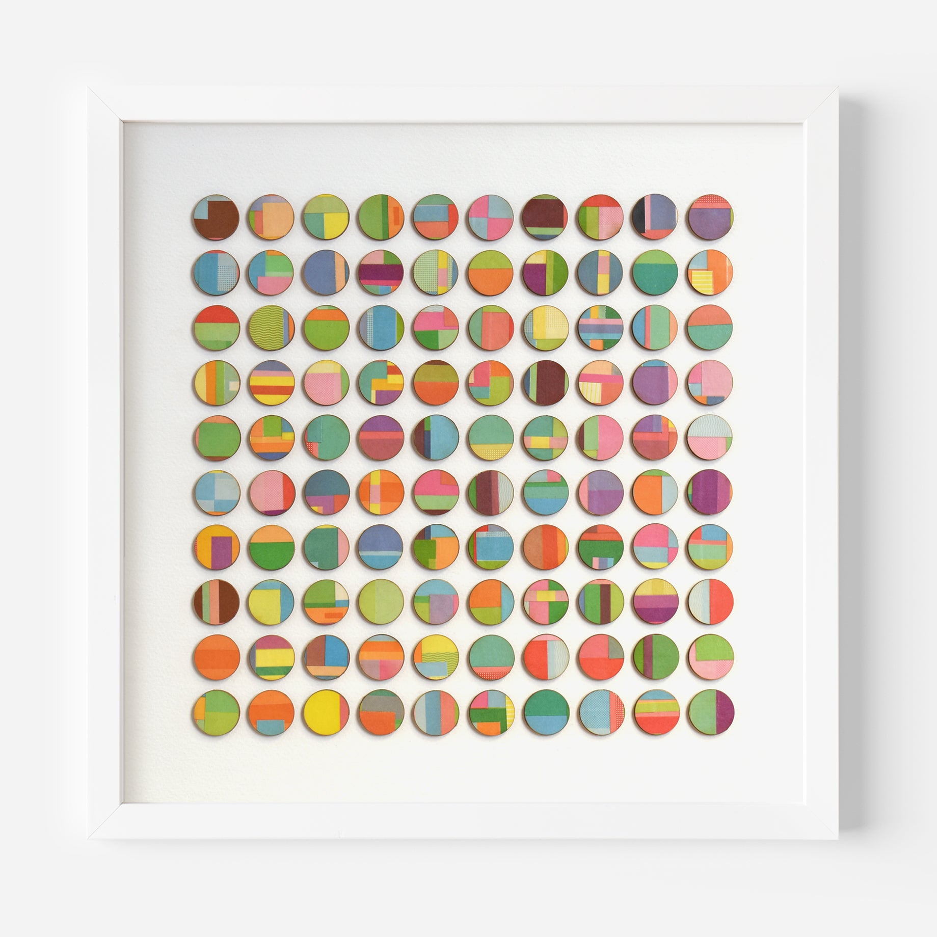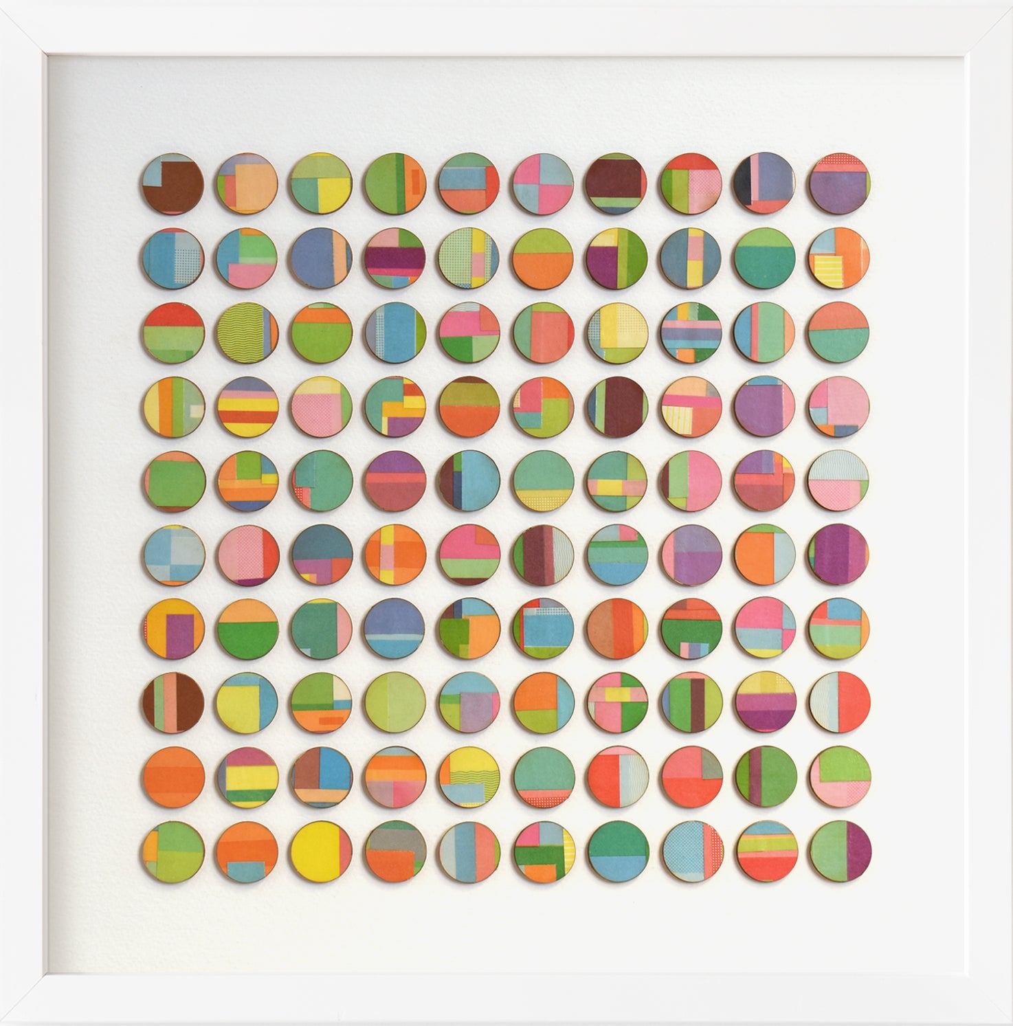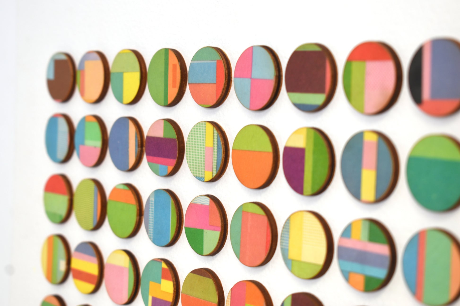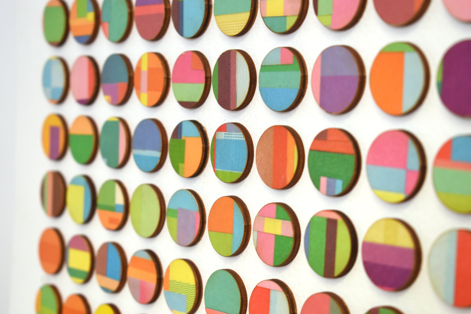 This artwork comprises of dots hand collaged with vintage book paper. 3mm birch wood panels faced with strips of layered pages cut from vintage cookery books. Each detail is selected and cut from the book before being hand bonded onto birch wood and laser cut into dots.