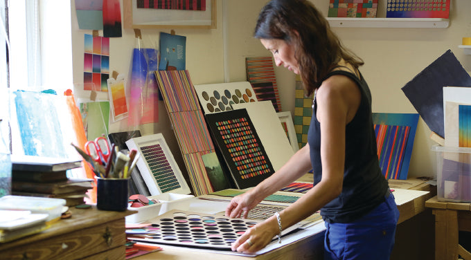 Vintage sky and mountain tops images collected over many years, bonded onto wood then cut into 3cm dots. Assembled into a geometric grid composition.