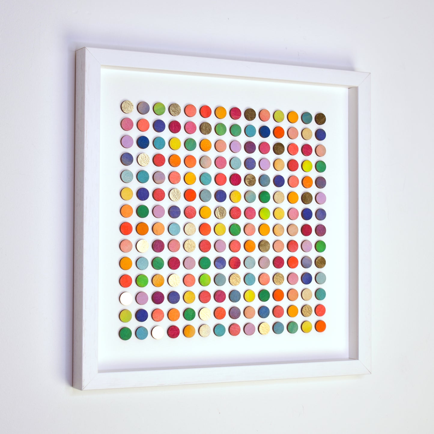 This art work comprises 196 handpainted 12mm dots cut from birch wood panels painted in a carefully blended colour palette. I then meticulously select each dot by colour to create a geometric collage which incorporates contrasting gold leaf dots. I use a mixture of ink, acrylic, wood stain and watercolour to achieve the this palette.