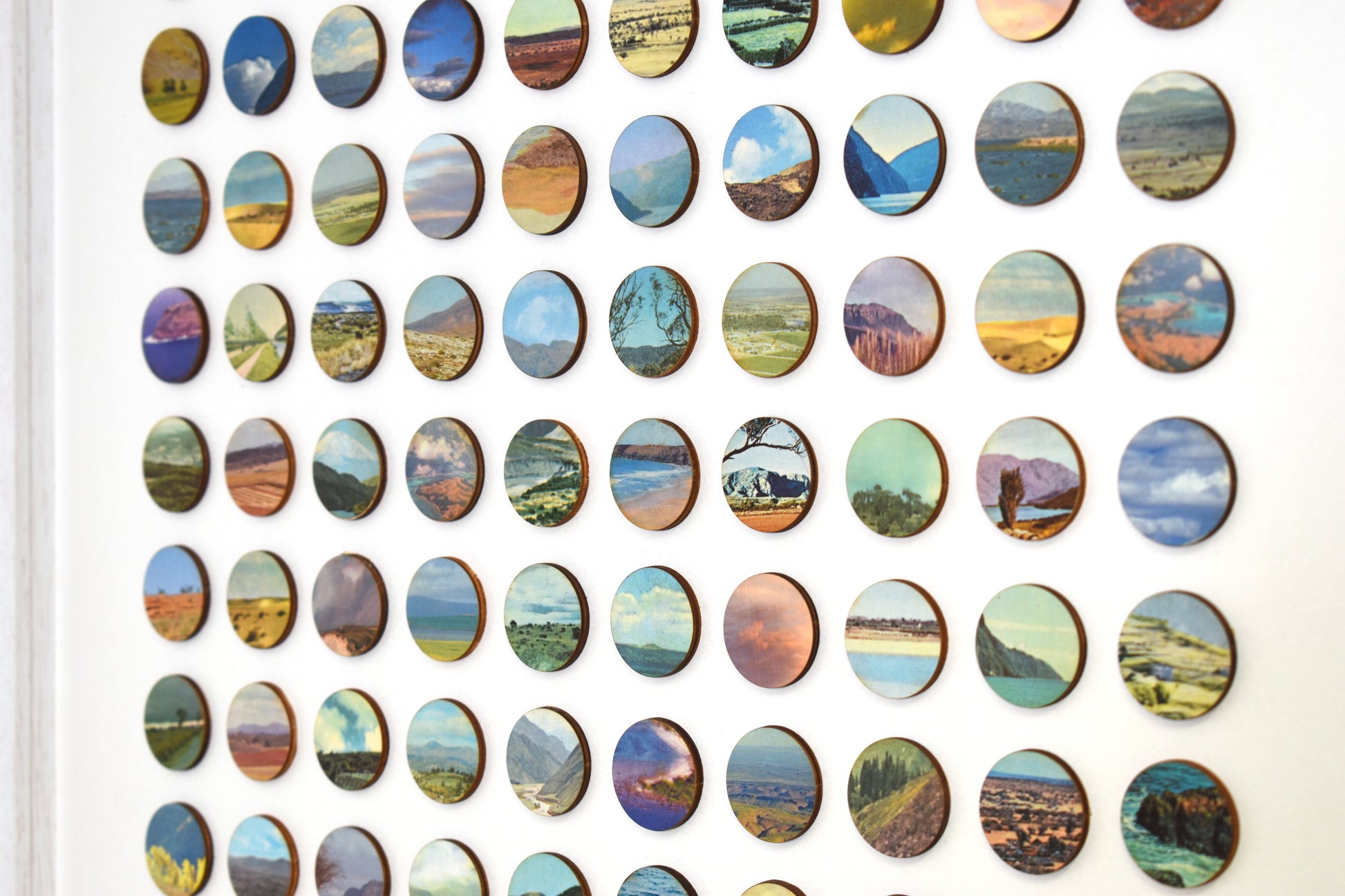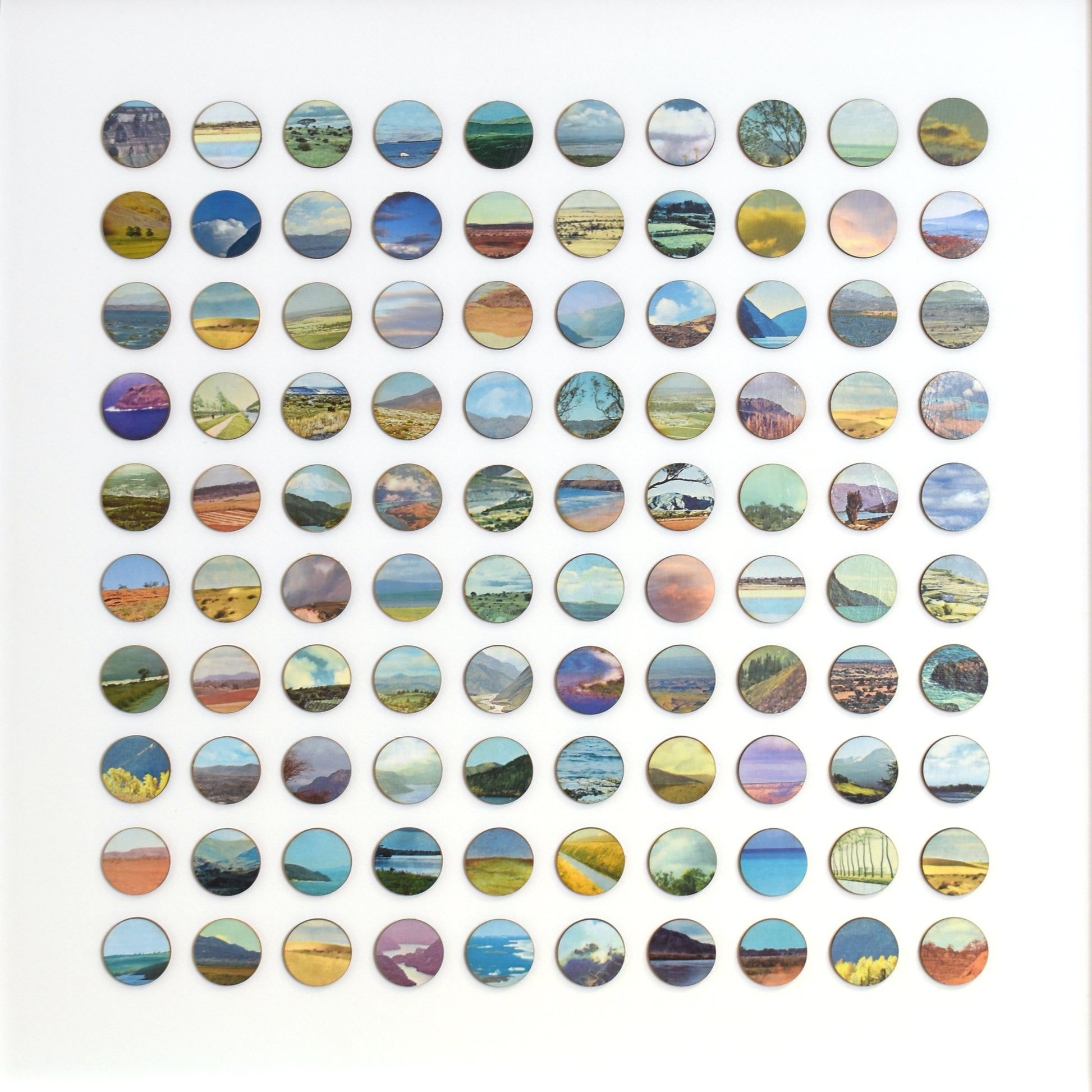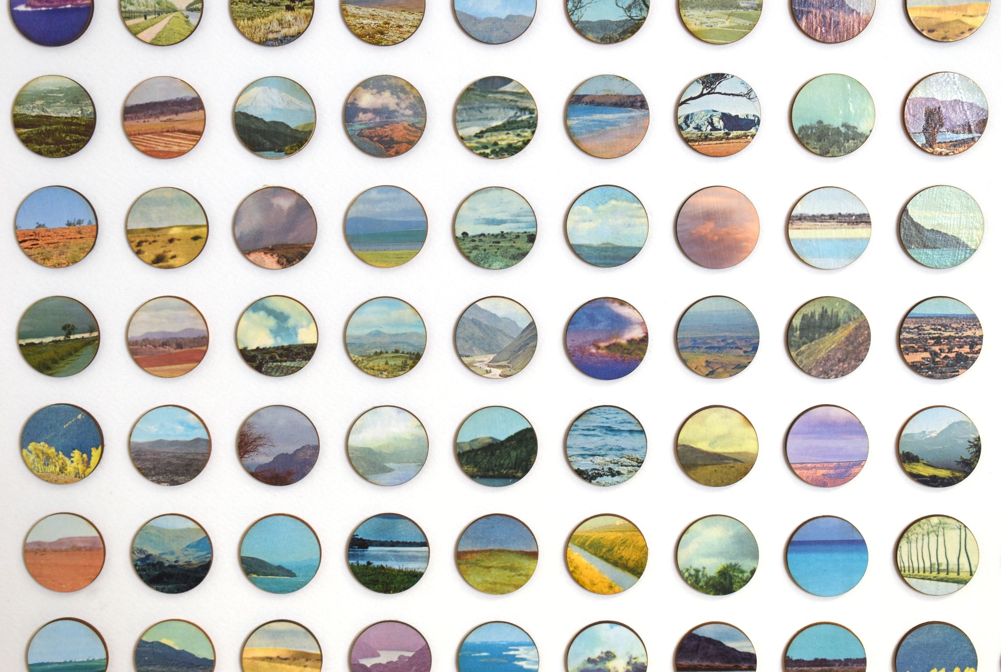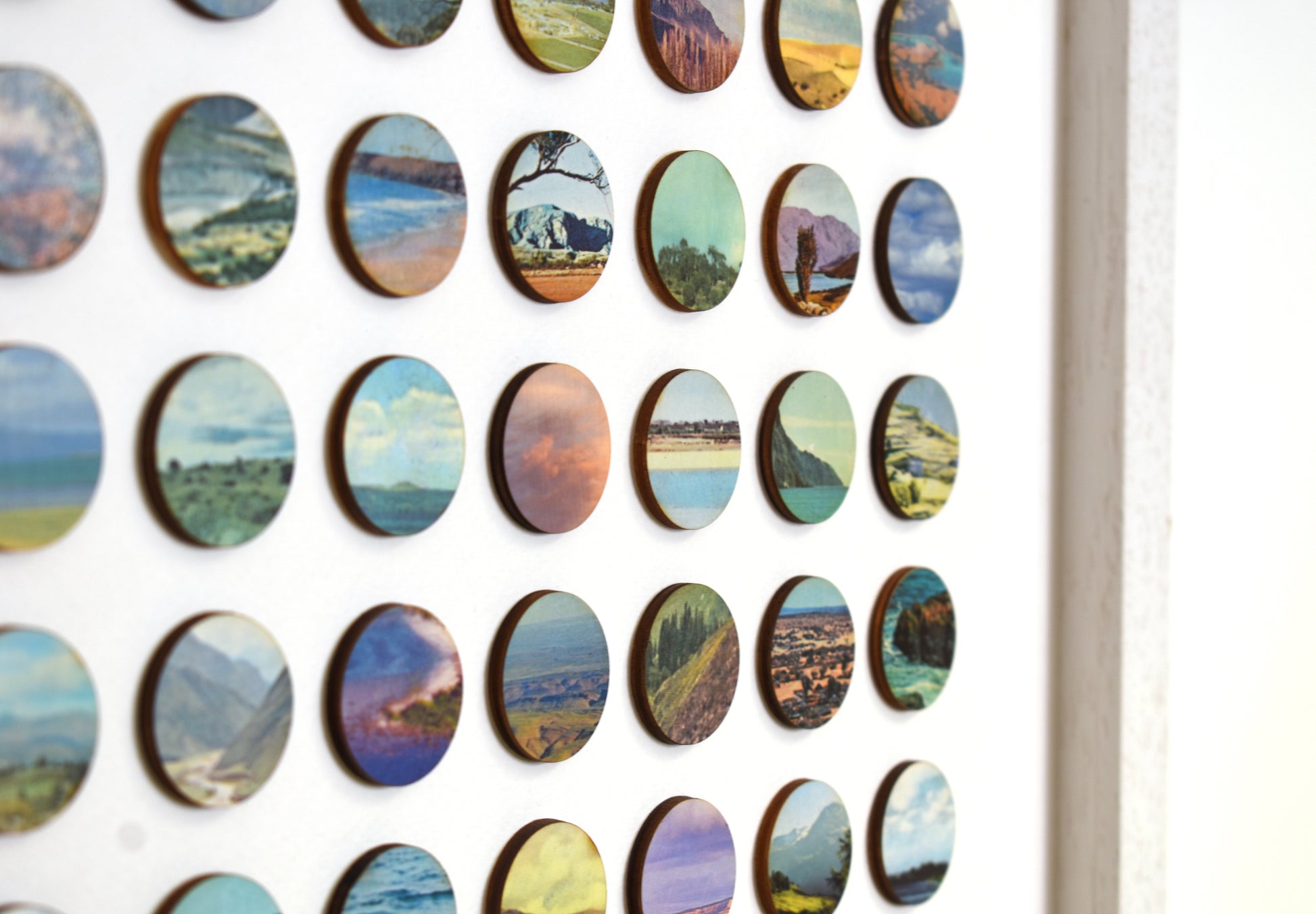 Each original plate is carefully removed from the book, hand-bonded onto birch plywood to create a tactile, painted surface, and then laser cut into 16mm dots. These individual fragments are reassembled into a structured geometric field, transforming dispersed landscapes into a unified whole.