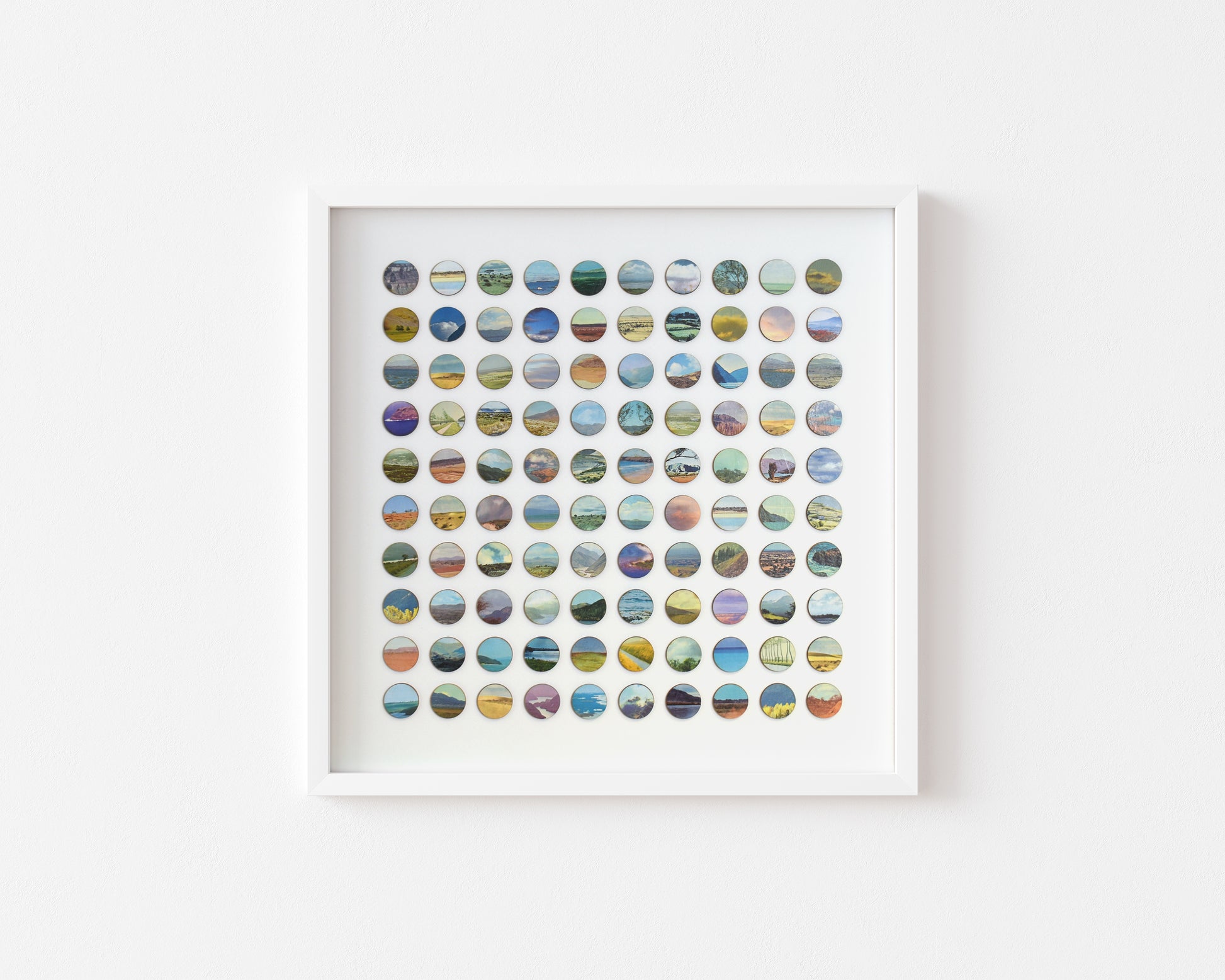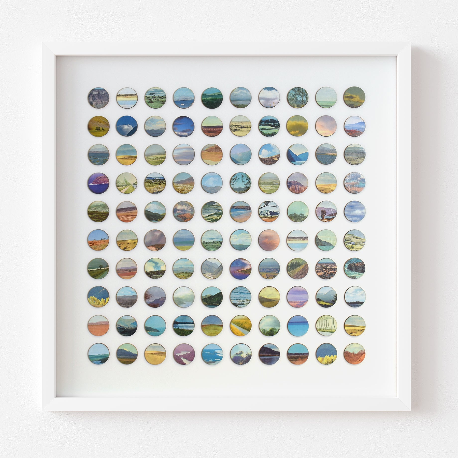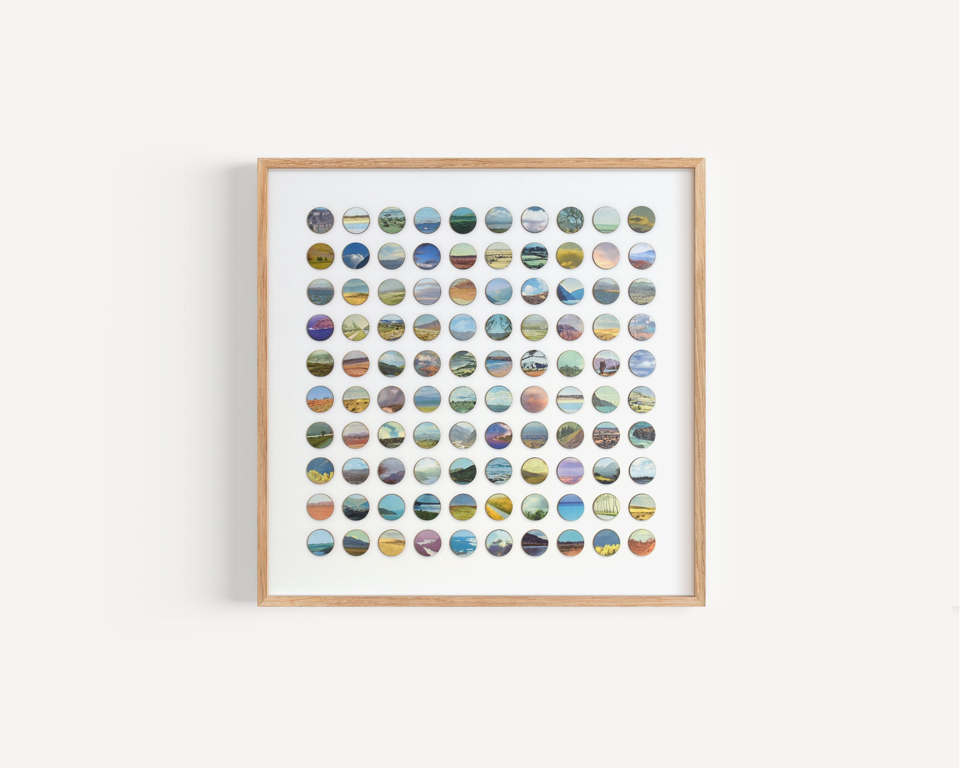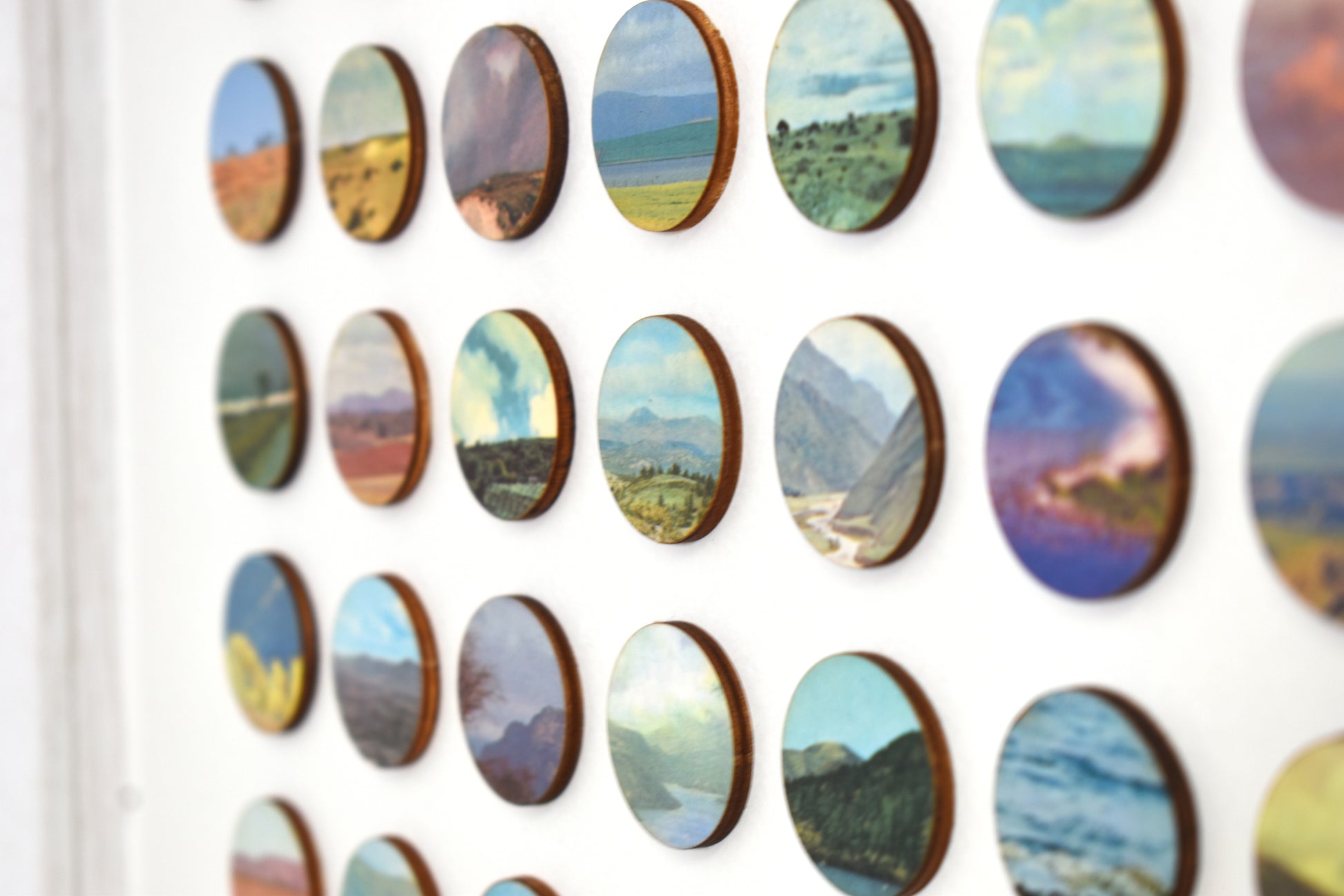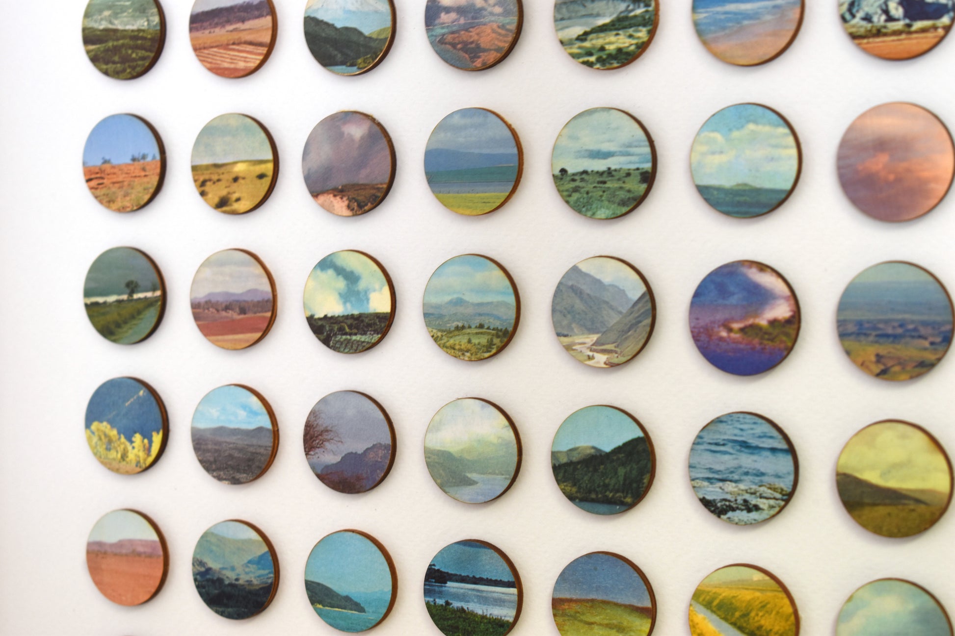 Each original plate is carefully removed from the book, hand-bonded onto birch plywood to create a tactile, painted surface, and then laser cut into 16mm dots. These individual fragments are reassembled into a structured geometric field, transforming dispersed landscapes into a unified whole.