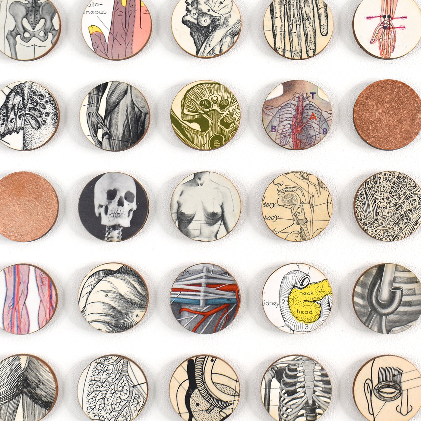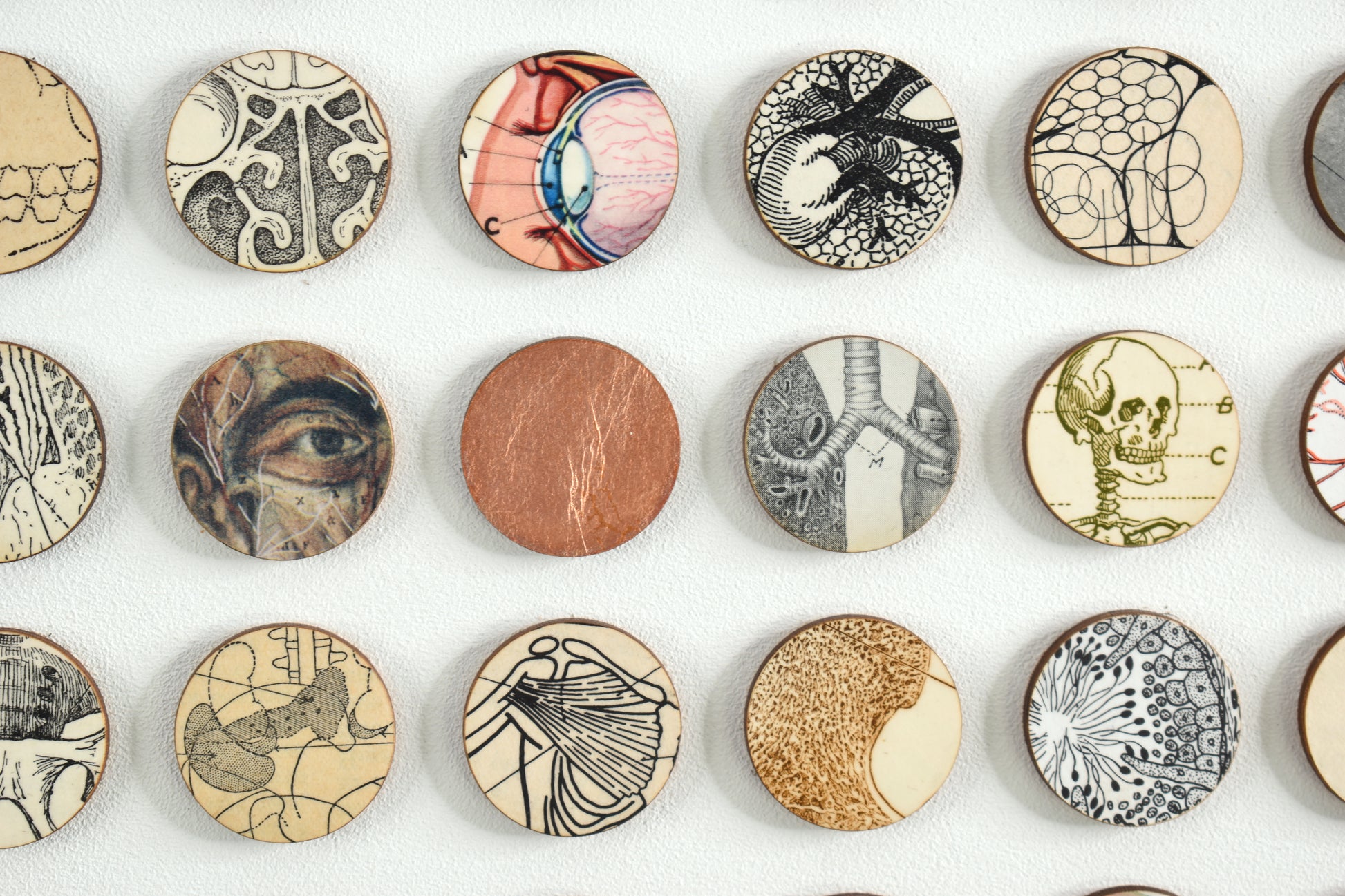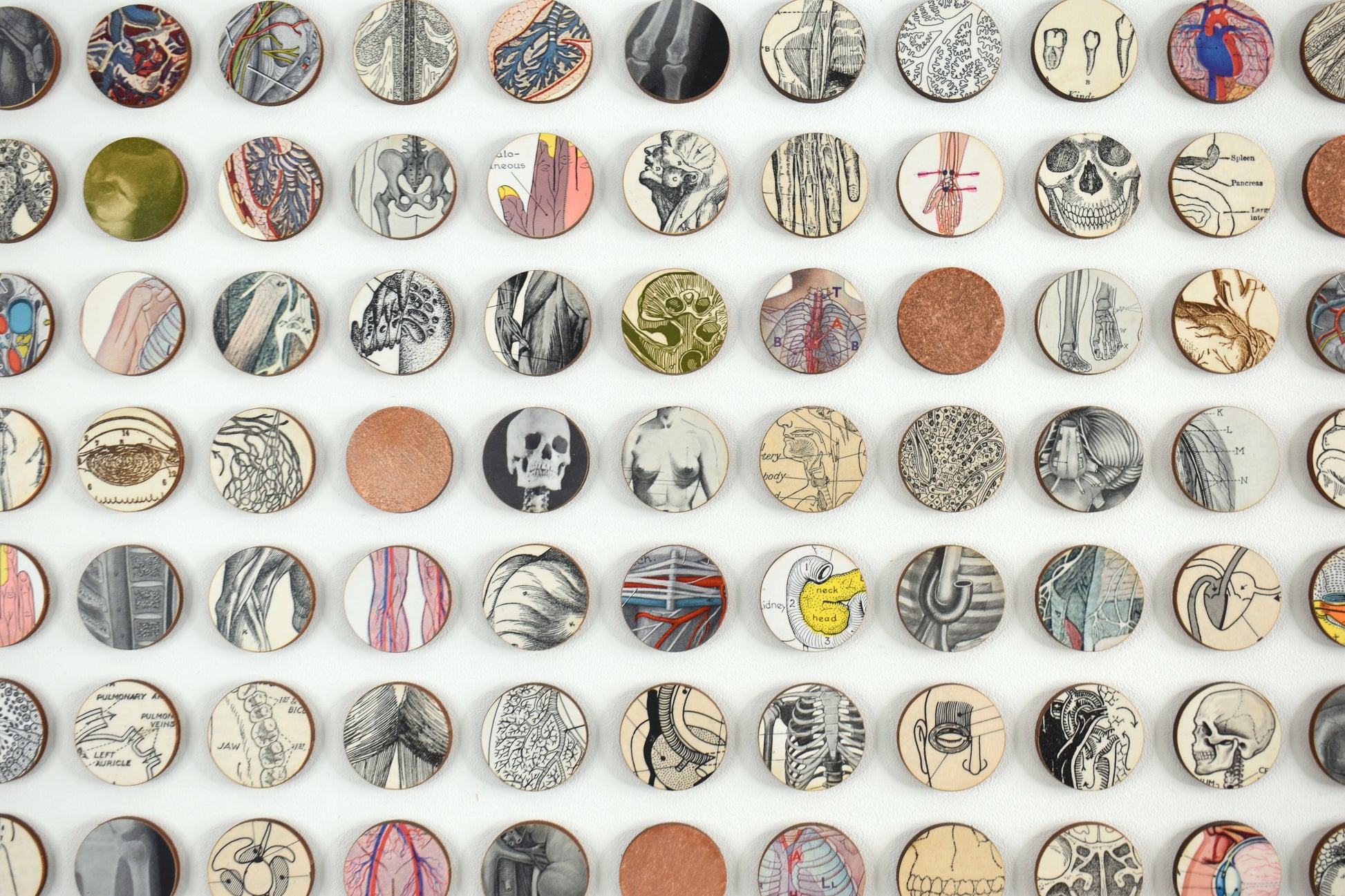 This art work comprises 324 raised 3cm dots cut from birch wood panels and faced in details taken from anatomical diagrams and images collected from vintage encyclopaedias, medical text books and journals. The composition is interspersed with dots painted in copper.