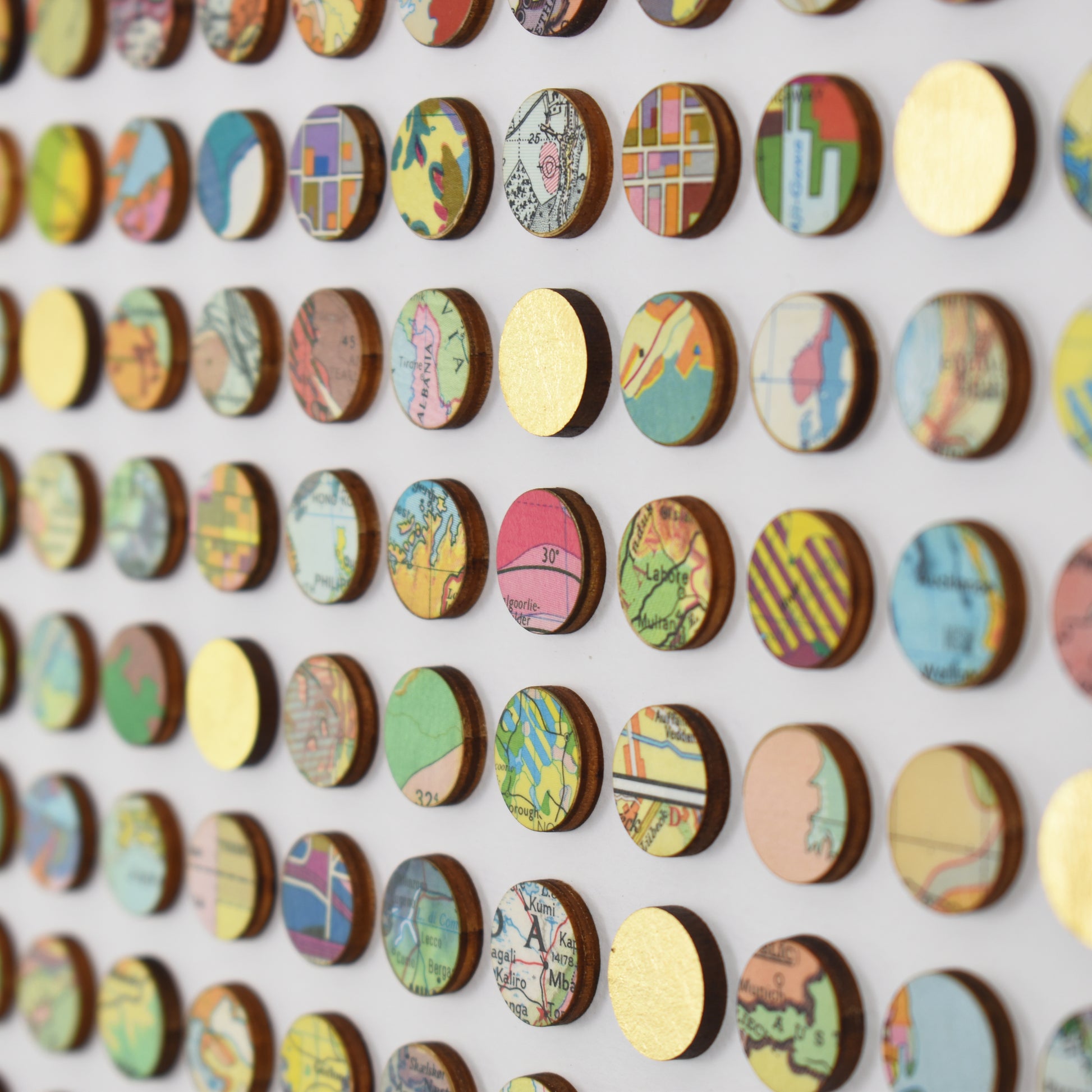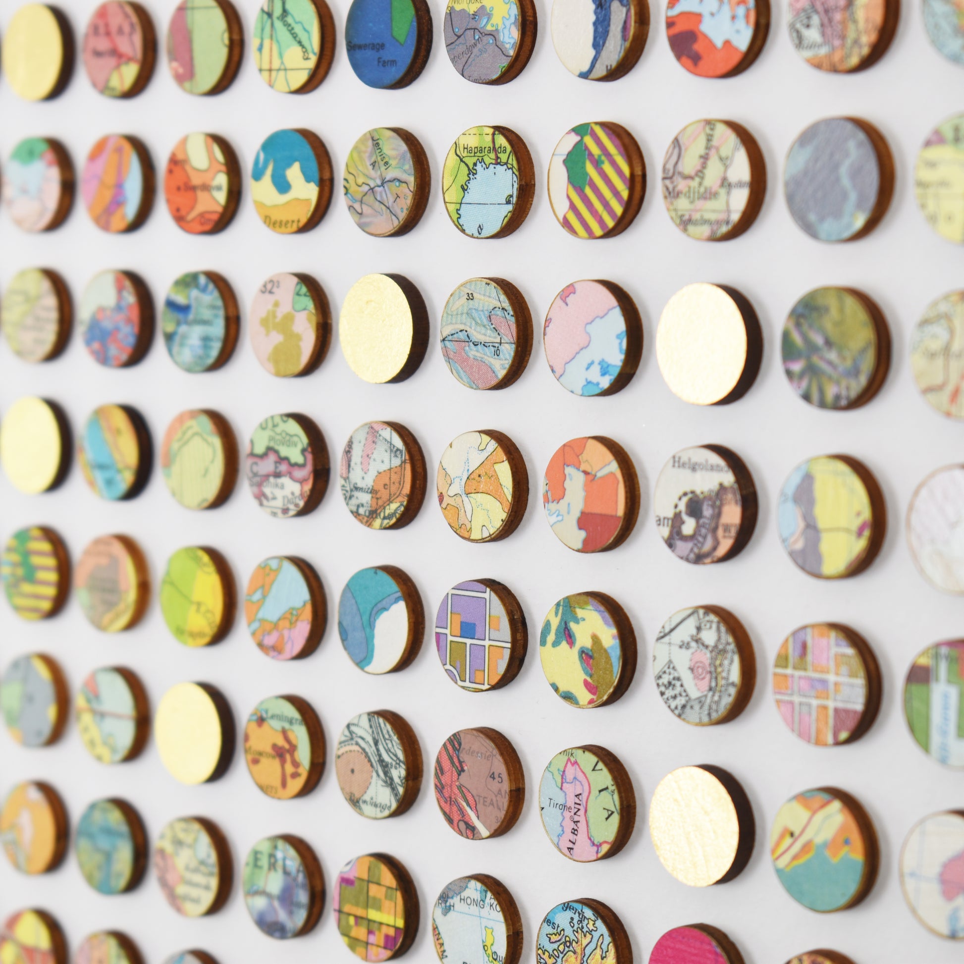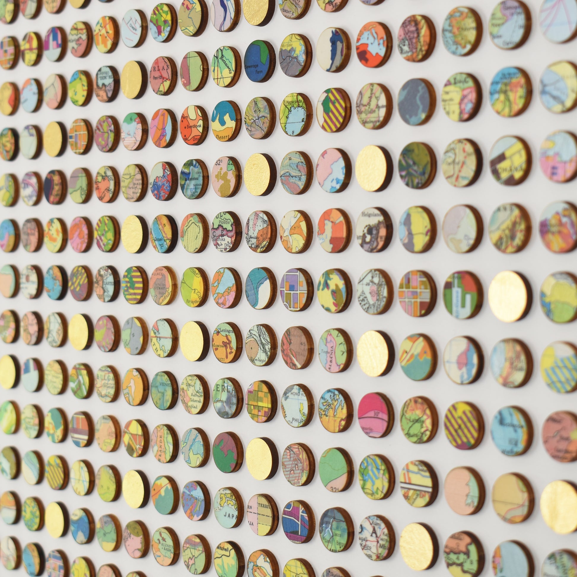This art work comprises 324 1.6cm dots cut from birch wood panels and faced in vintage map featuring locations from all over the world. The composition is lifted with the occasional gold leaf dot.