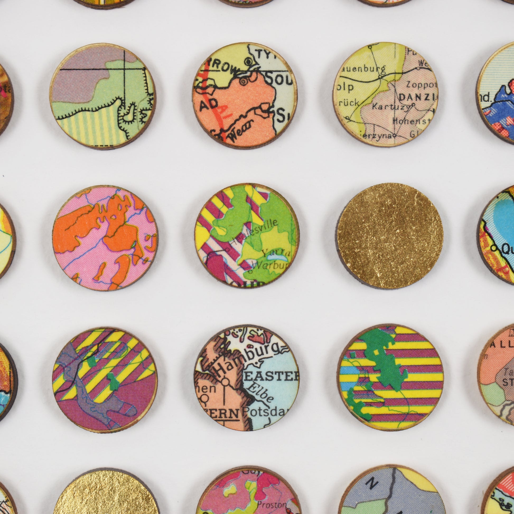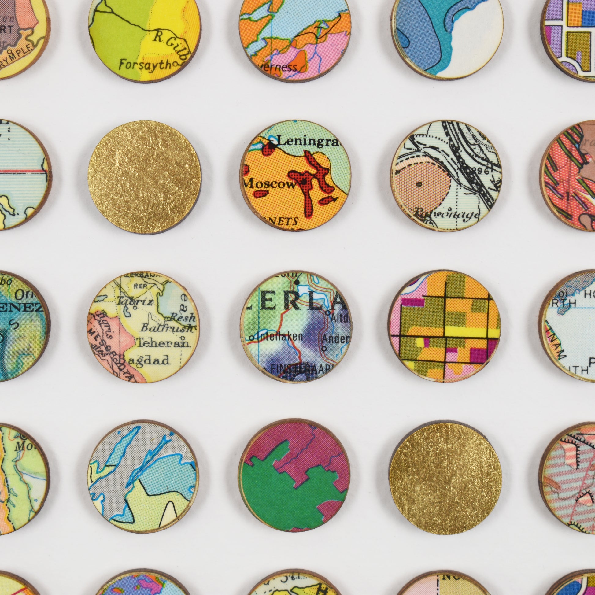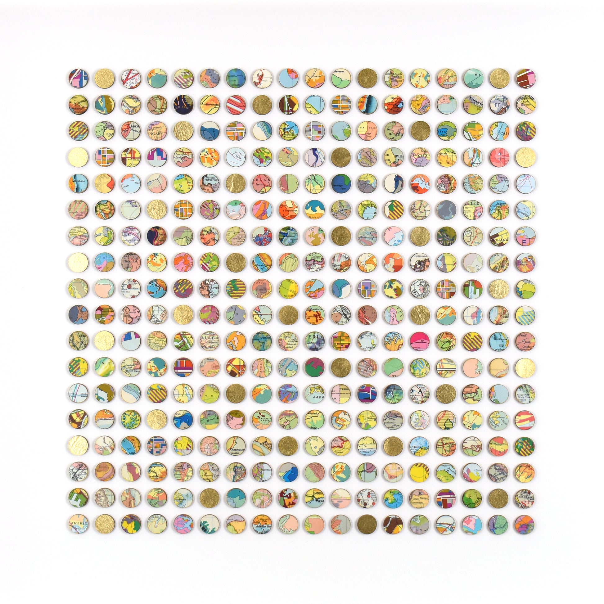 This art work comprises 324 1.6cm dots cut from birch wood panels and faced in vintage map featuring locations from all over the world. The composition is lifted with the occasional gold leaf dot.