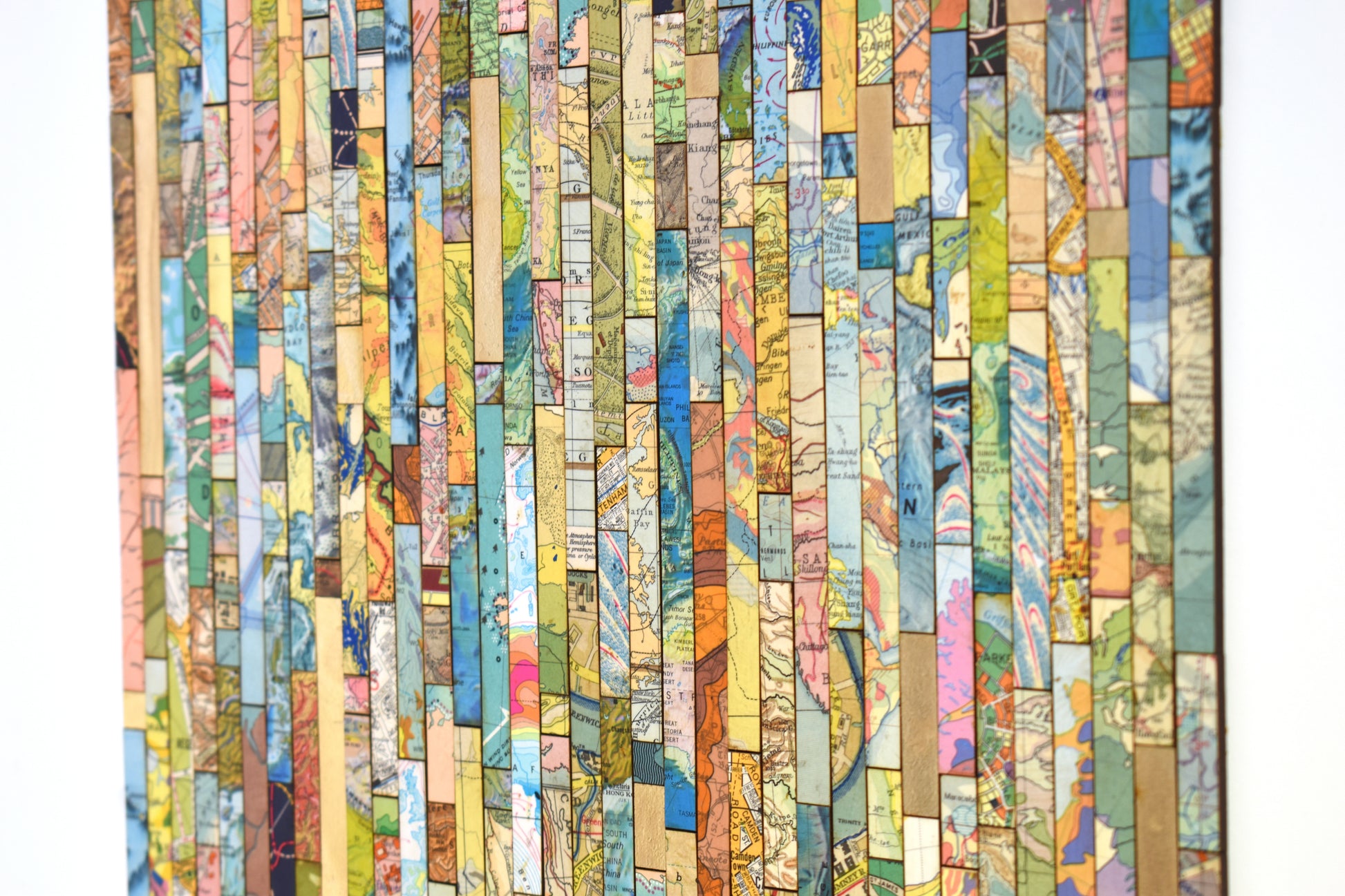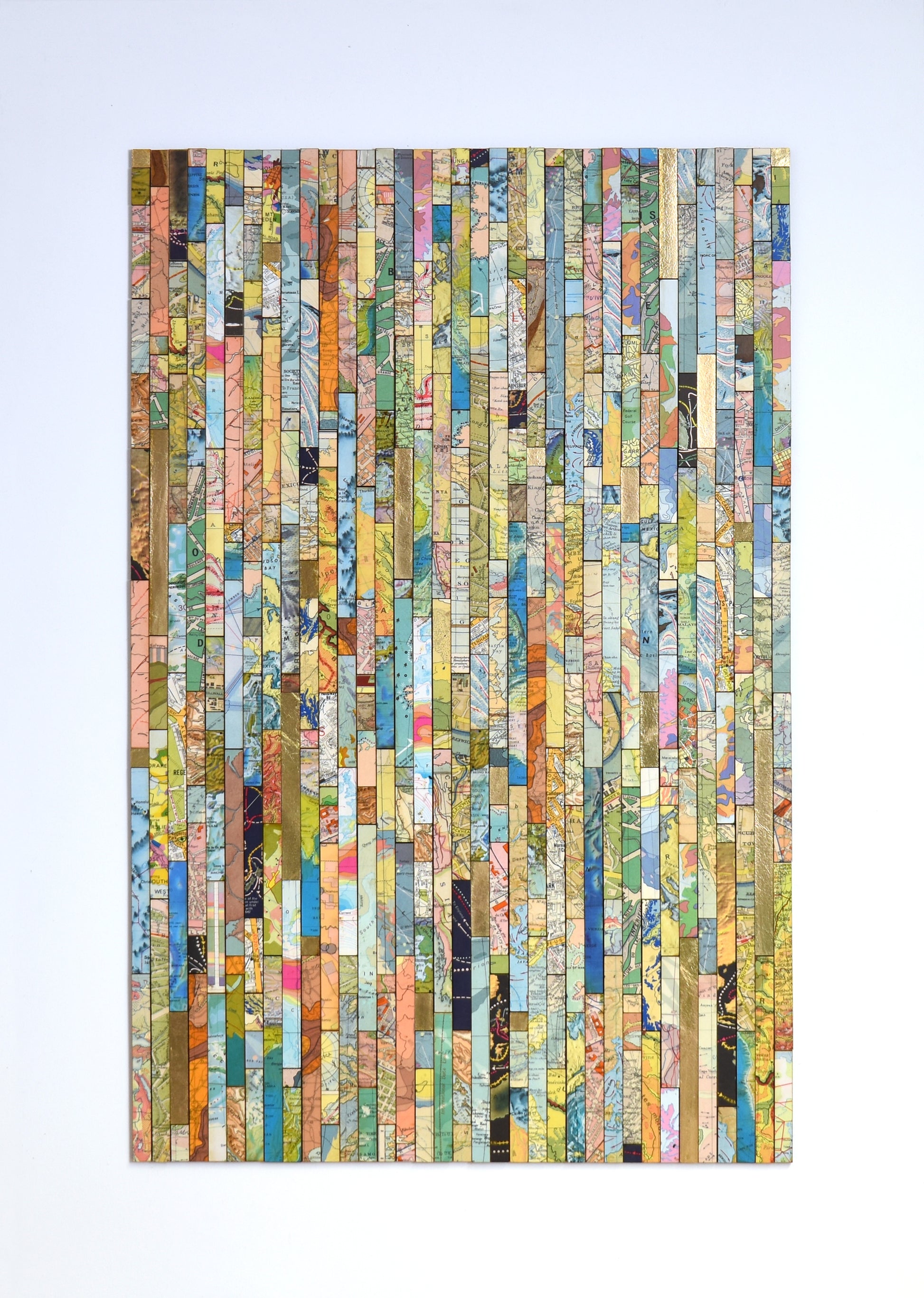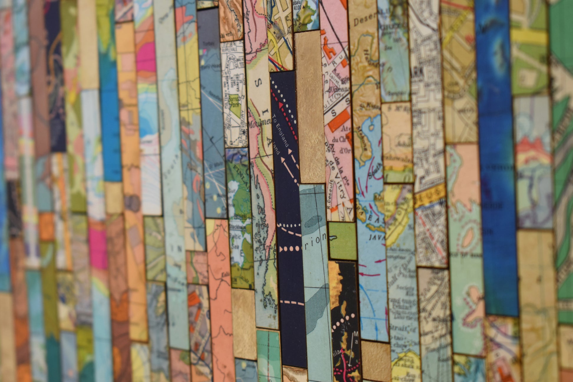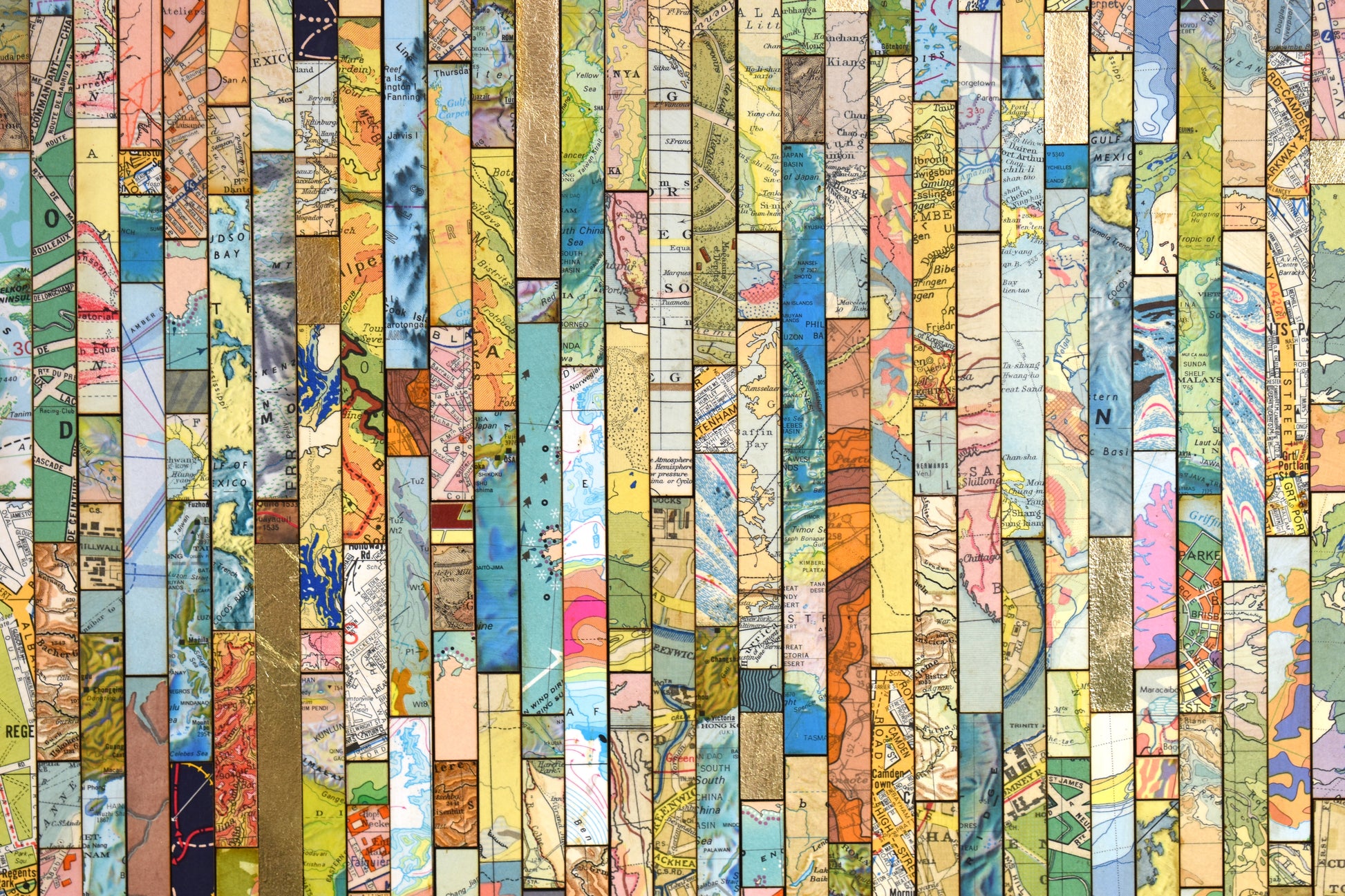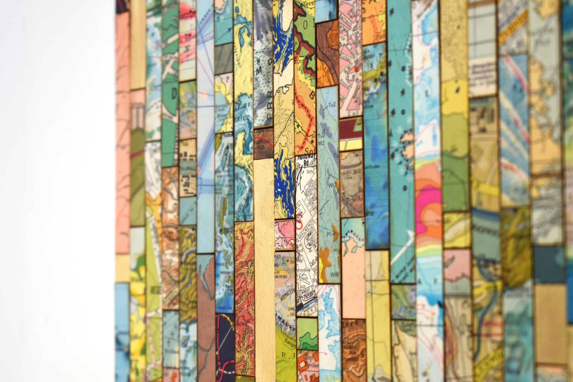 Each strip is cut from vintage and modern maps, some dating back over 150 years. These fragments hold shifting borders, renamed places, and changing territories. Through their juxtaposition, *Traces* asks what histories are visible, and which have been obscured or erased.