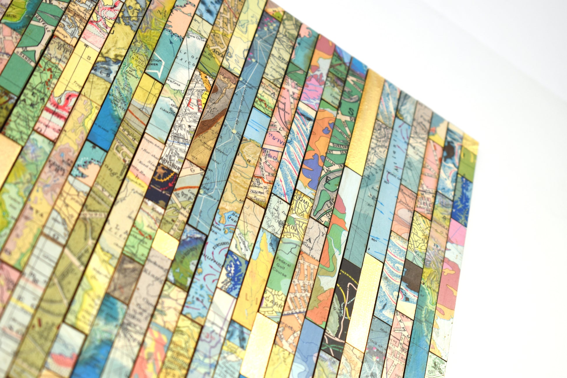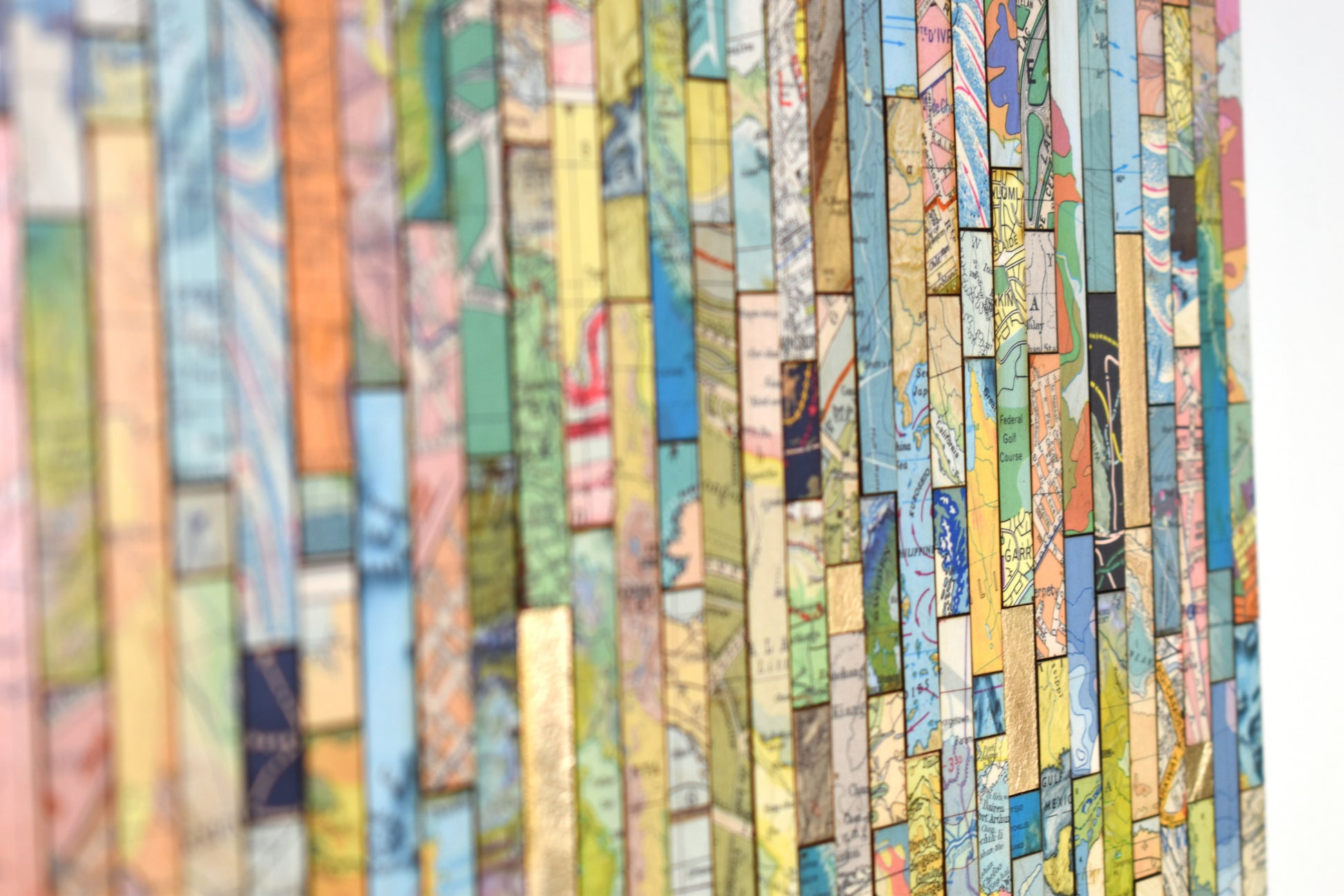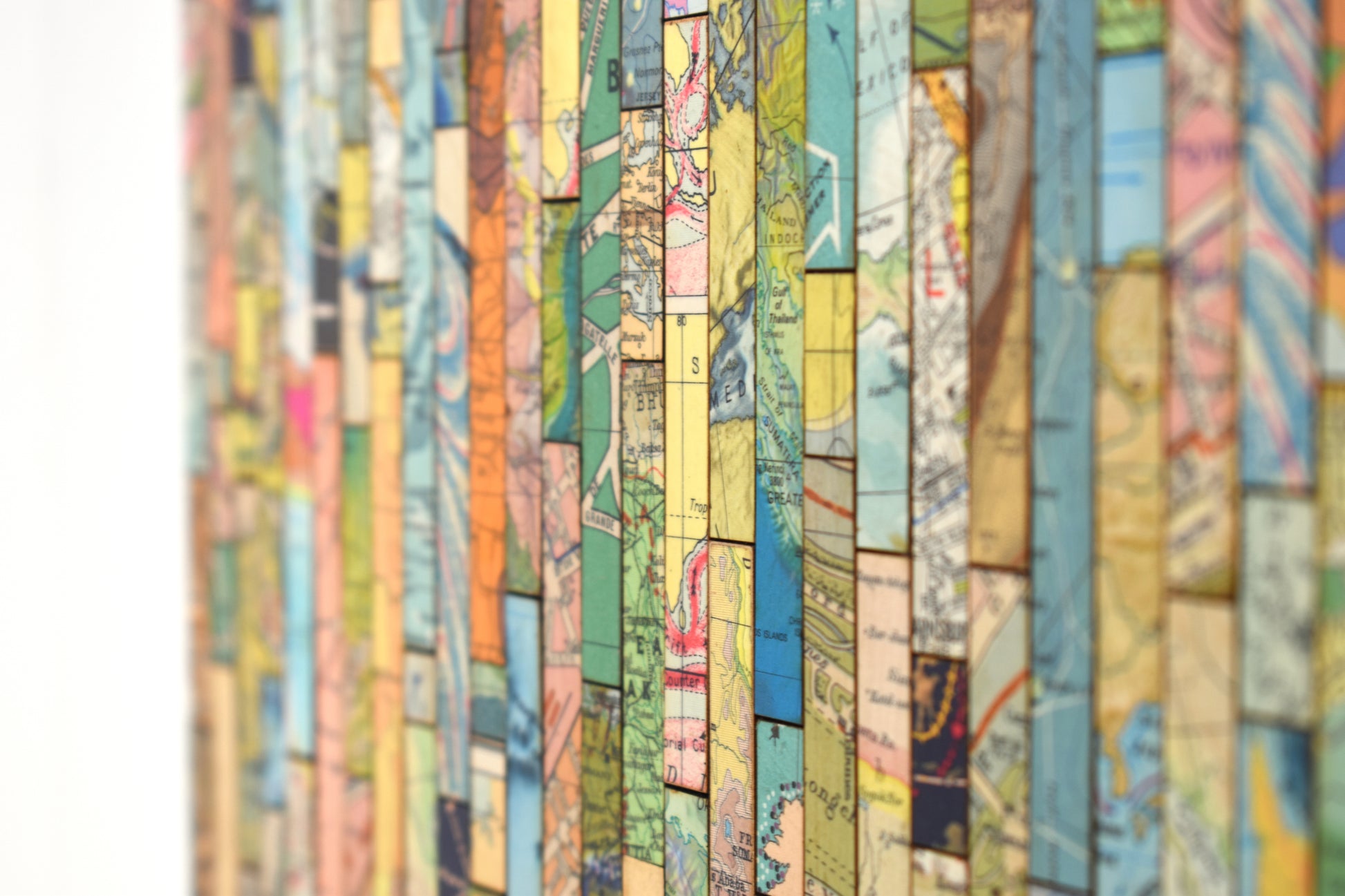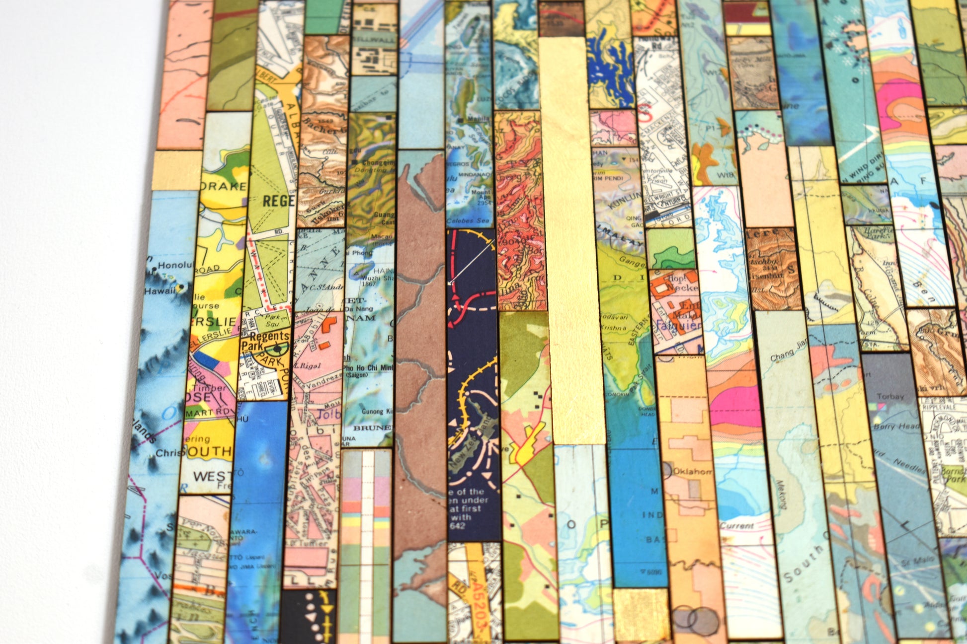 Each strip is cut from vintage and modern maps, some dating back over 150 years. These fragments hold shifting borders, renamed places, and changing territories. Through their juxtaposition, *Traces* asks what histories are visible, and which have been obscured or erased.