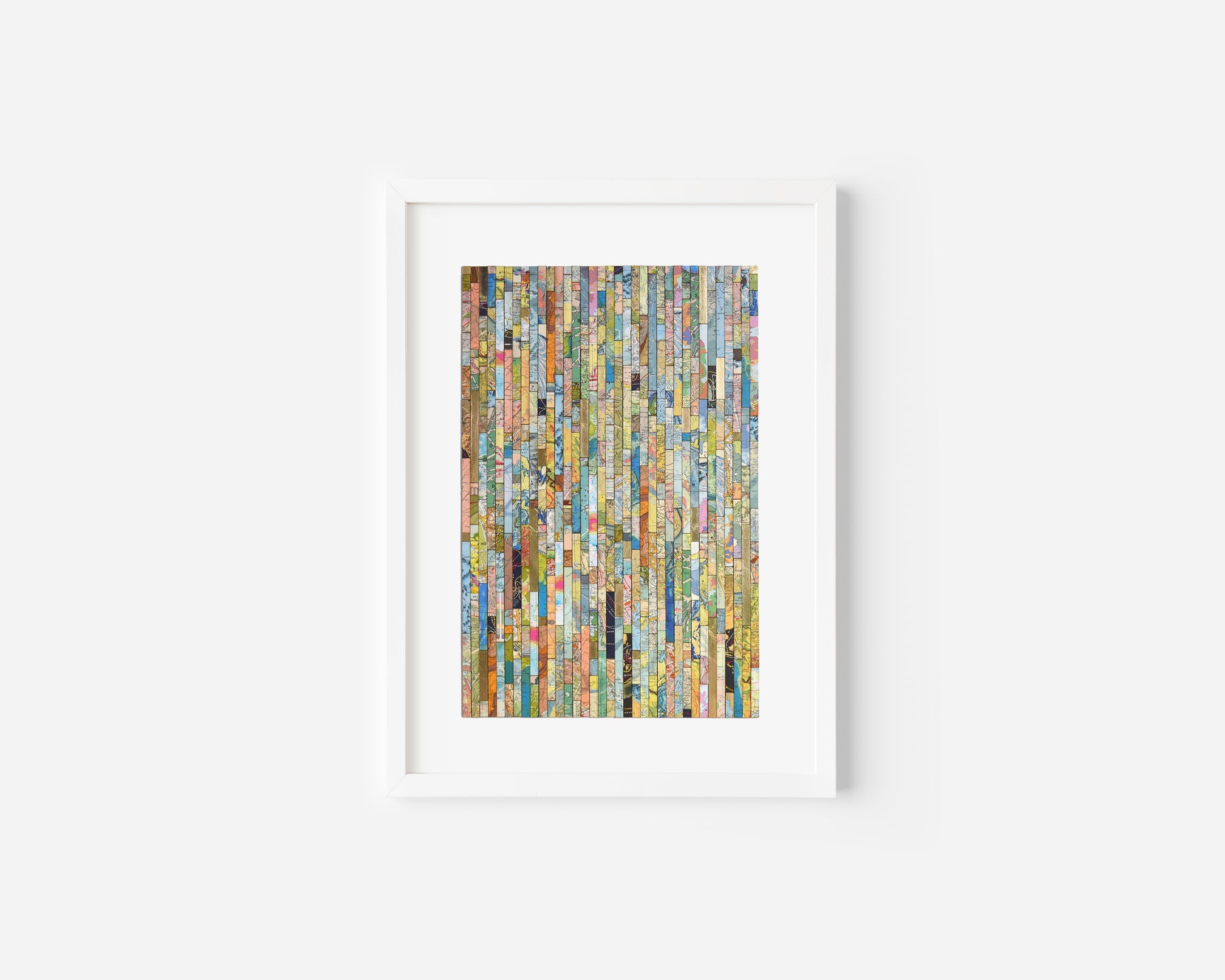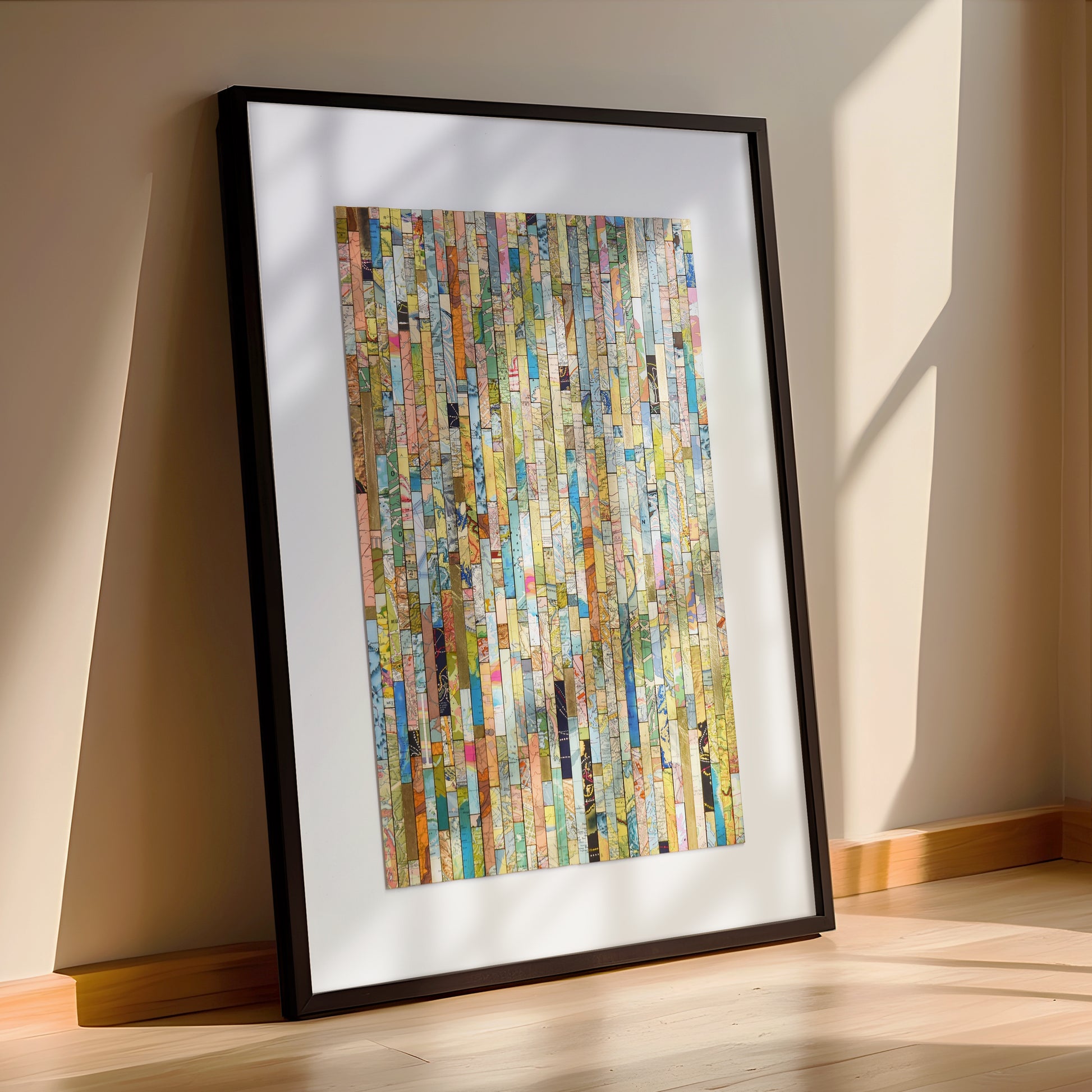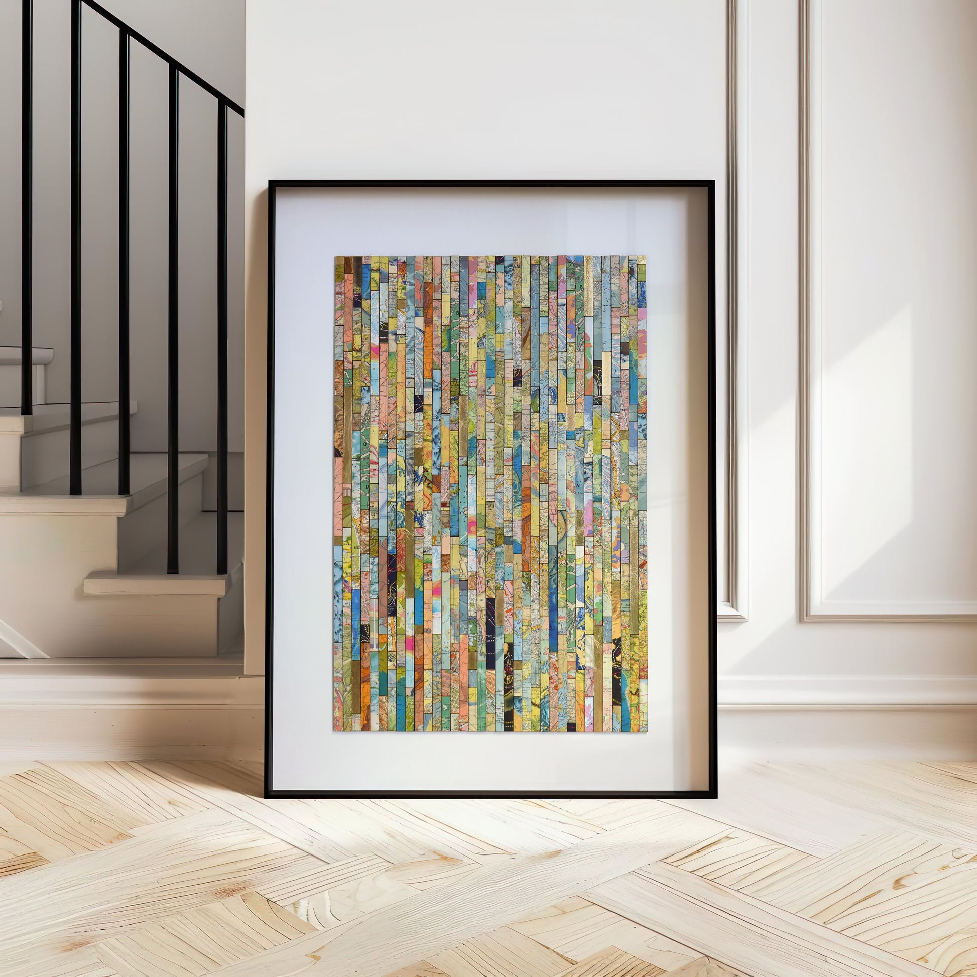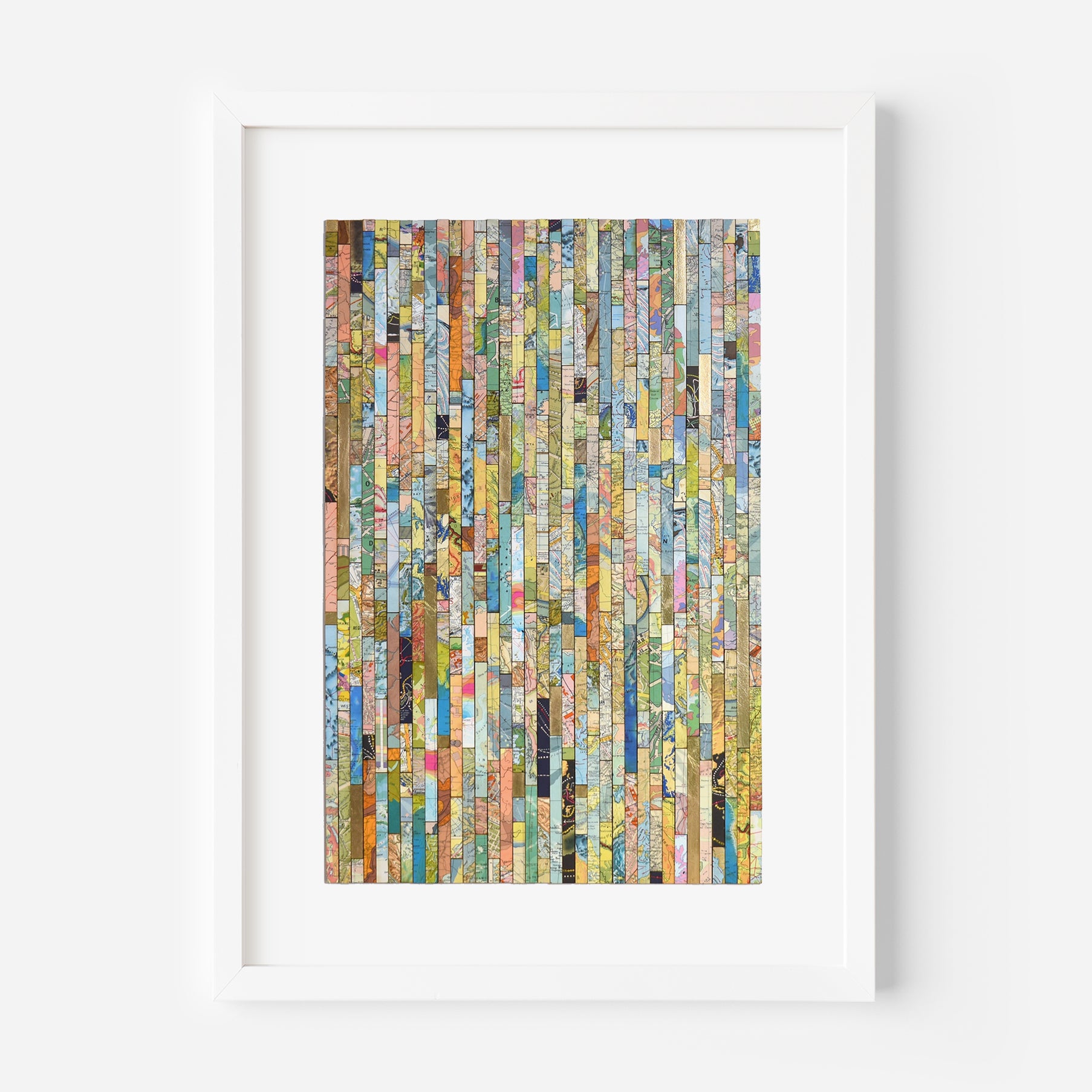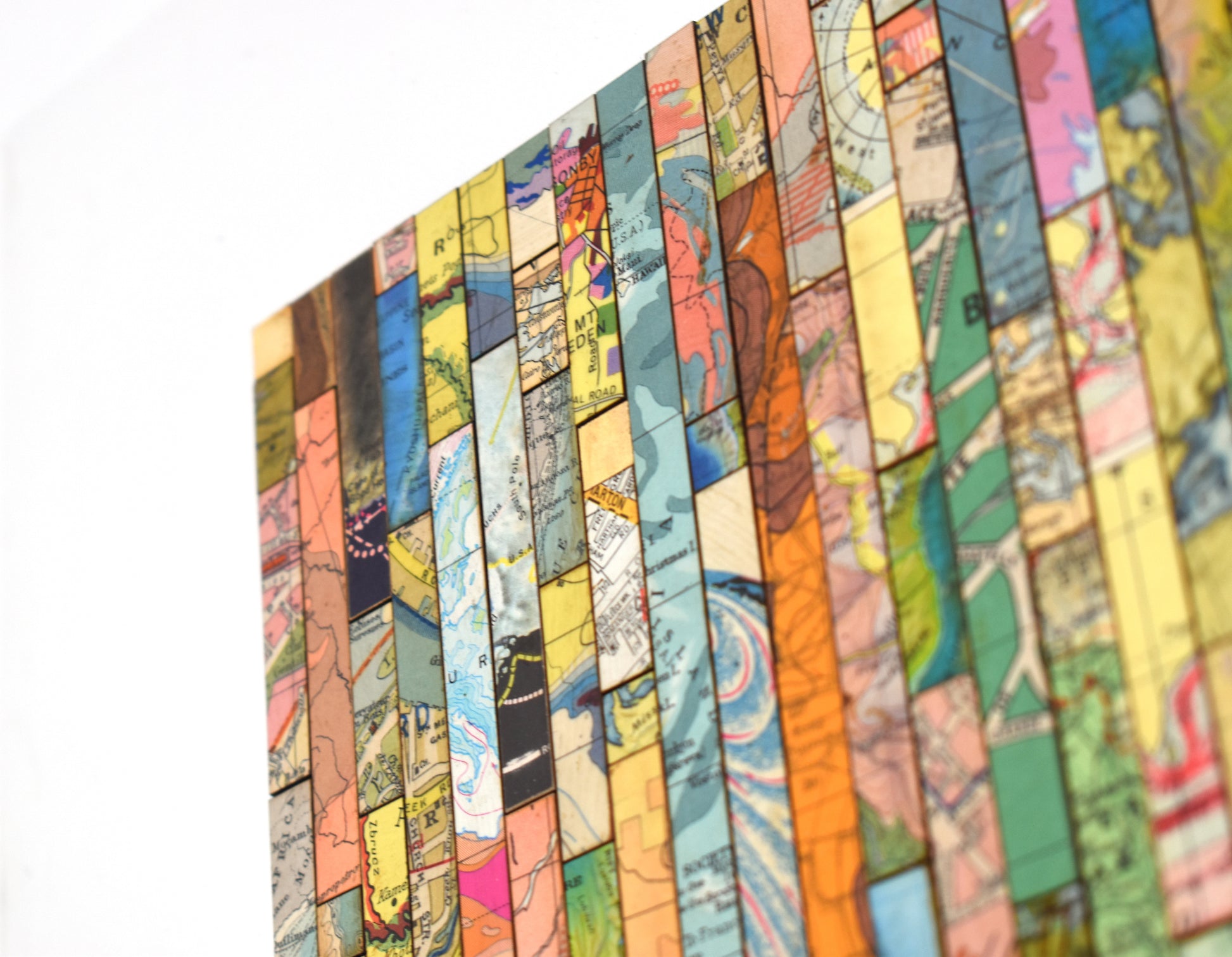 Each strip is cut from vintage and modern maps, some dating back over 150 years. These fragments hold shifting borders, renamed places, and changing territories. Through their juxtaposition, *Traces* asks what histories are visible, and which have been obscured or erased.