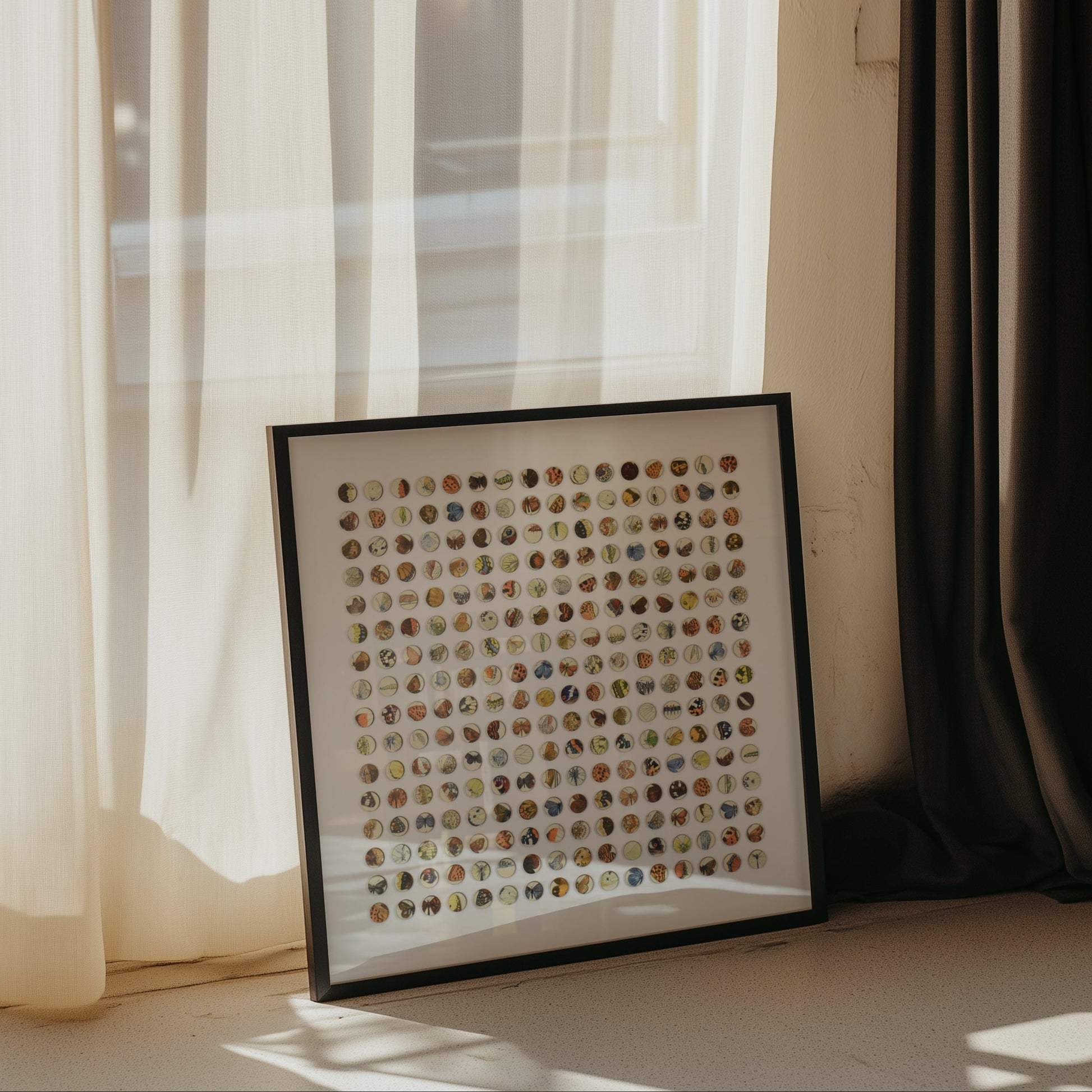 Geometric wall art comprising 256 16mm dots featuring illustrations of butterflies taken from vintage books. Birch wood panels are faced in the images and then cut into small circular pieces. Each dot is then selected for its detail to create the artwork.