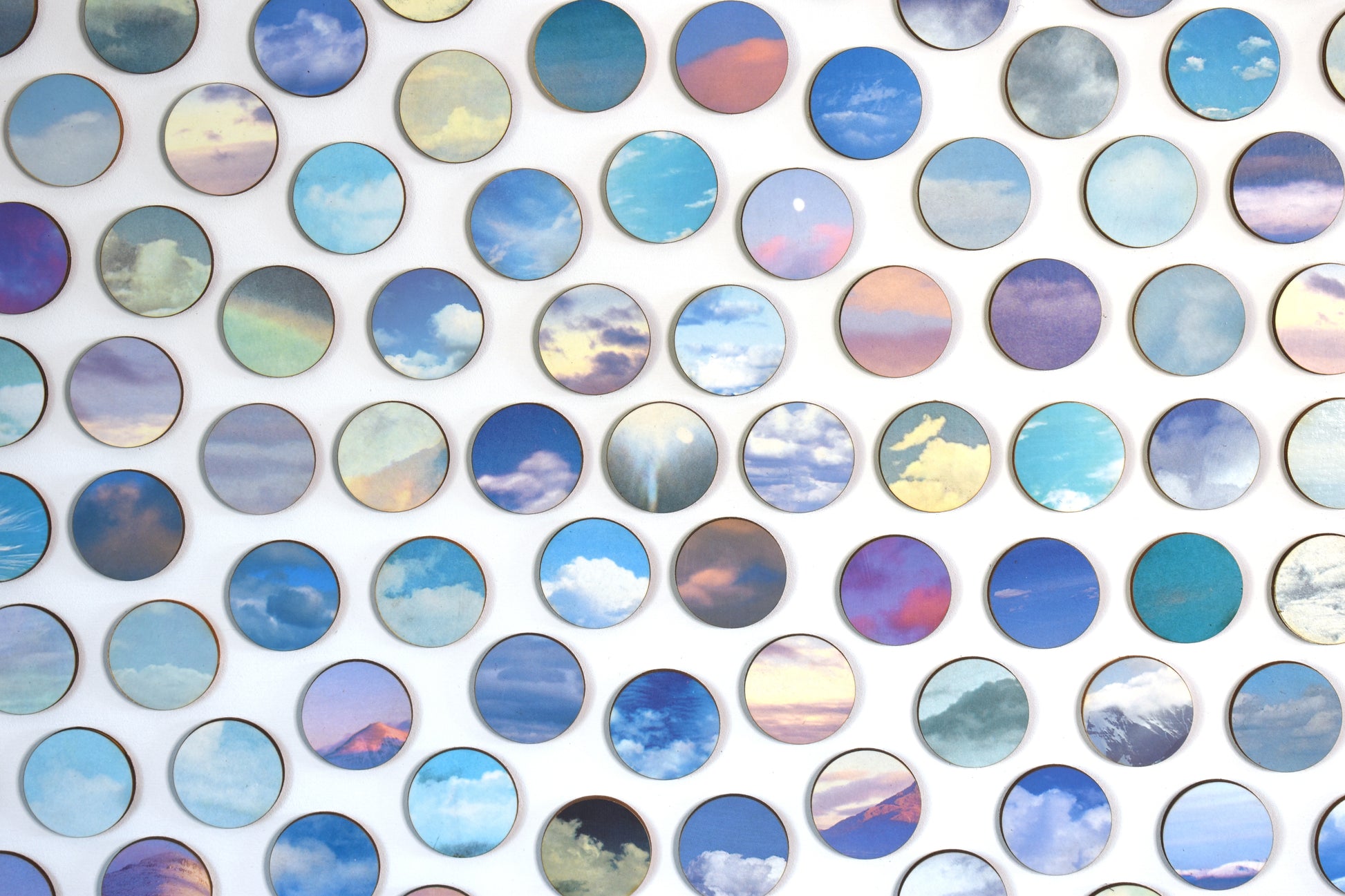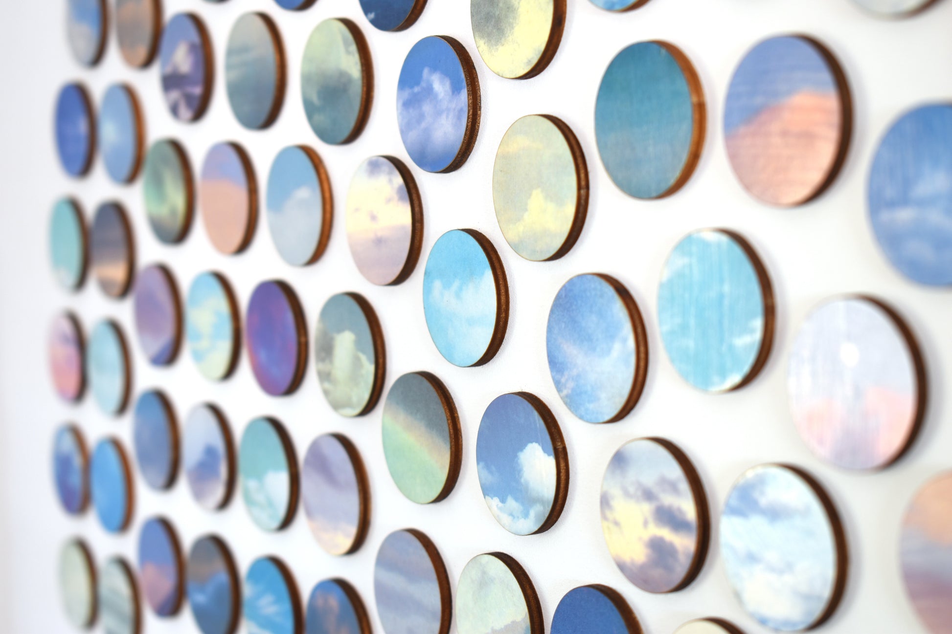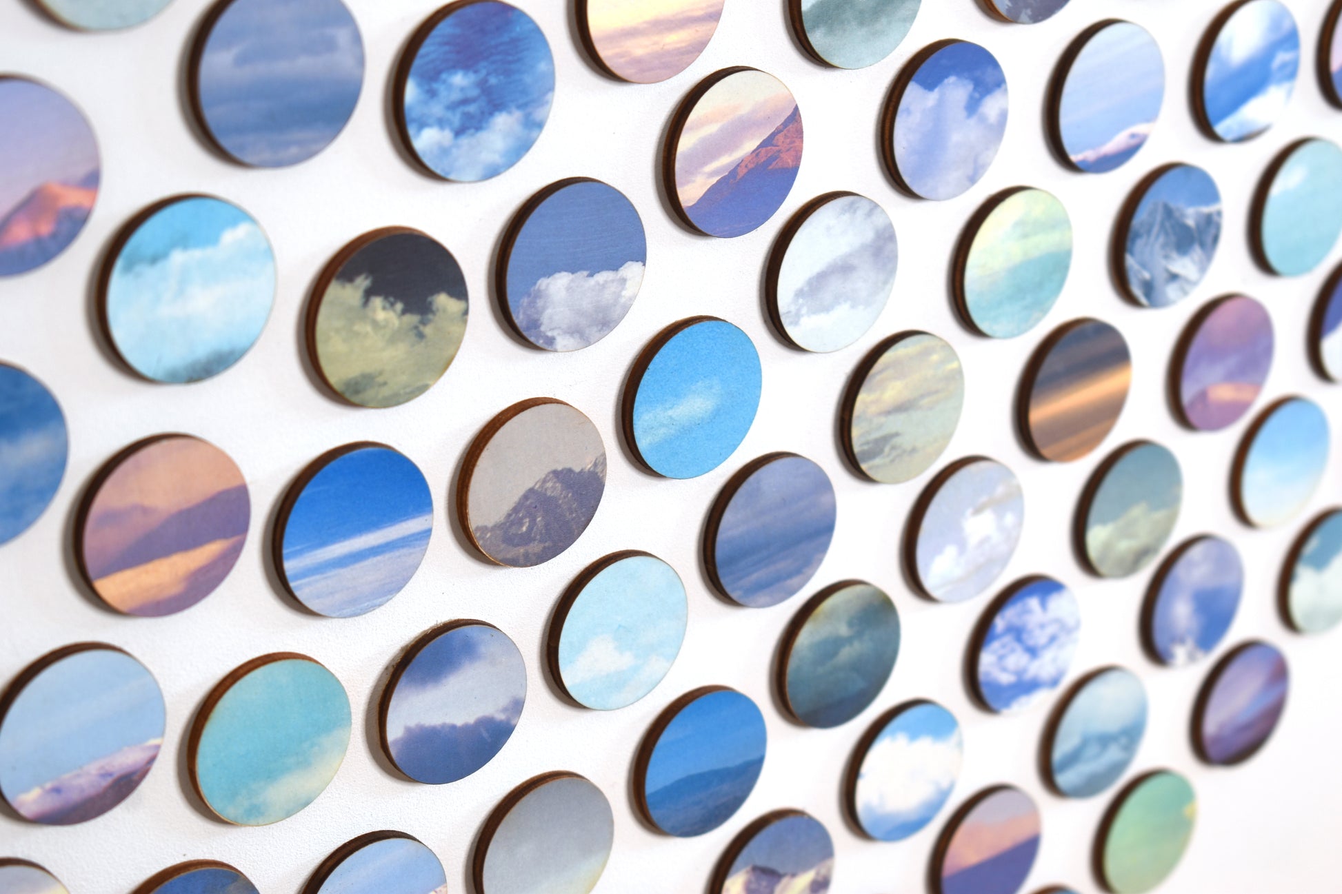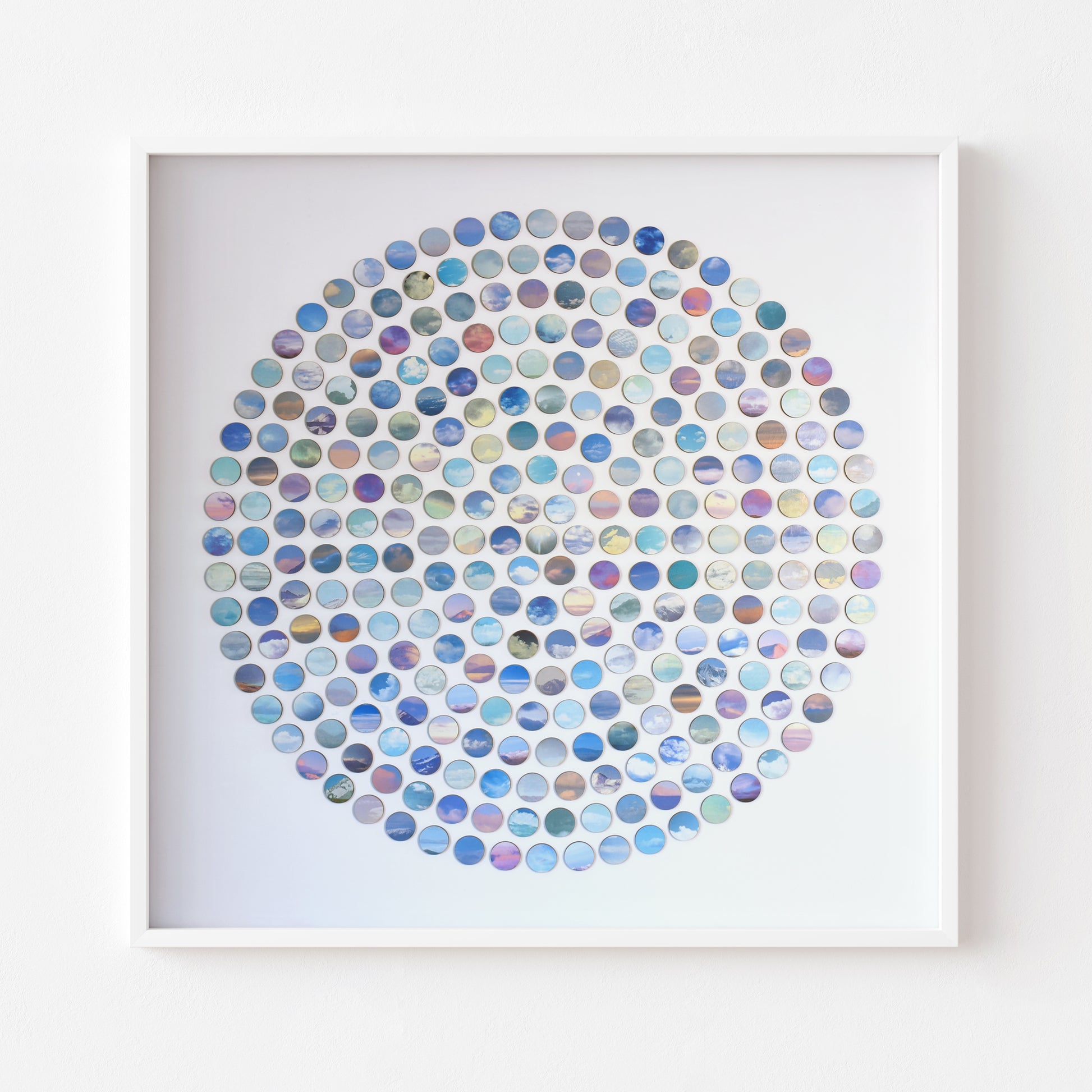 Vintage book cuttings bonded on to wood and cut into 3cm dots. Assembled into a geometric grid composition, sky and cloud dots interspersed with silver leaf dots.